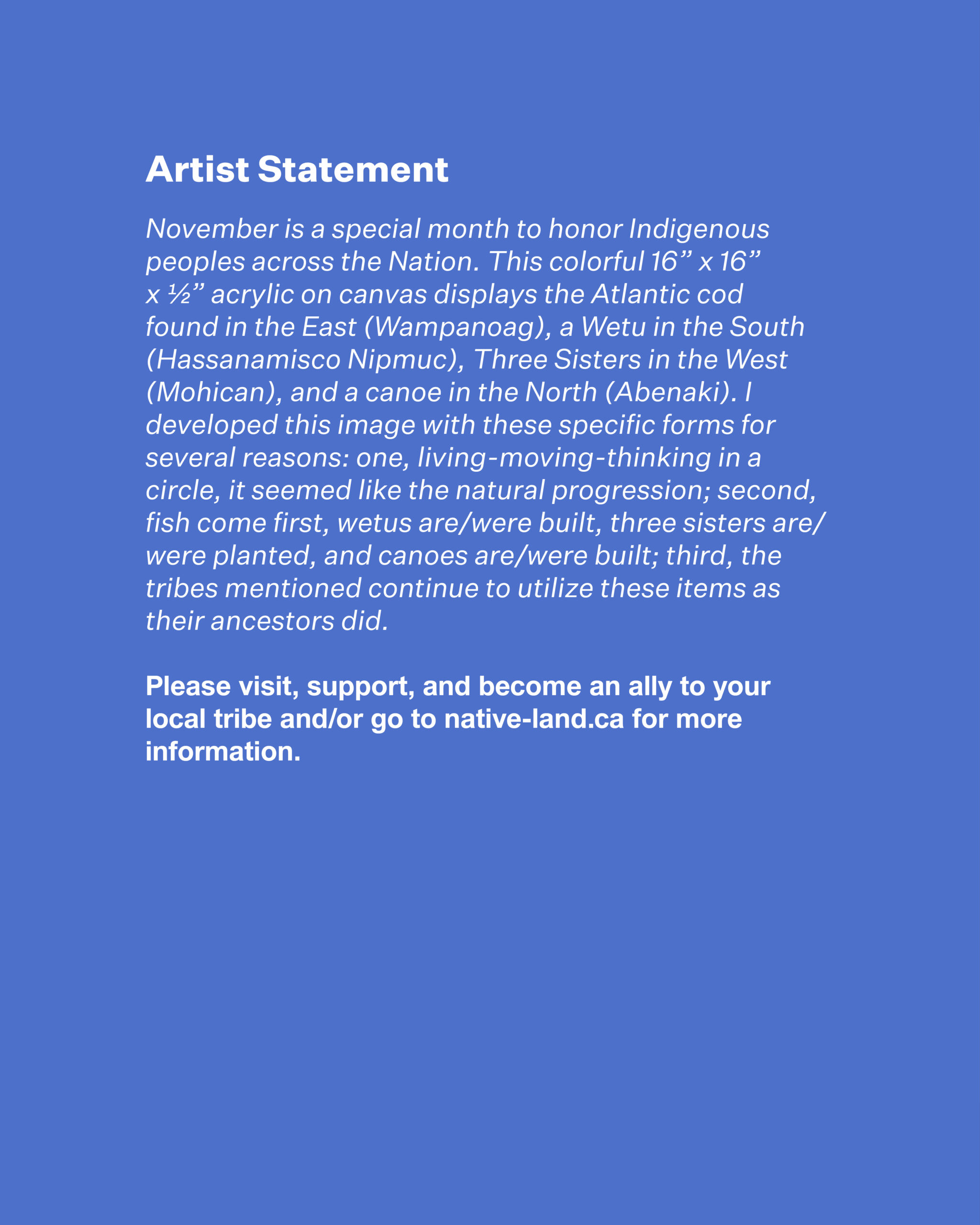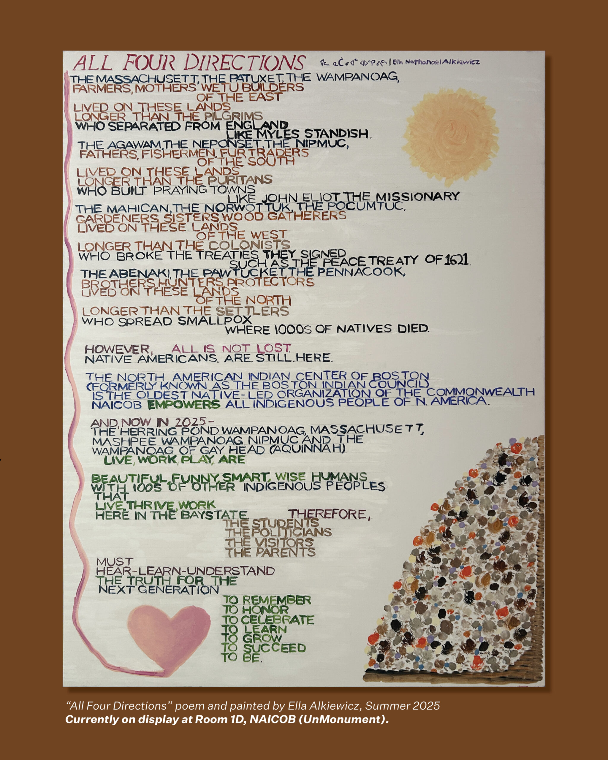 Ella’s vibrant piece honors the Indigenous peoples of our region — featuring an Atlantic cod for the Wampanoag in the East, a Wetu for the Hassanamisco Nipmuc in the South, Three Sisters for the Mohican in the West, and a canoe for the Abenaki in the North. Moving through the four directions, the work reminds us that everything is connected — land, water, sustenance, and spirit.