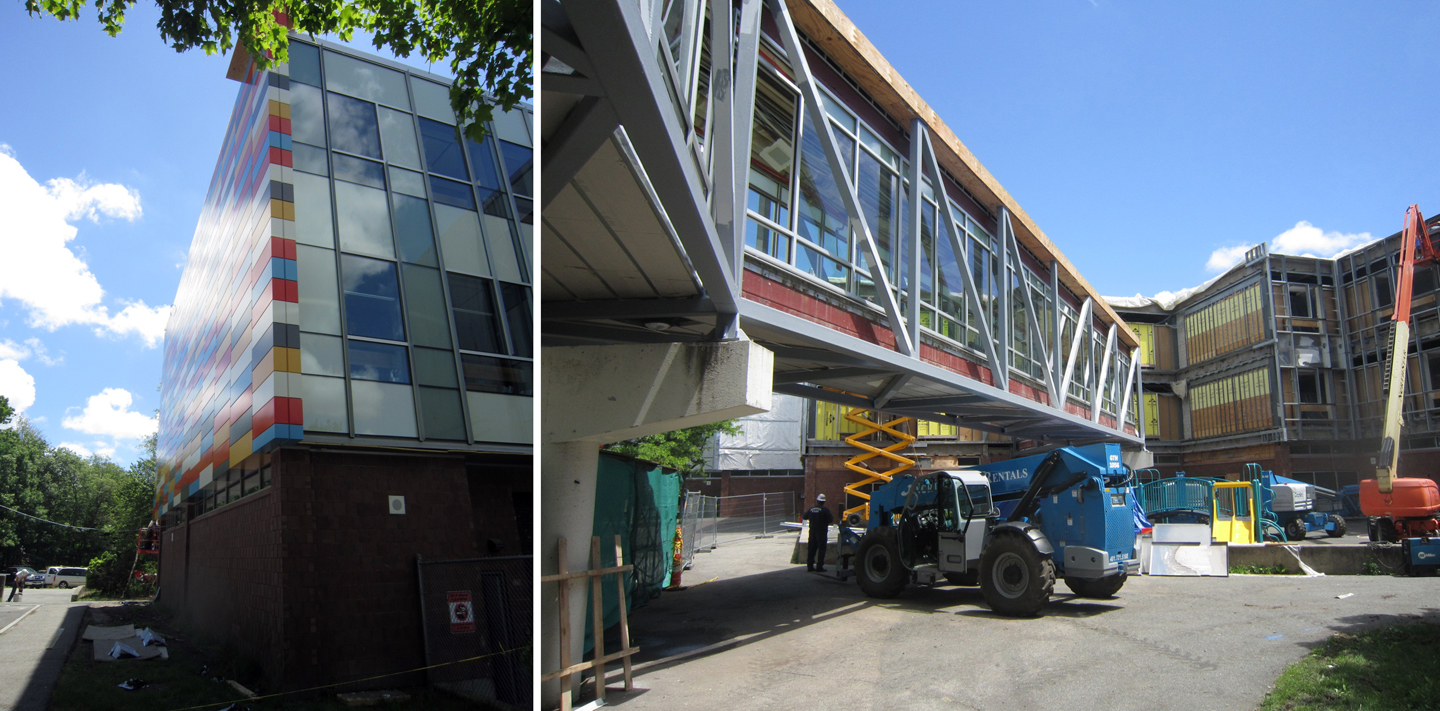 A bridge connects the school to a community center. We removed the existing walls of the bridge and replaced them with full-height glass and an expanded metal screen (yet to be installed), which will sharpen the sense of hovering above the playground.
