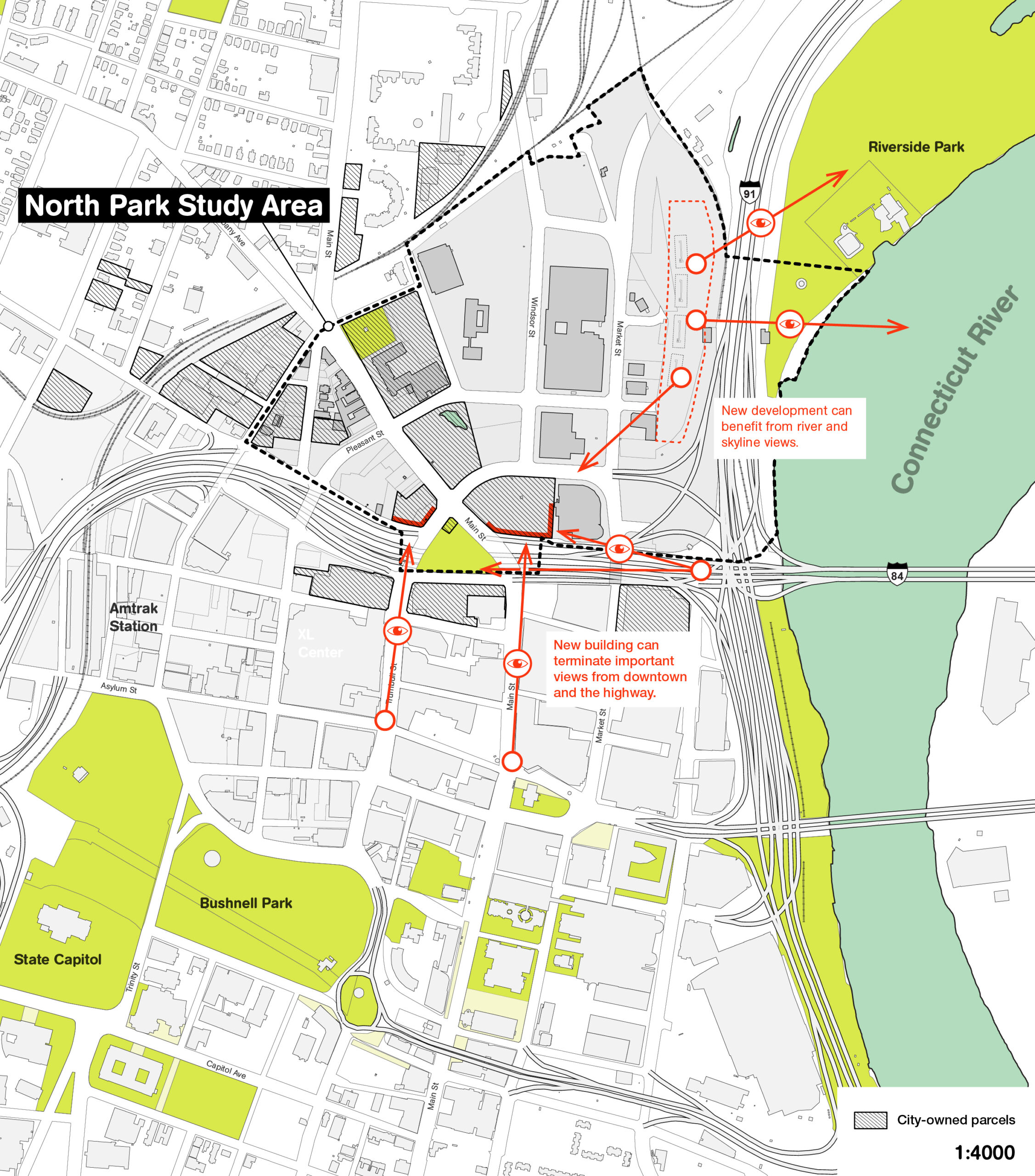 Utile has been selected by the City of Hartford Department of Development Services to develop a comprehensive redevelopment plan for Hartford North Park, a 123-acre section of Hartford that lies directly north of and adjacent to Downtown. The project area was cut off from the Downtown and the surrounding neighborhoods in the mid-1960s by the creation of the eight-lane I-84 to the south and I-91 to the east, which separates the area from the Connecticut River.