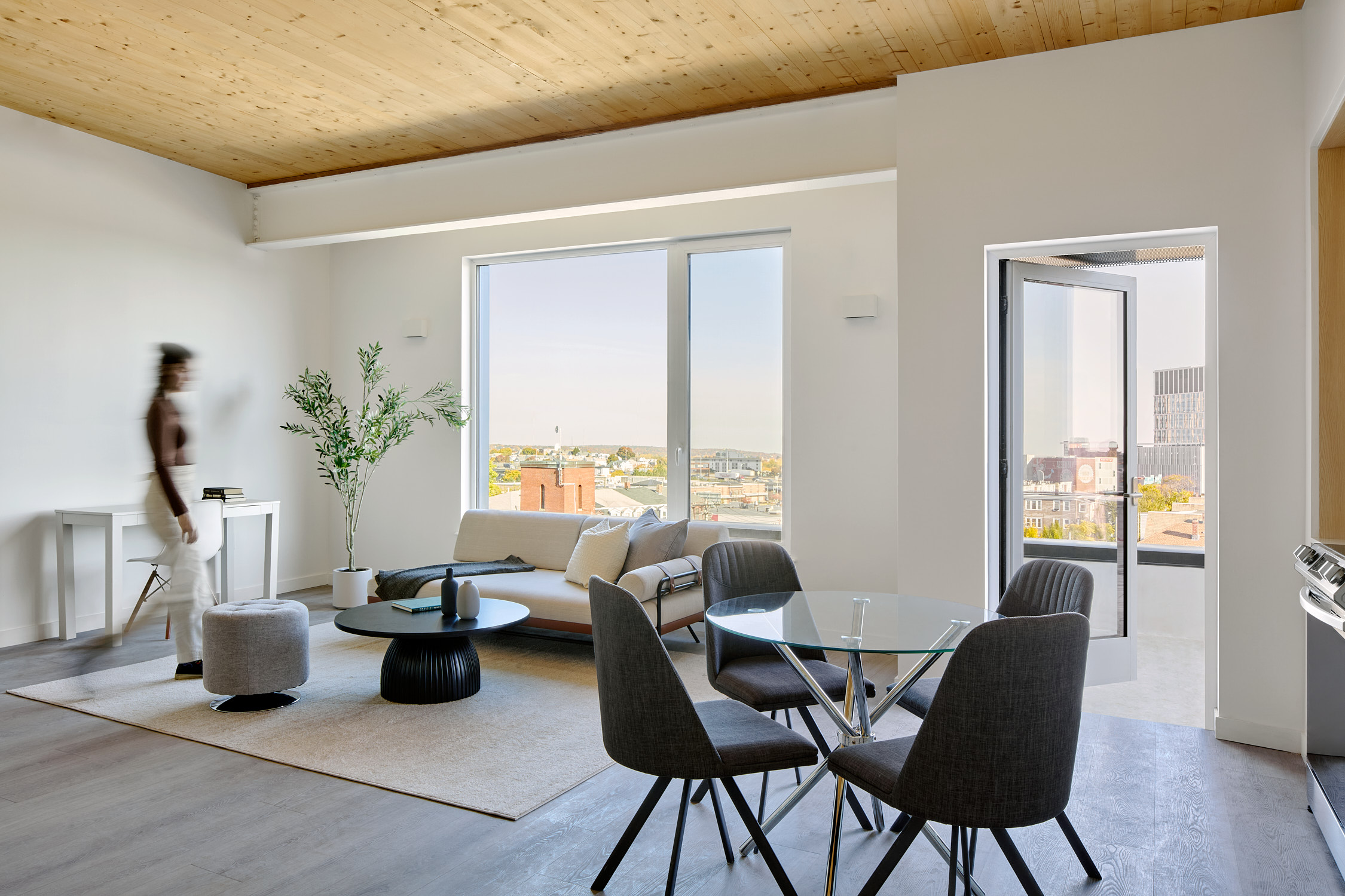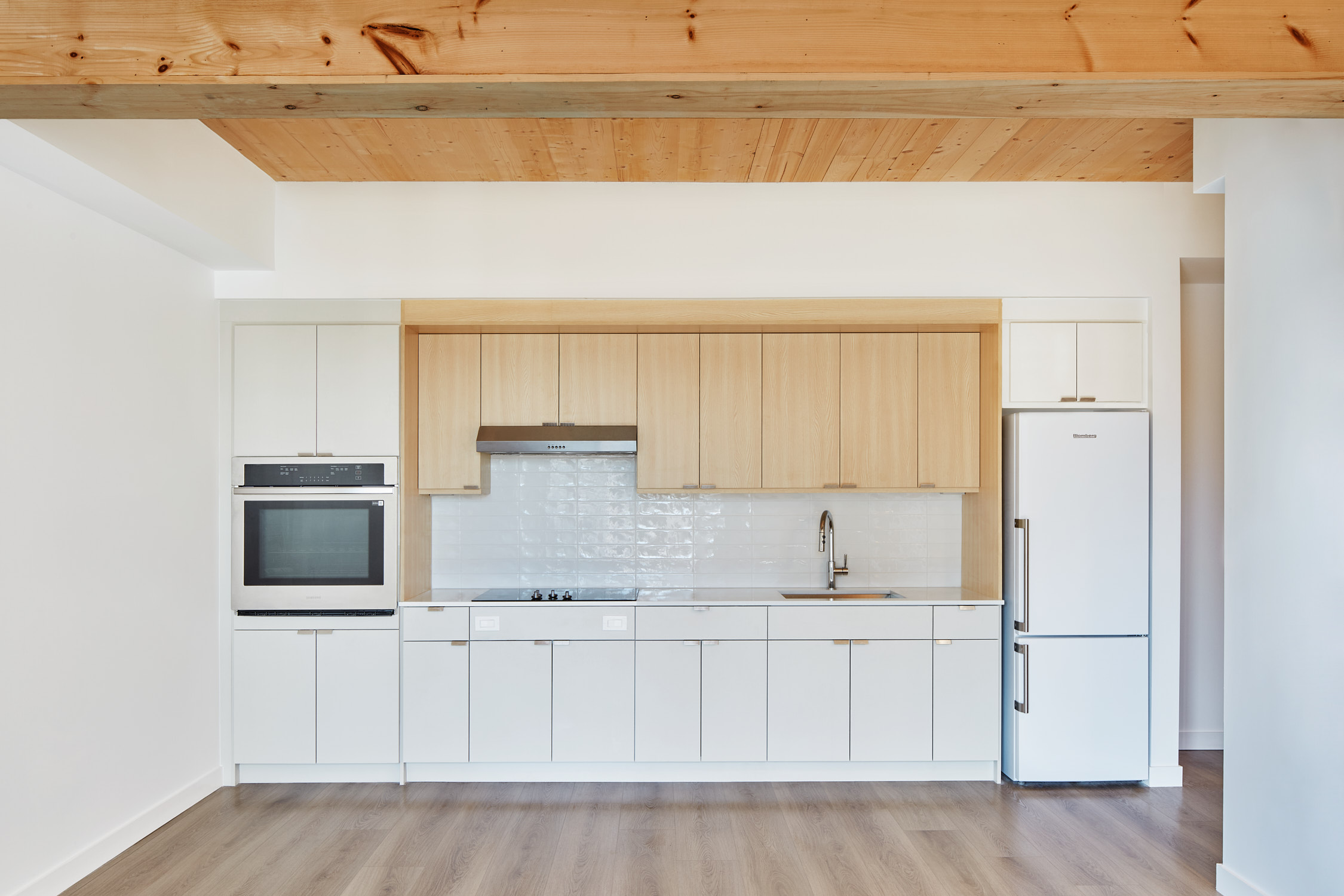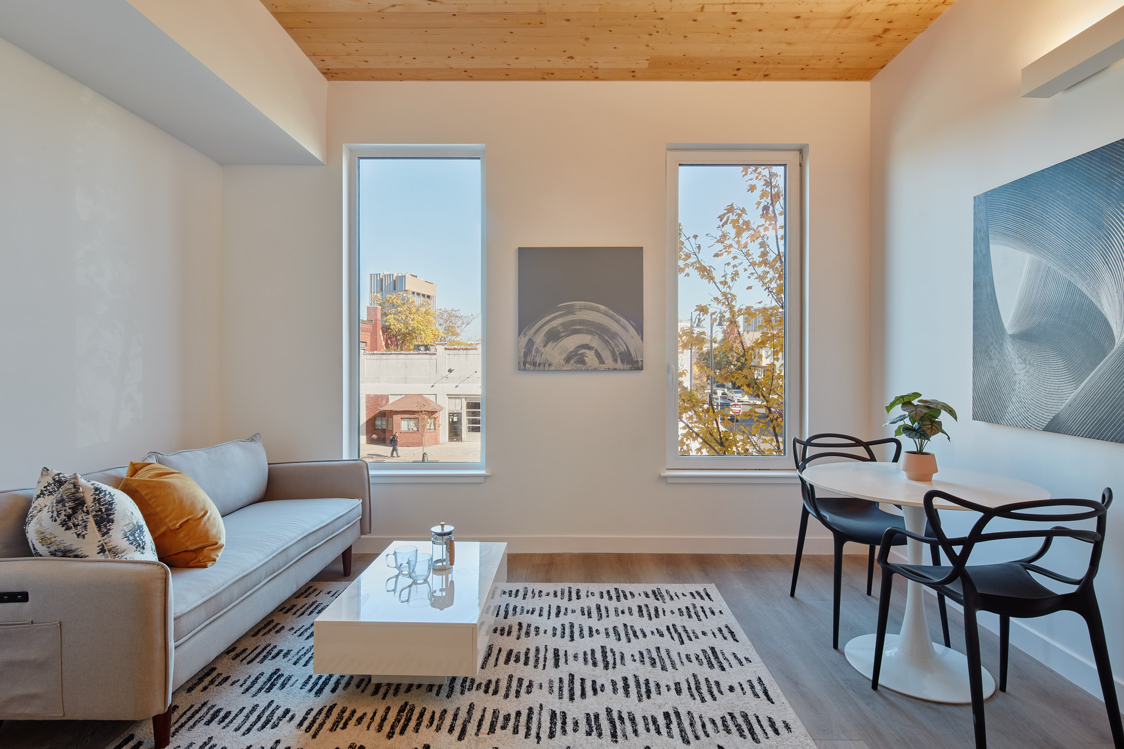 The façade design is inspired by the vibrant textures, colors, and scale of materials observed throughout the neighborhood, and along Broadway. The ground floor is populated with active retail frontage and residential lobby space, with storefront windows throughout to create a visual connection between ground floor uses and the public realm. The height of the ground floor aligns with a key datum on the building just to our north for street front continuity. The upper floors of the building are clad in a mosaic of rainscreen siding, which reduces the massing by means of relief, shadow, and color variation. The front façade takes advantage of the depth of the windows for both shading and play of light throughout the day. The massing of the set-back at the fifth floor recalls pitched roofs from the residential neighborhood, reinterpreted in a contemporary composition.