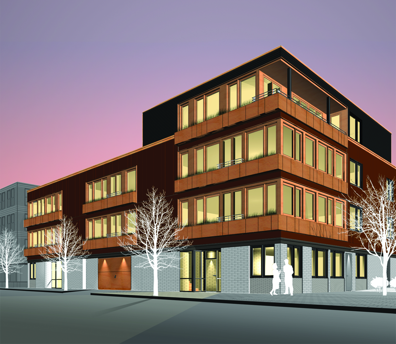 321 West Second Street is a 15-unit condominium building located in South Boston on the boundary between the traditional working class residential neighborhood and an industrial area. David Neilson developed the conceptual building plans and unit types, which Utile refined in collaboration with David after the schematic design phase. The building has structured parking on the first floor and multiple entry lobbies located on both West Second Street and Bolton Street that serve the units above. A point-loaded circulation strategy was used to eliminate all common corridors at the upper levels and maximize living areas within the units. Above the parking, three levels of units are organized around a central courtyard. The organizing element on the facades of the building is a continuous wood planter box which sits below a ribbon of windows that define the living and dining areas of each unit. Double doors which open up to West Second Street allow residents to access the planters as well as open up their living rooms to the street.
