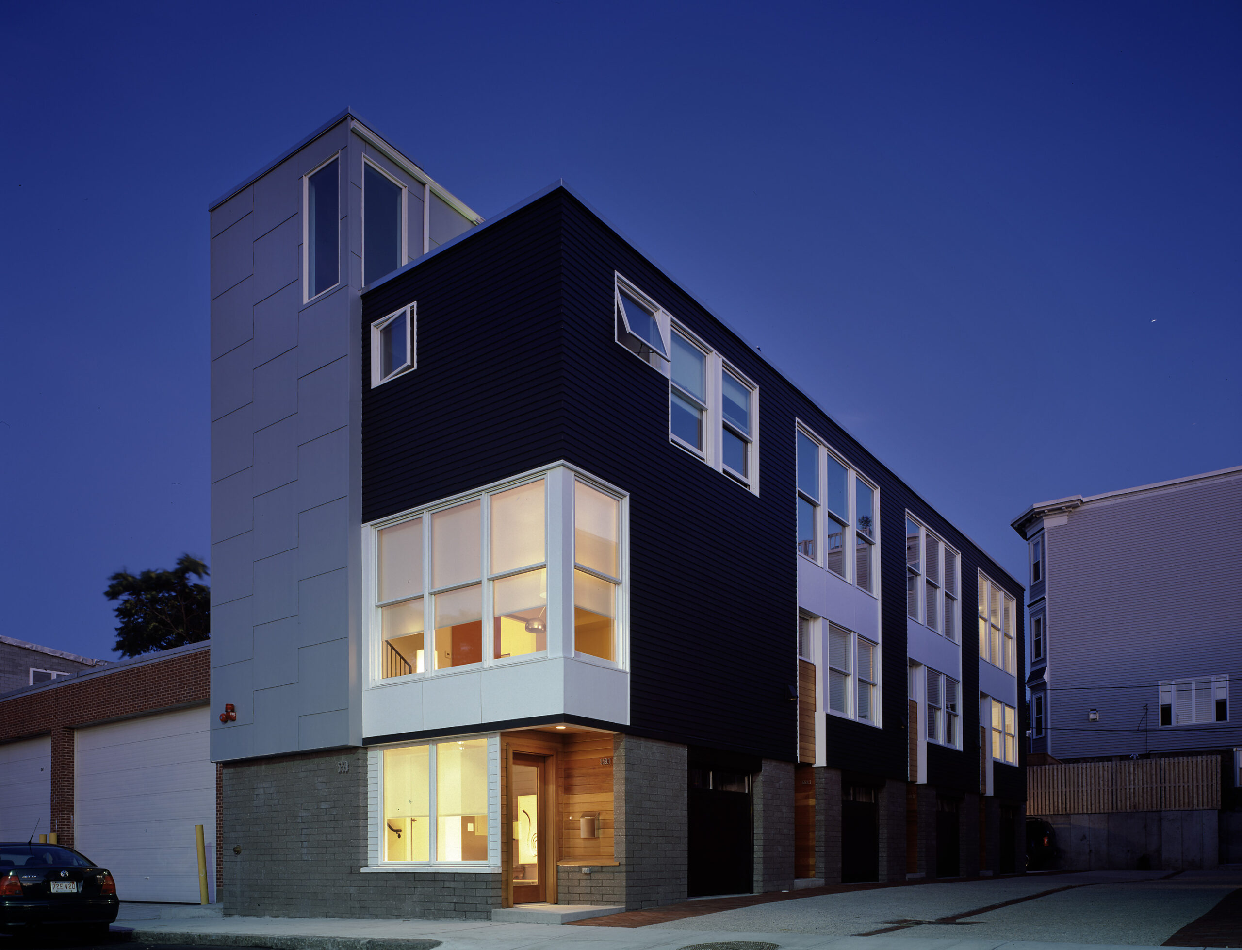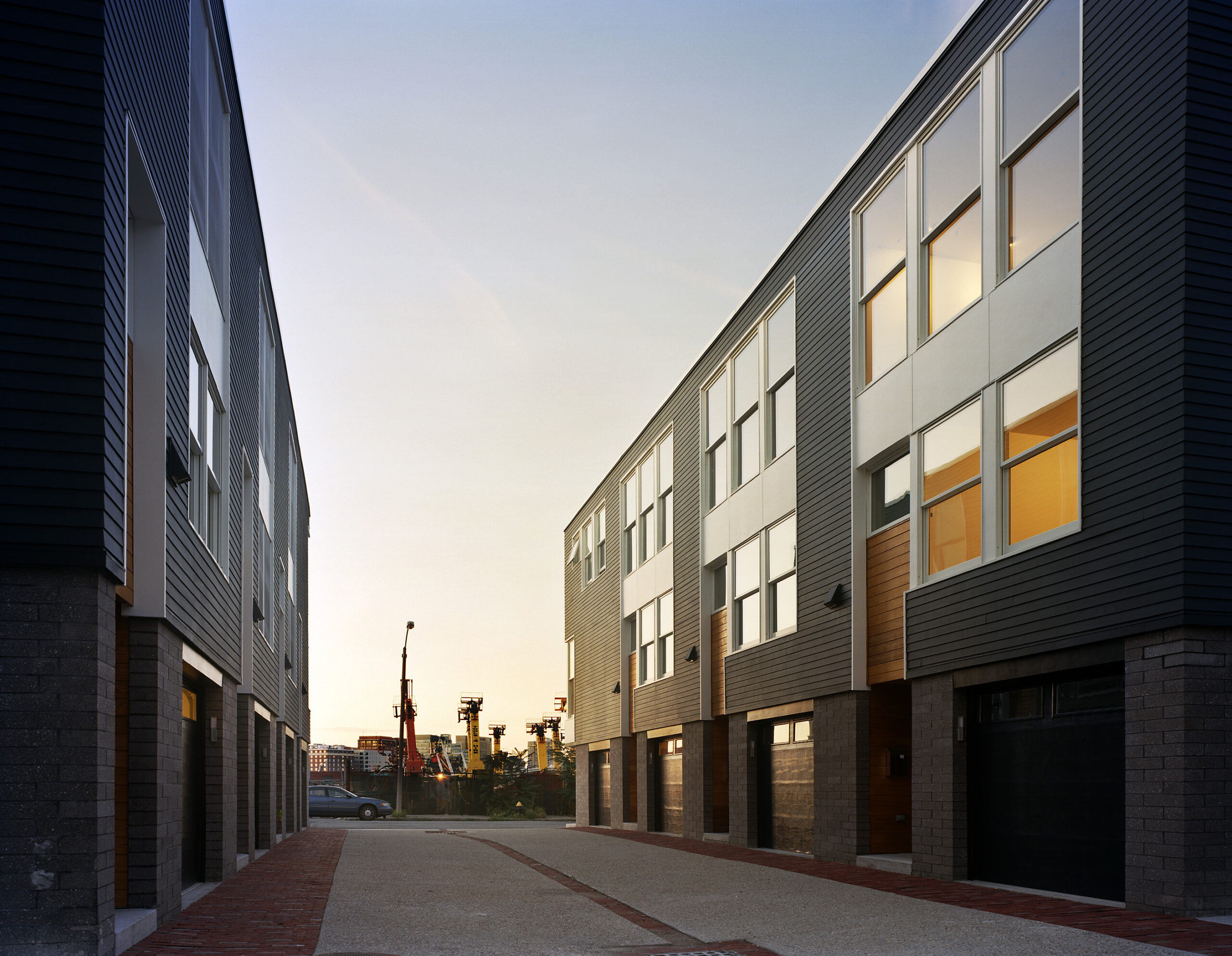 557β559 East Second Street is a development of eight new single-family row houses constructed on a site that lies between residential South Boston and the developing industrial waterfront. The units are arranged around a central court that serves both pedestrians and automobiles. Above the ground-floor entry and garage, the section diagram of a row house has been inverted – the living spaces are placed on the top floor to take advantage of views to the seaport and downtown. Given site constraints and market considerations, two distinct unit types were developed to accommodate a variety of lifestyles. In the four units at 557, the third-floor main living space is completely open, extending to a west facing porch. In contrast, the four units at 559 are one-story taller, with a penthouse-level study opening directly to a roof terrace. The development also includes the adaptive re-use of an existing light industrial building into commercial condominiums at 555 East Second Street.
