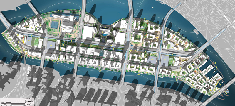 These guidelines ensure that buildings are situated on a low-rise podium, establishing a protected pedestrian network of public spaces. Tower setbacks and orientation constraints create a predominate east-west axis to the island, protecting buildings and public spaces from north-south exposure, and maintaining cross breezes for natural ventilation. The team explored facade and screening typologies for each tower in order to create a coherent language among the buildings, while minimizing solar gain in accordance with local sustainability principles.
