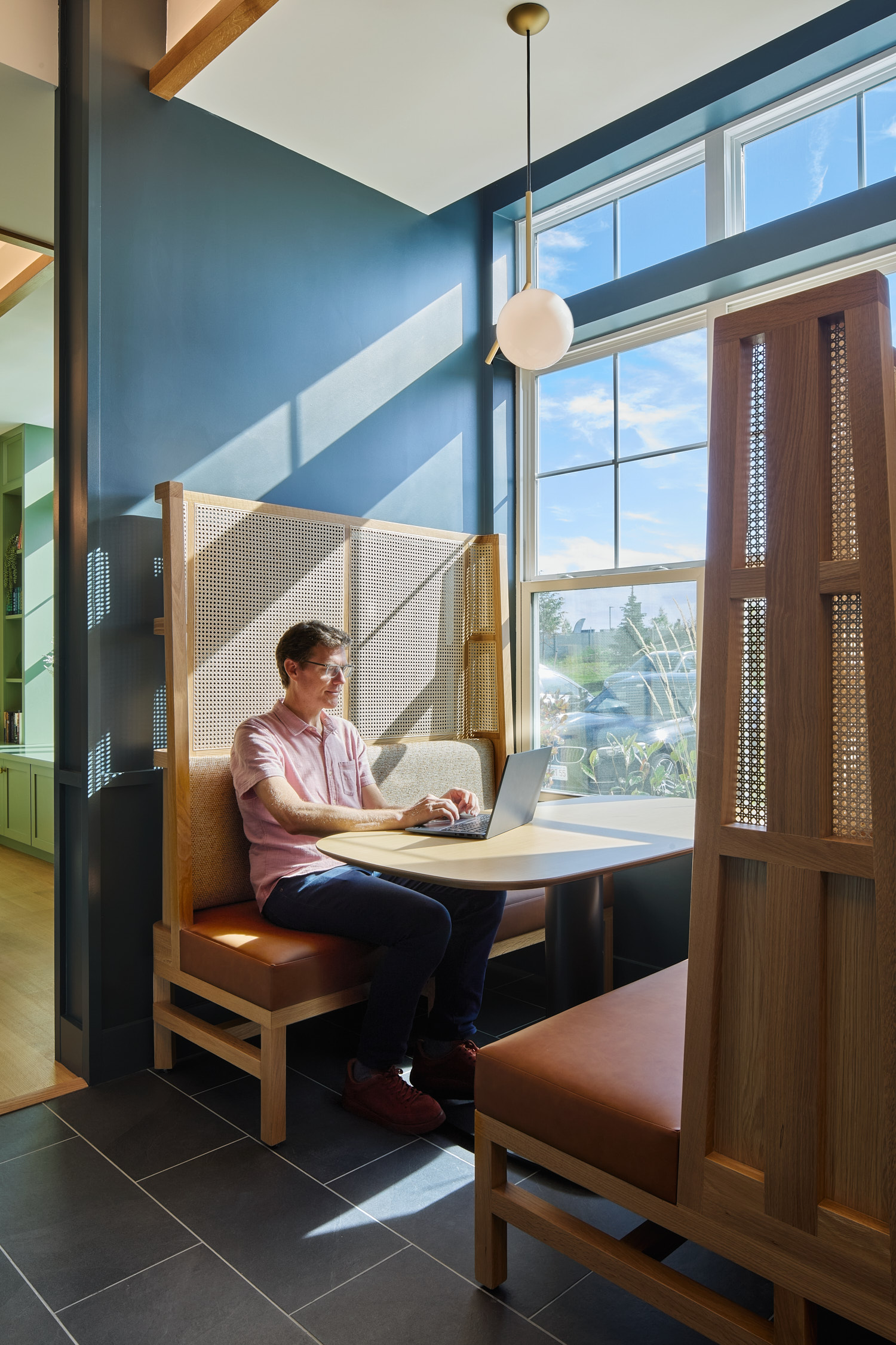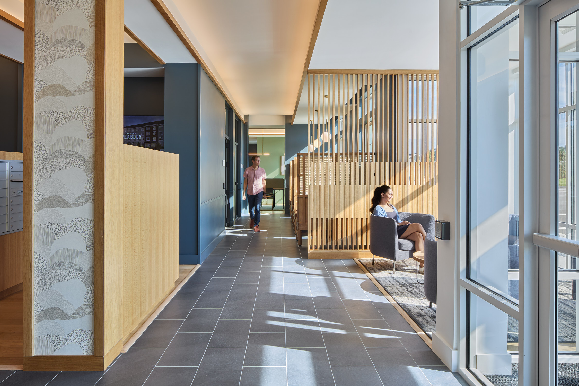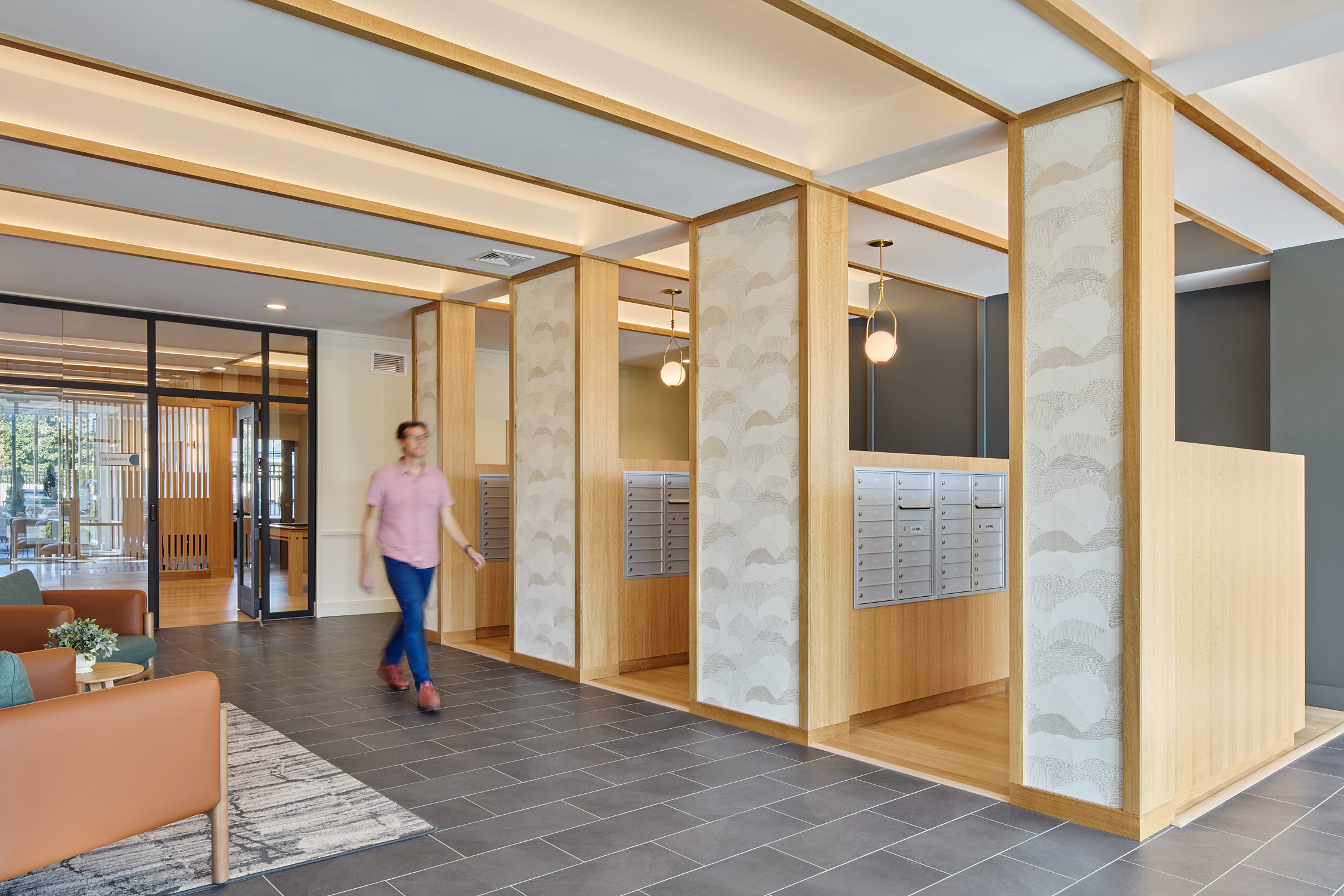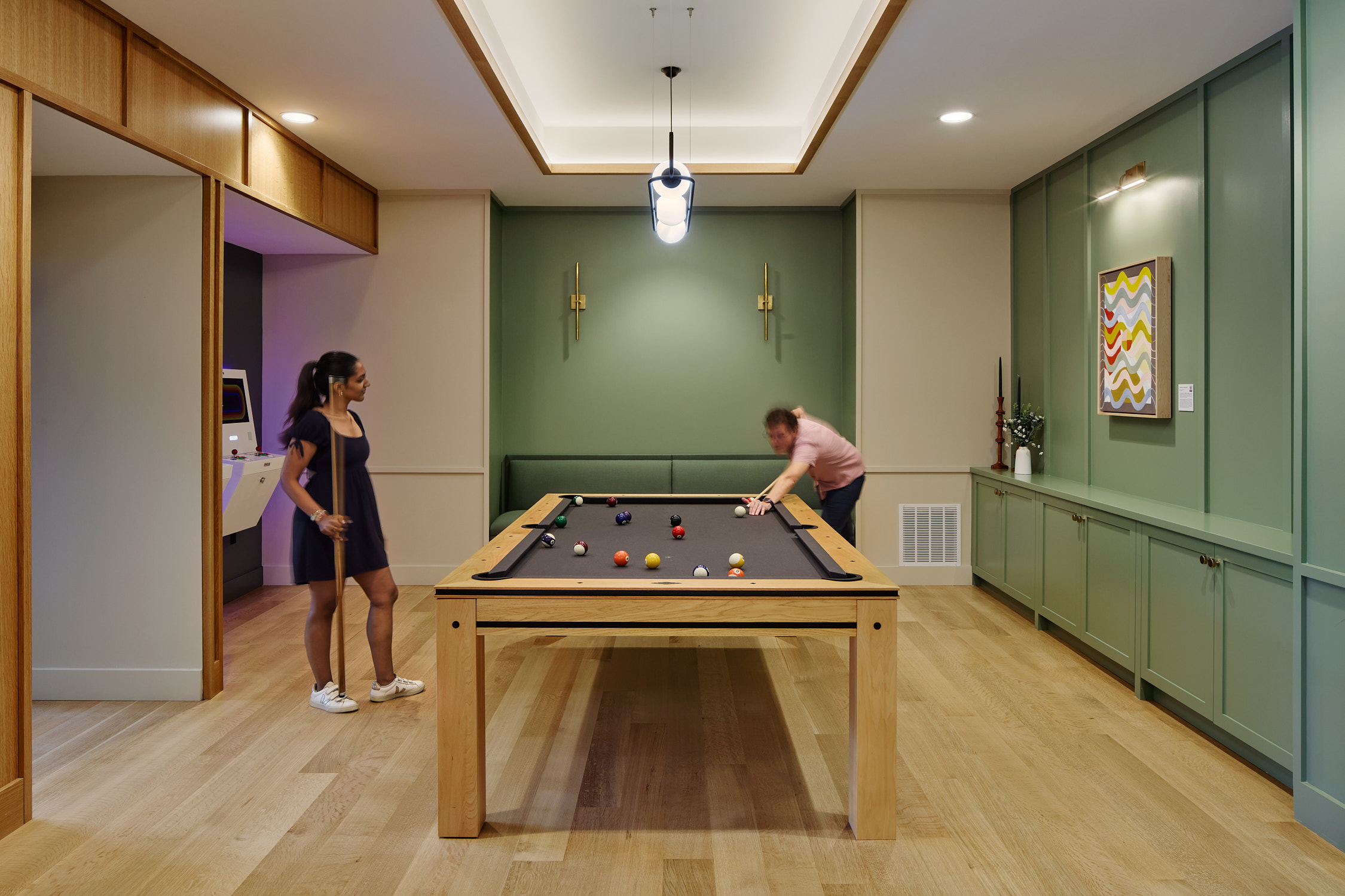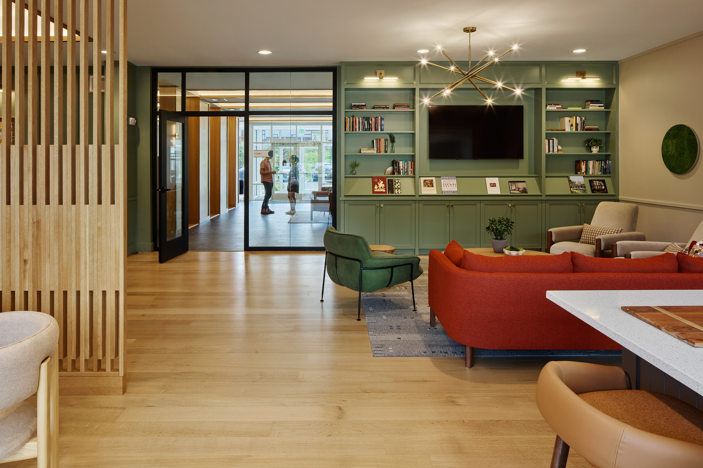 This amenity space design for a suburban multi-family apartment community takes inspiration from its verdant courtyard to create a light-filled retreat accented with natural materials.