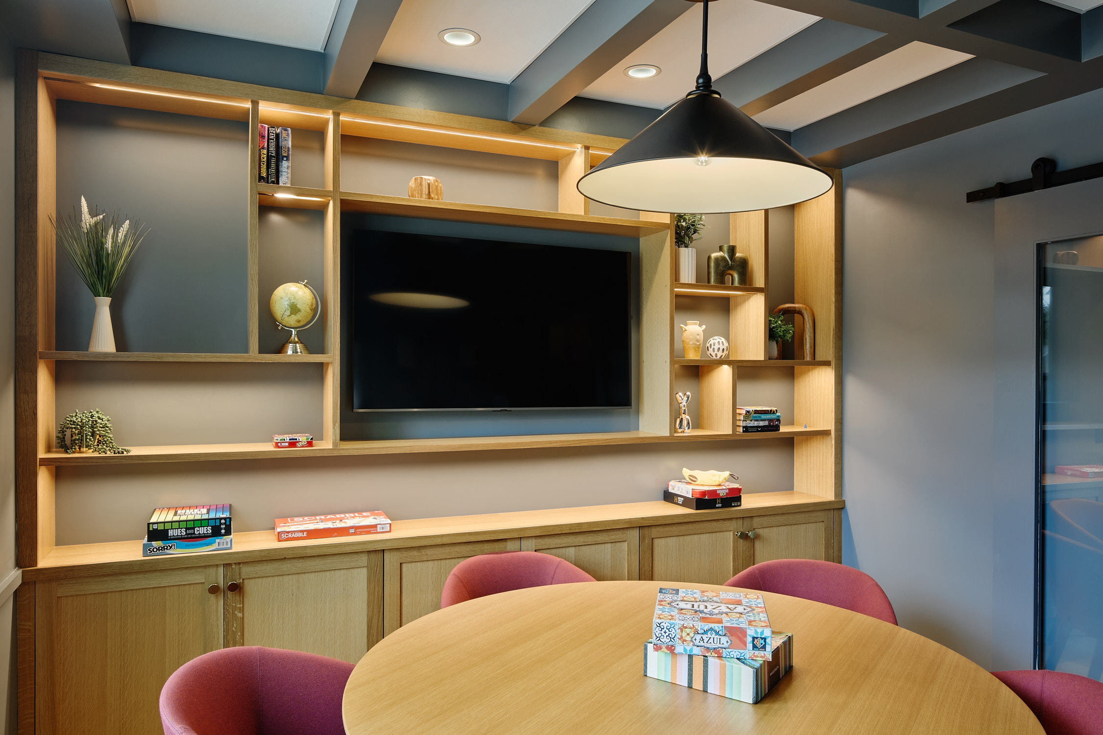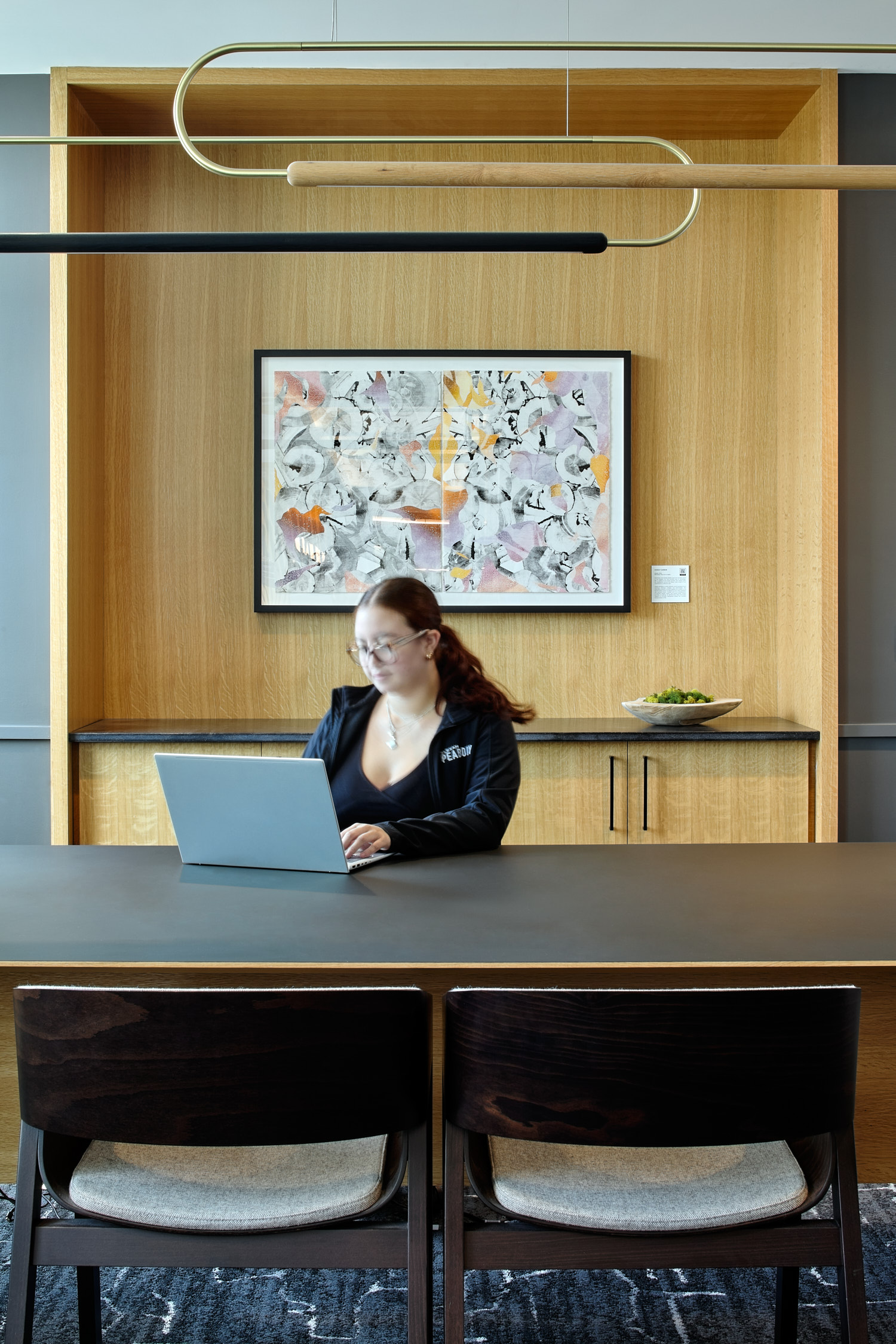 The amenity space is programmed with communal areas of different scales and distinct architectural characters and is conceived as an antidote to the generic sprawl of its surroundings. The wood screen walls, natural caning and decorative lighting modulate light in dramatic layers to focus on the connections to the courtyard. Each space is carefully sized to accommodate residents in both singles and groups to always feel vibrant and comfortable. The furniture, artwork and decorative elements support the project narrative as a curated and comfortable refuge from the daily grind.
