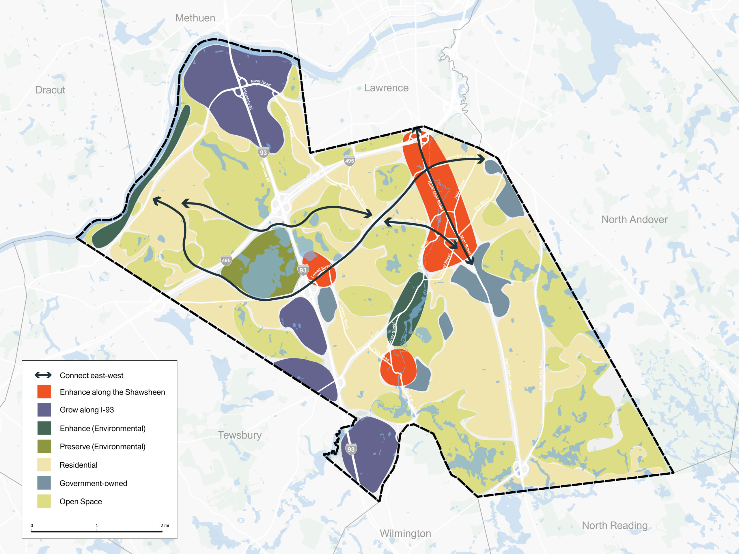 Utile worked collaboratively with the Town of Andover to lead a robust community engagement and planning process for the Town’s Comprehensive Plan update. The planning team heard through its outreach work concerns around sprawl, improving schools, ensuring that the town’s open space assets and development patterns stay familiar and desirable. This comprehensive planning process sought to proactively address these concerns through a long-term plan, so that the potential downsides of growth can be minimized as much as possible, and the collective benefits of that change can be maximally realized. With that in mind, the Andover Comprehensive Plan focuses on three key strategies: Densifying and expanding job centers along I-93 in the business and industrial parks, Encouraging new “middle missing” housing types in town and improving open space access along the Shawsheen and Improving east-west connectivity with improved multimodal transportation links.