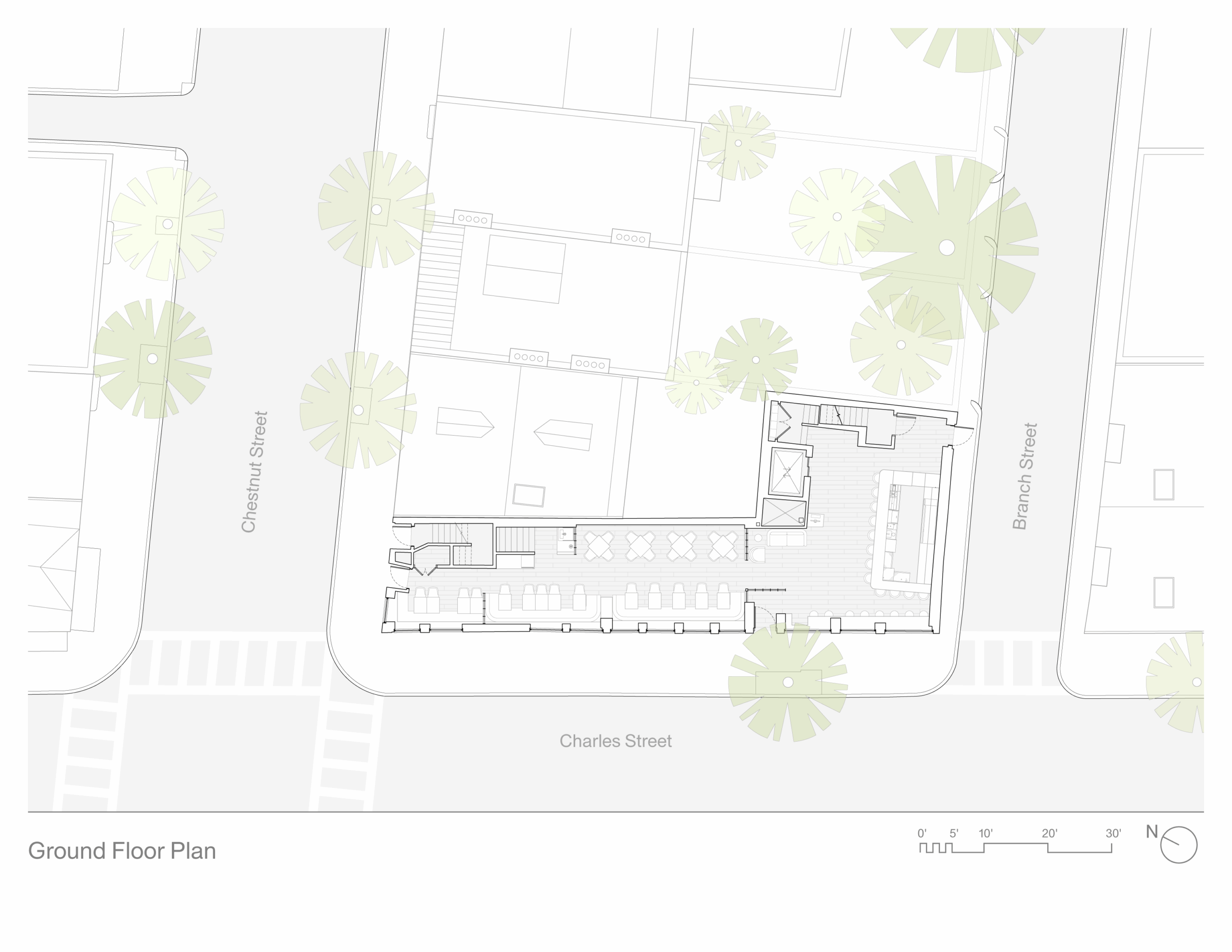 The redesign of these three interconnected historic commercial and residential buildings provides guests with modern amenities and access to all the neighborhood has to offer. The restaurant is designed to feel like both a neighborhood hangout and focal point as well as a destination for guests from farther afield.