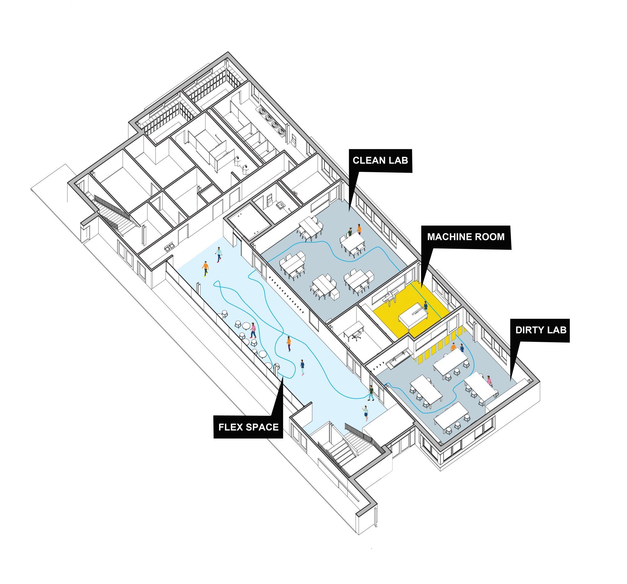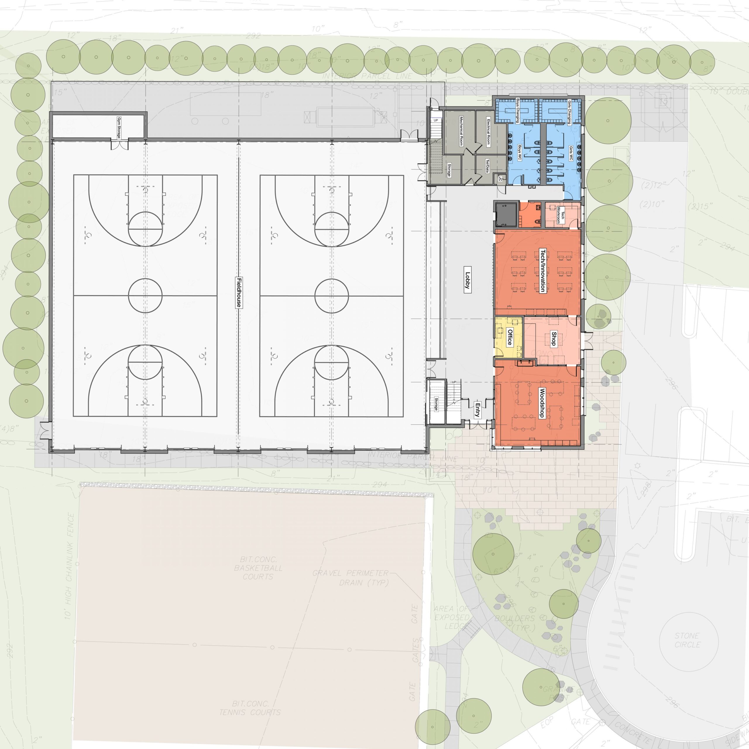 The Barn negotiates between two structural systems. The fieldhouse is a pre-engineered steel building with an insulated metal panel wall system. It spans over the head house, which embraces this corrugated metal cladding and exposed structure in a stick-built, steel classroom building. In this negotiation, the Barn molds key programmatic and spatial relationships into a building where regularity leads to cost efficiency while small customized insertions act at the scale of the individual student to tailor the space for a variety of teaching and learning styles.