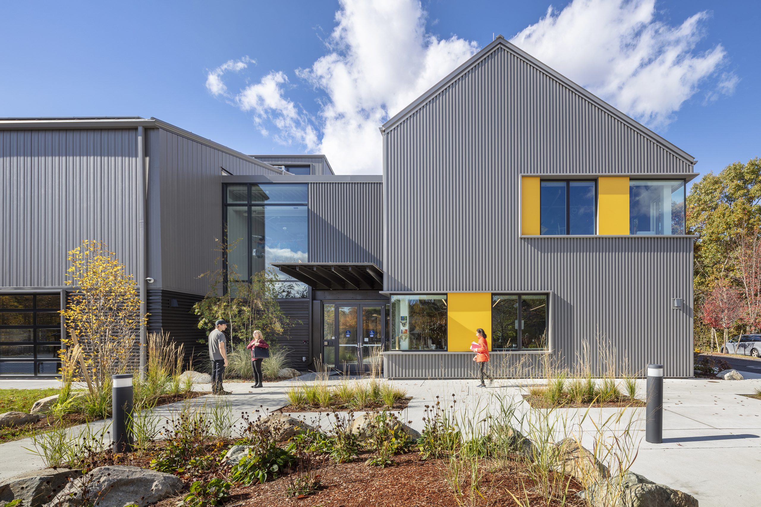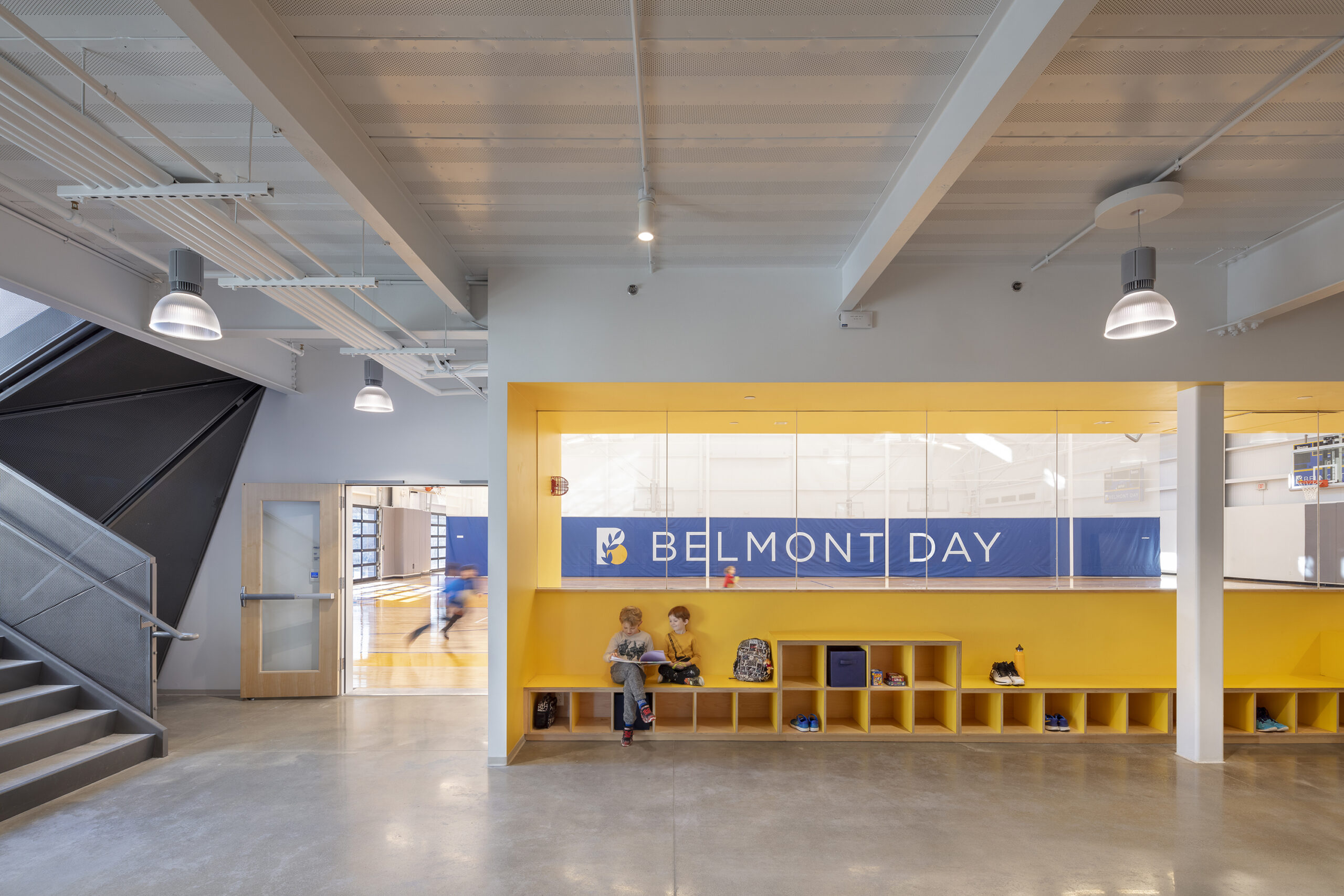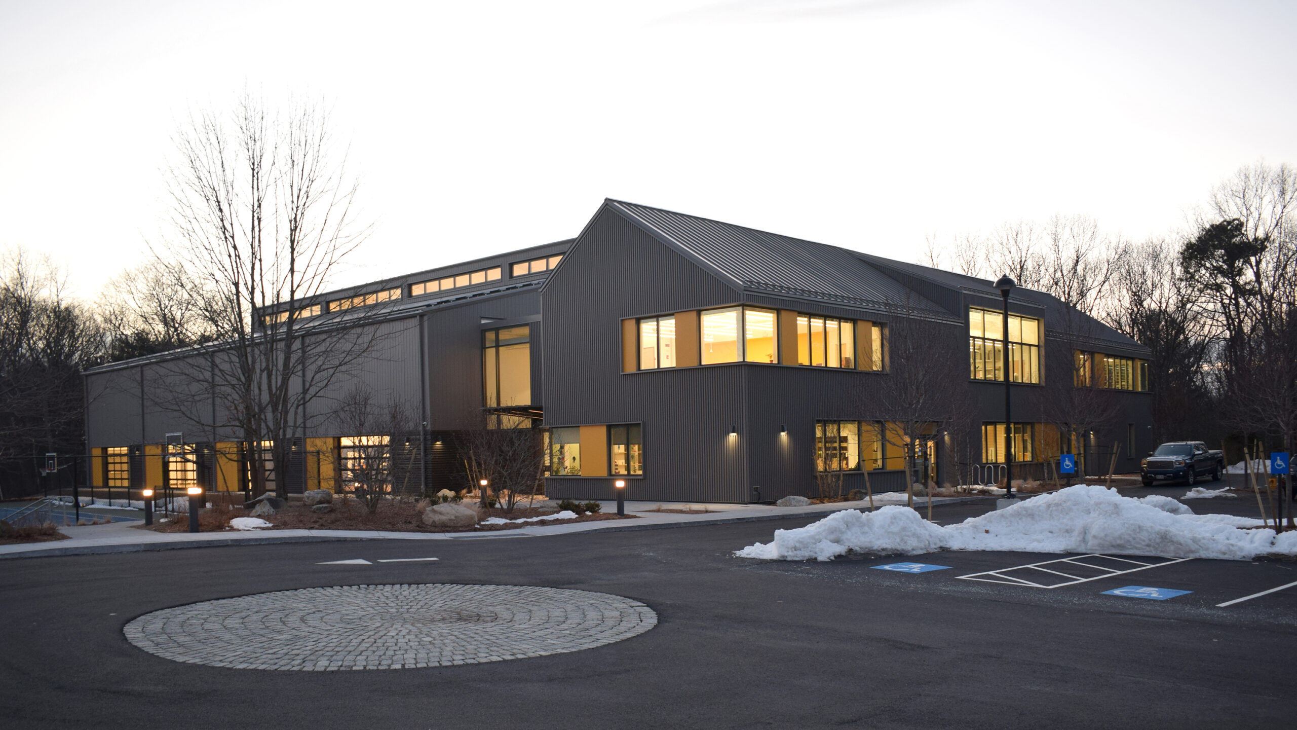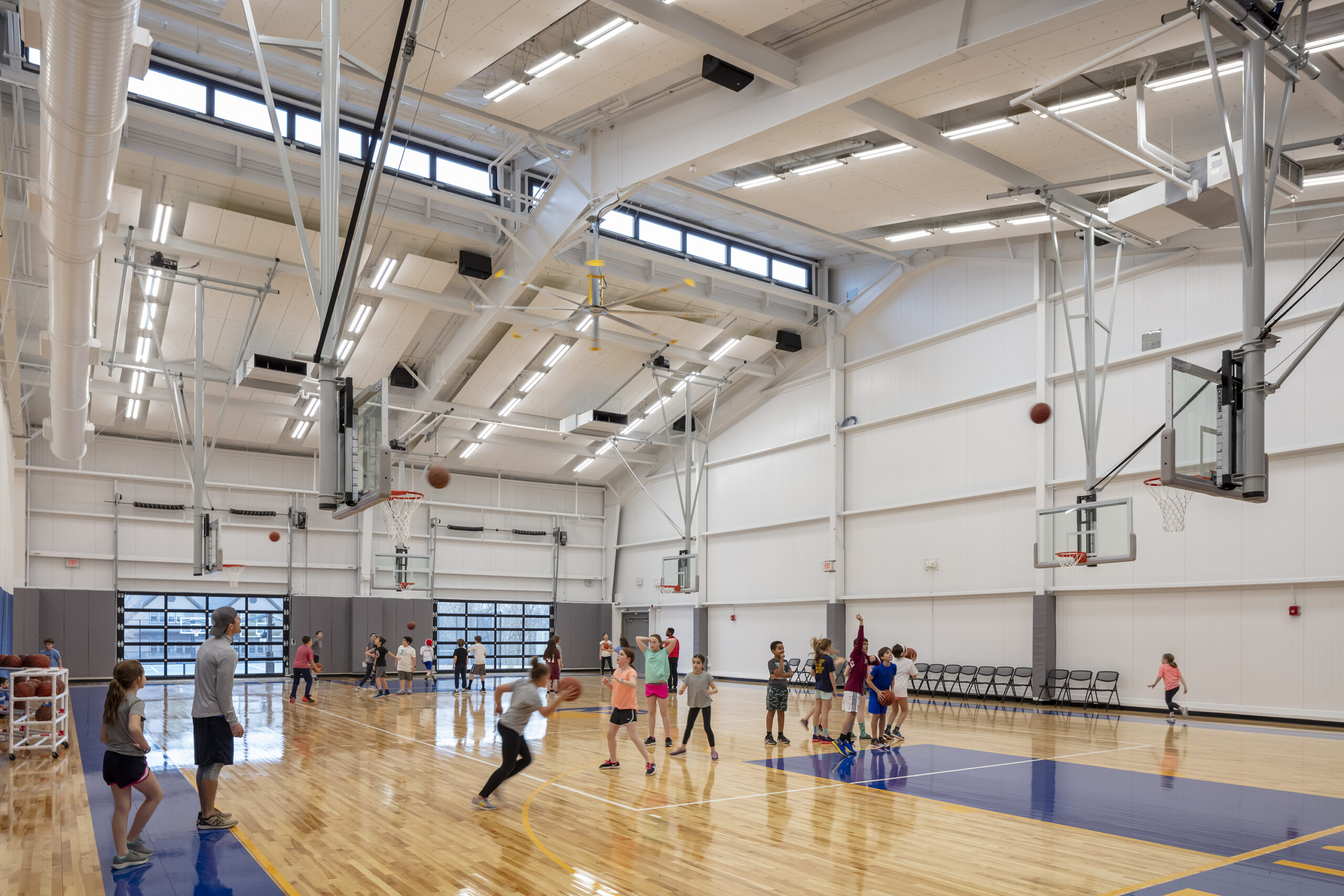 The Barn was conceived as part of a strategic campus vision plan that Utile developed for The Belmont Day School. The building contains a flexible, 14,000 square foot indoor athletics fieldhouse with two, dual-use basketball and volleyball courts as well as a 13,000 square foot two-story headhouse composed of offices, locker rooms, and five workshop-style classroom spaces for the School’s evolving STEAM programs. Large, glass garage doors in the fieldhouse create a direct connection to the surrounding landscape. These doors, along with operable clerestory windows offer passive cooling to the fieldhouse while rooftop PV panels provide a portion of the building’s power.