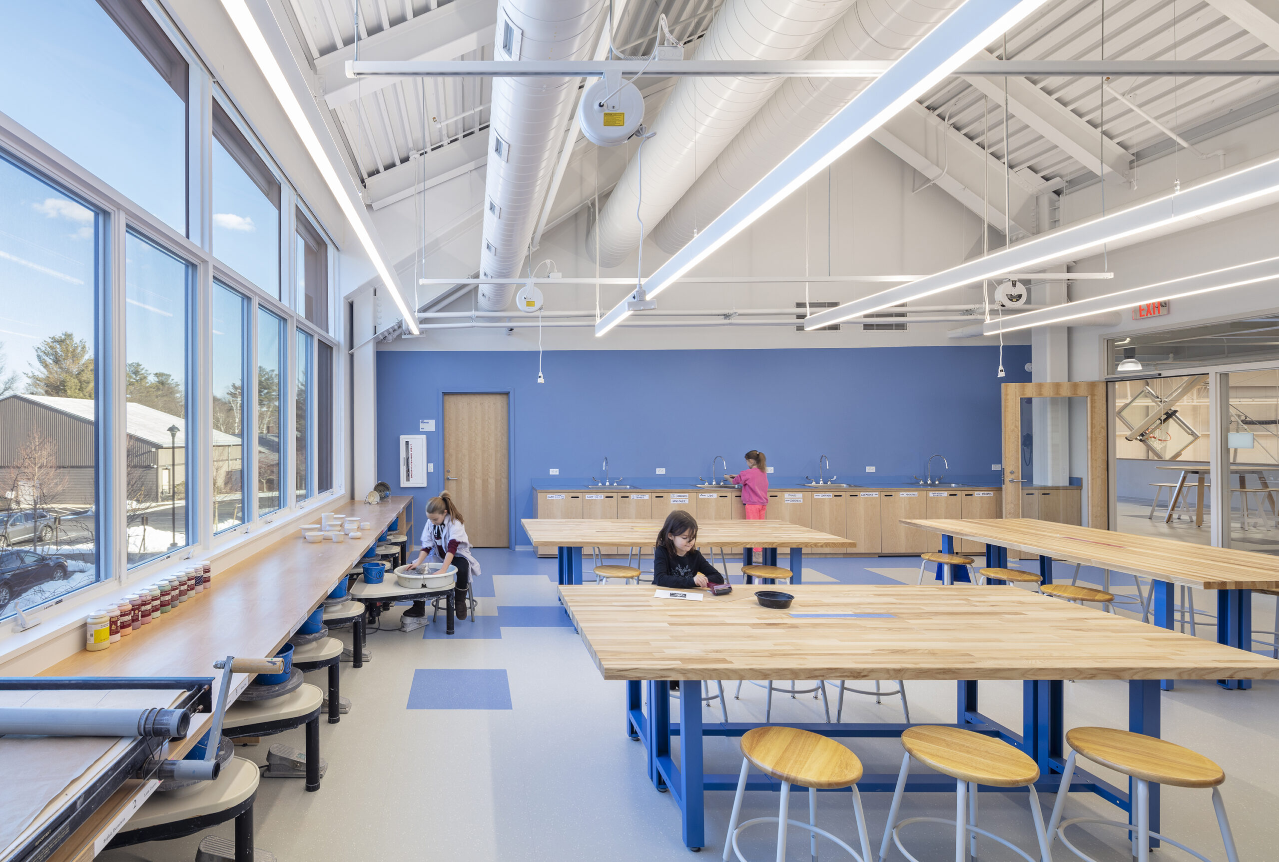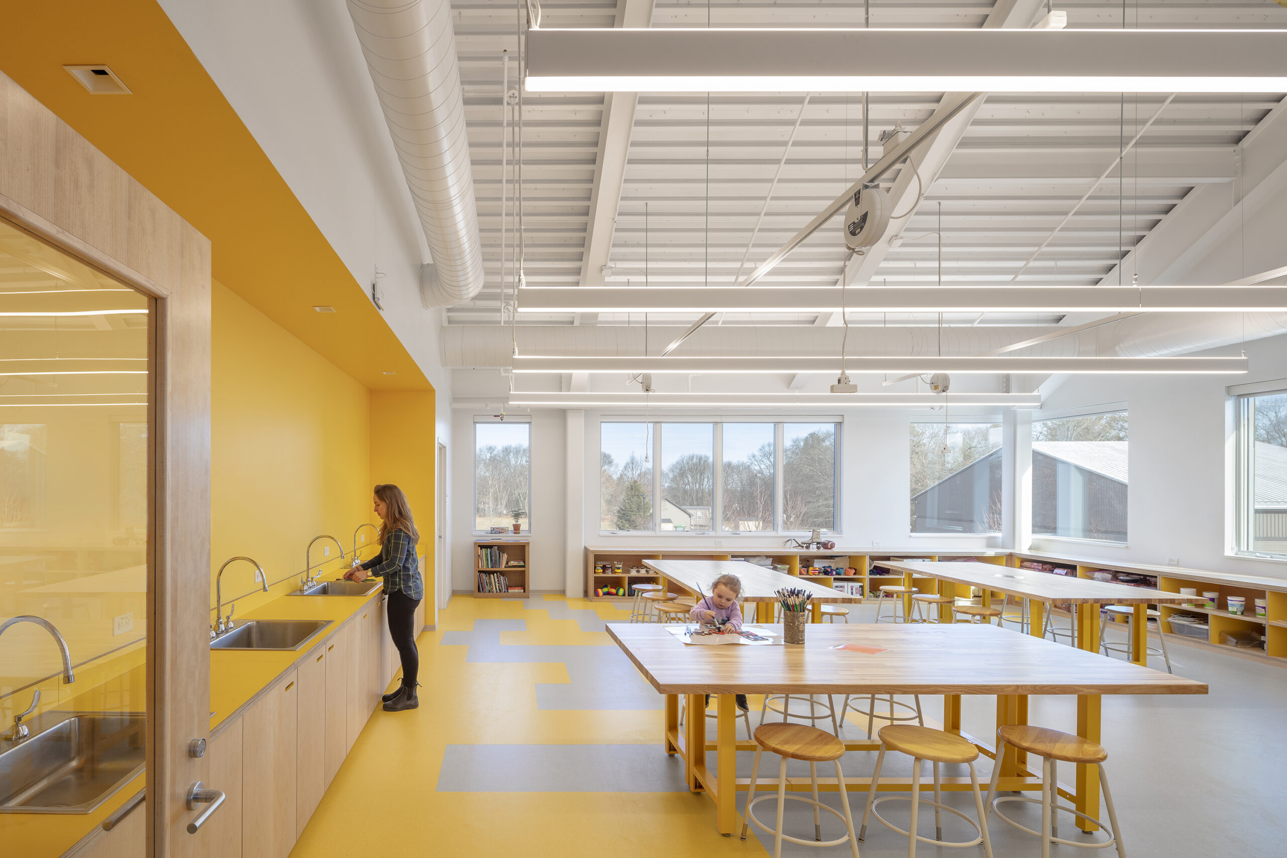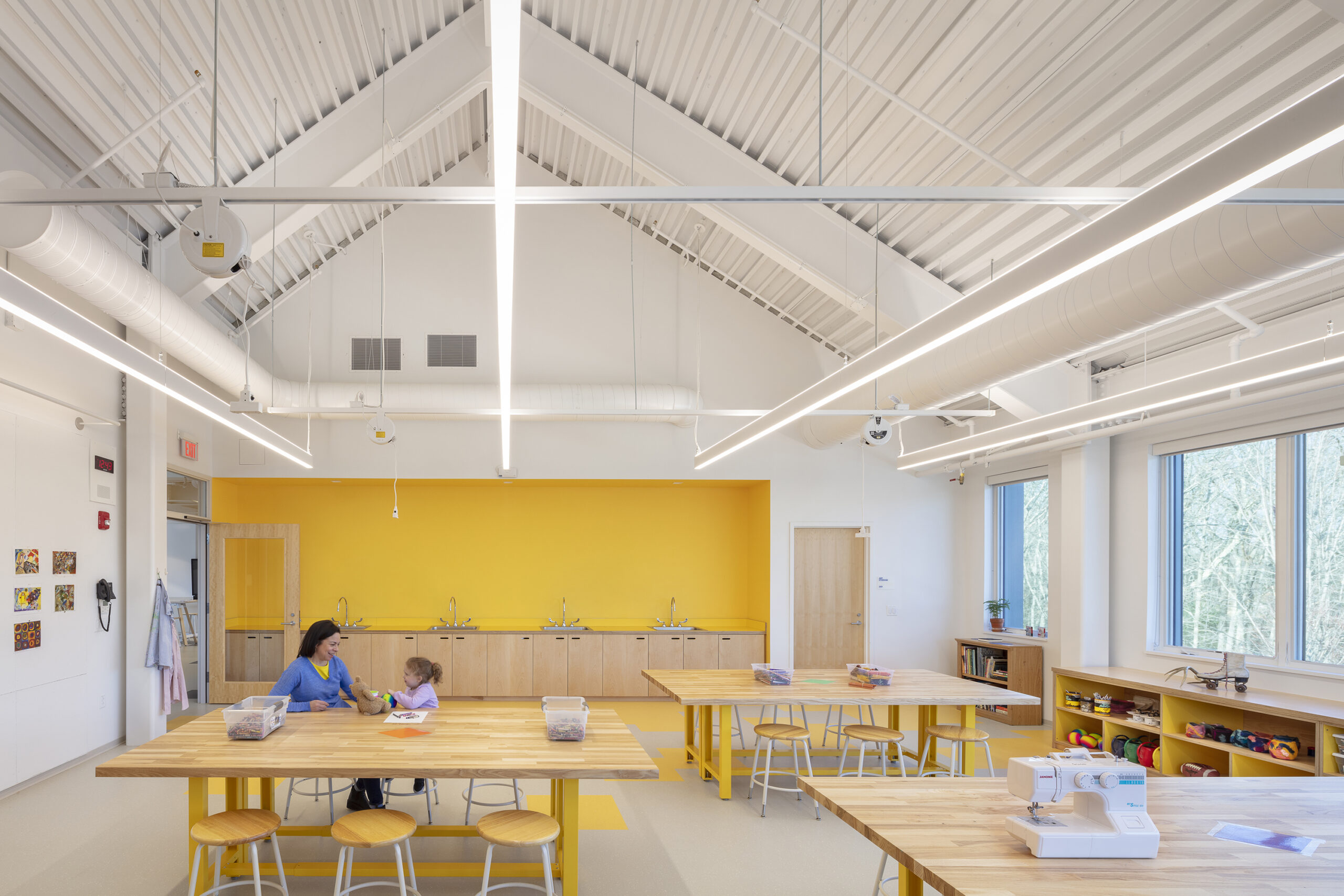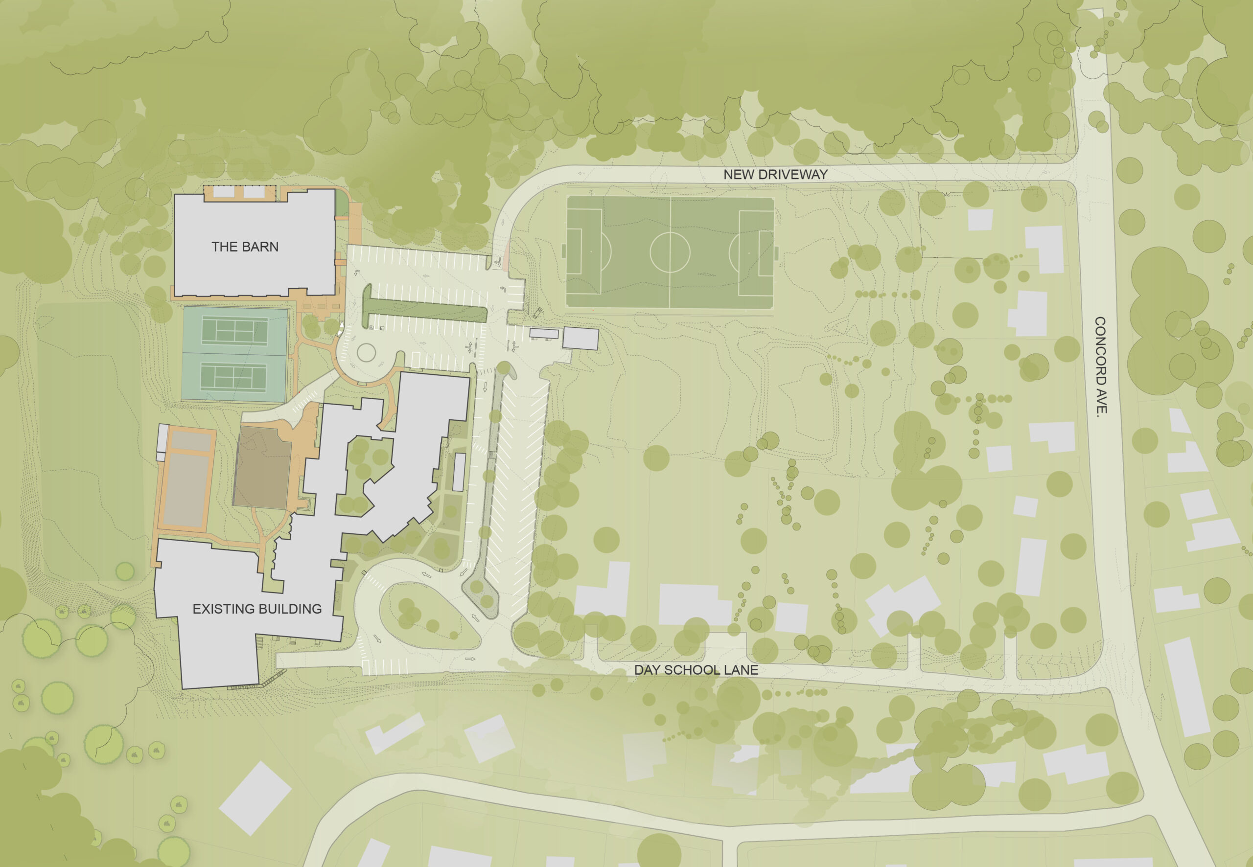The Barn was conceived as part of a strategic campus vision plan that Utile developed for The Belmont Day School. The building contains a flexible, 14,000 square foot indoor athletics fieldhouse with two, dual-use basketball and volleyball courts as well as a 13,000 square foot two-story headhouse composed of offices, locker rooms, and five workshop-style classroom spaces for the School’s evolving STEAM programs. Large, glass garage doors in the fieldhouse create a direct connection to the surrounding landscape. These doors, along with operable clerestory windows offer passive cooling to the fieldhouse while rooftop PV panels provide a portion of the building’s power.