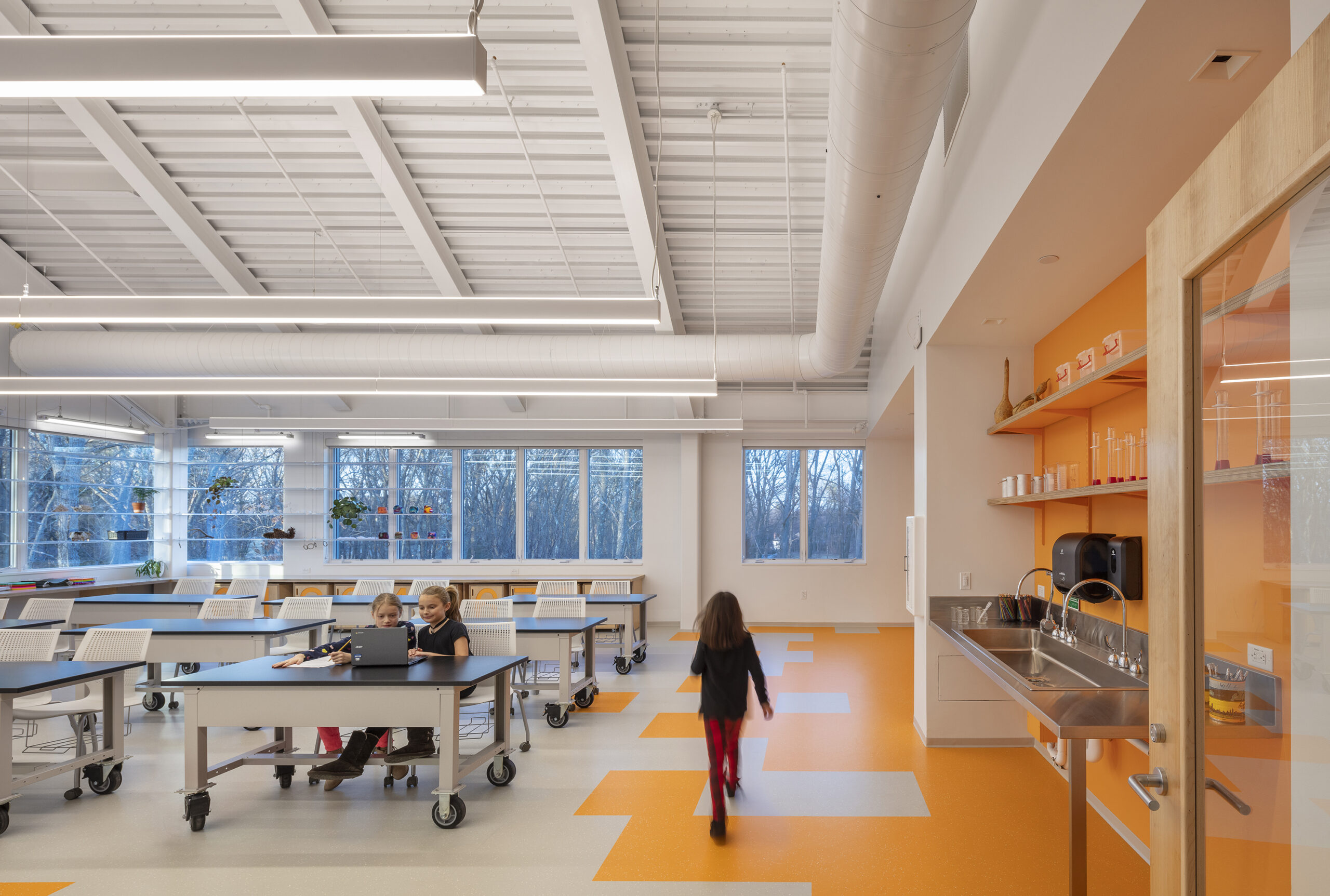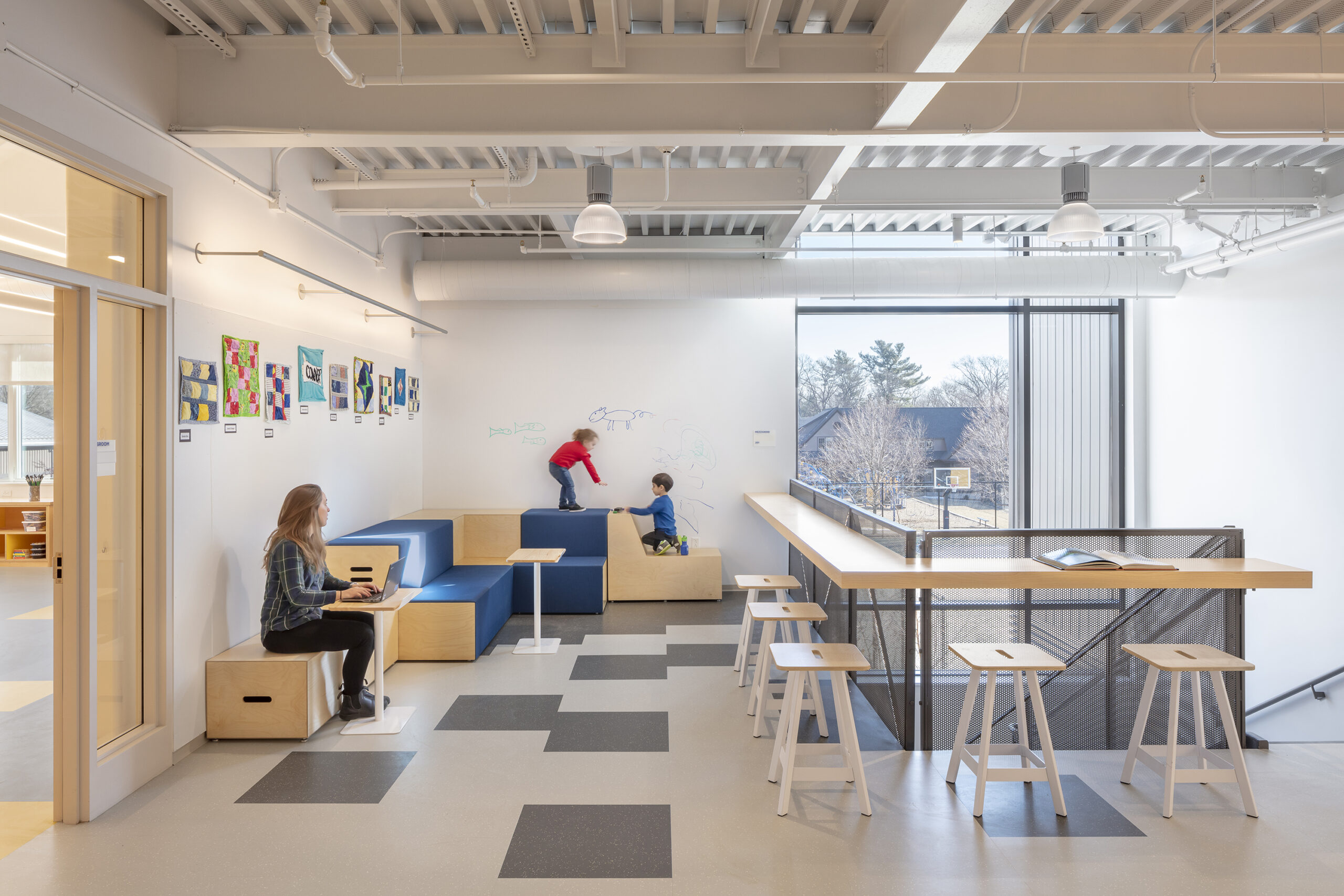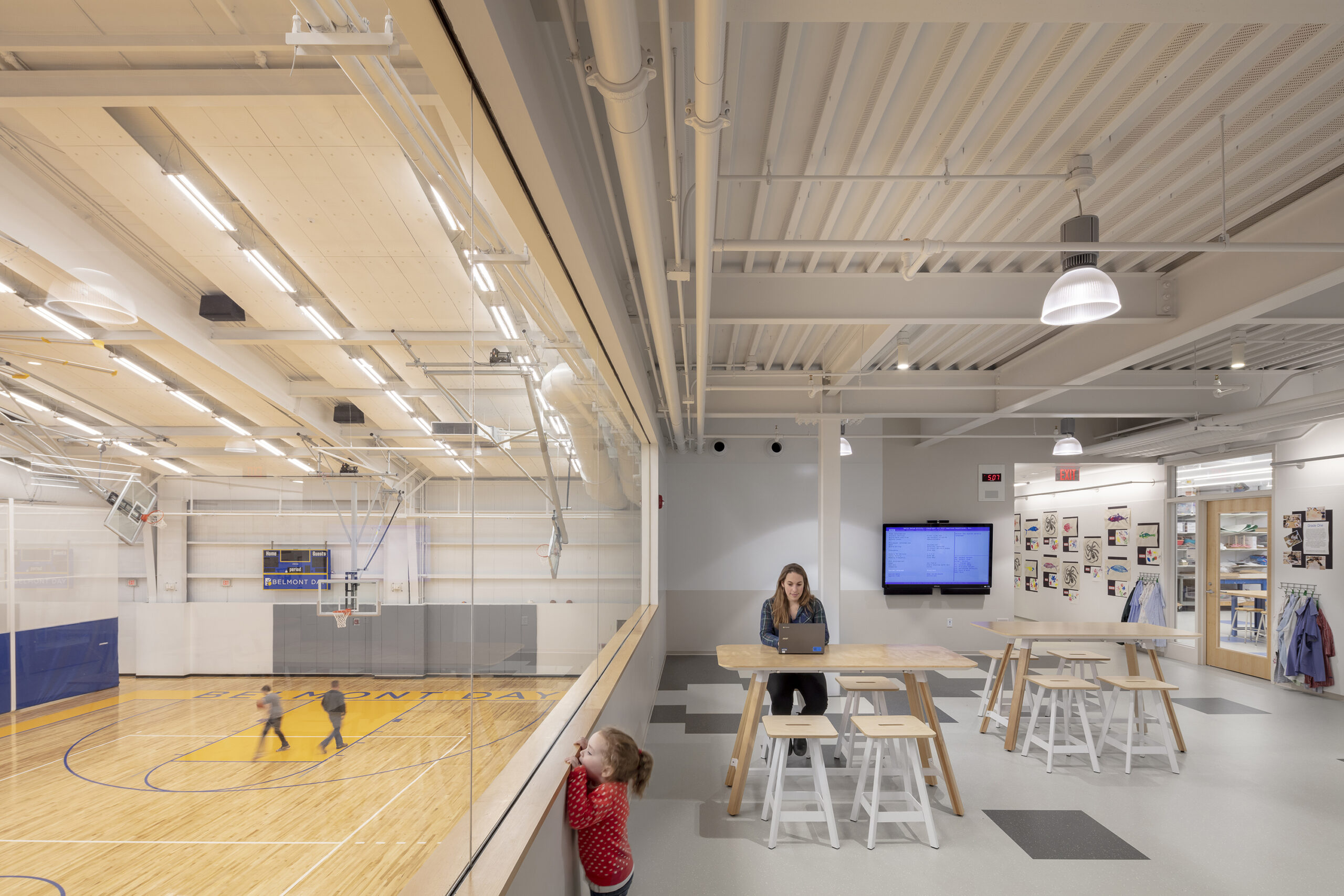 The playful composition of window openings and custom millwork offer each of the classrooms a unique identity, plenty of access to natural light, and views back to the campus. The generous circulation spaces outside the classrooms mediate between focused learning areas and the gym activity. These double as breakout spaces for group work and have the capacity to host larger gatherings and gallery space.