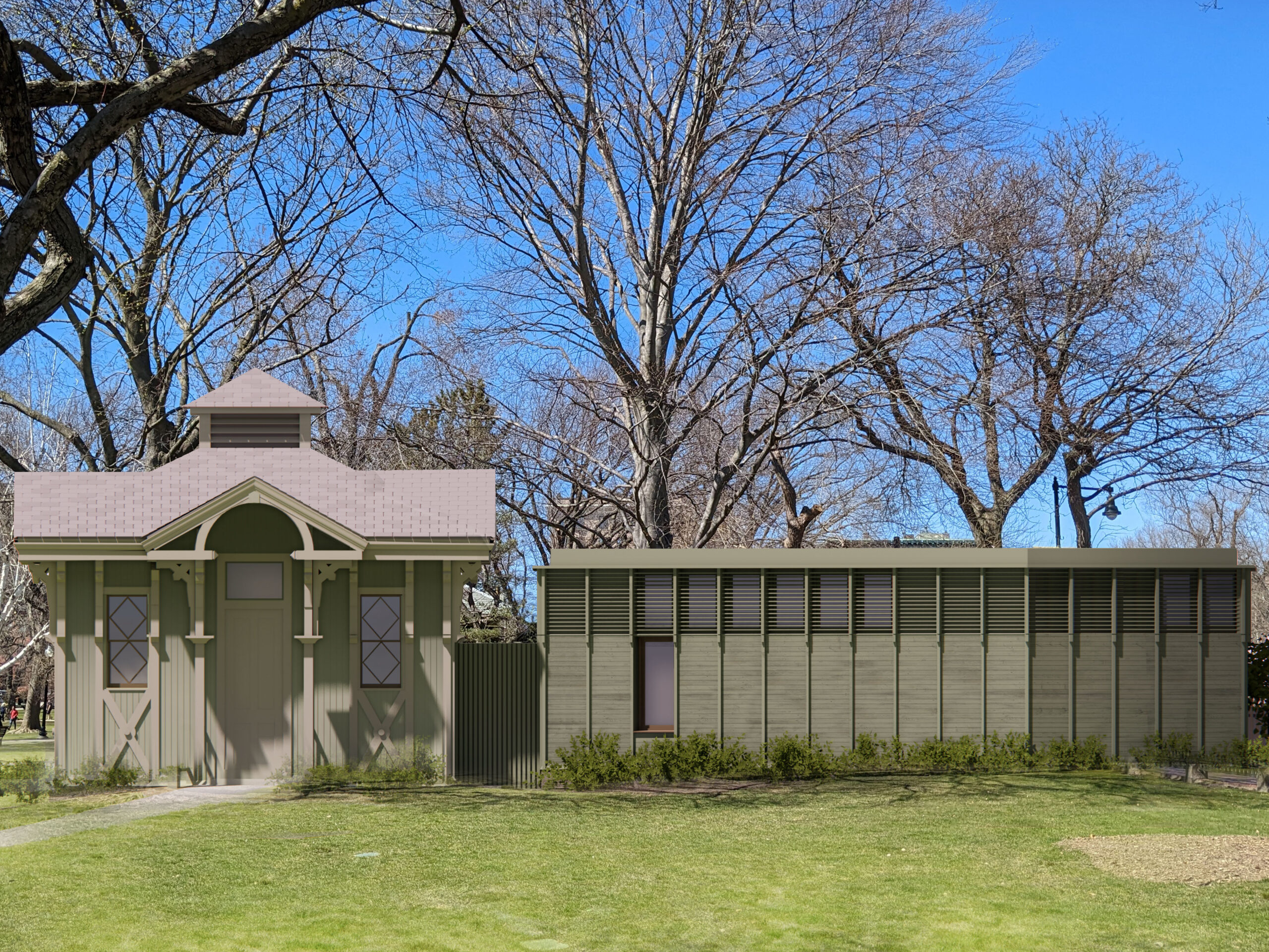 Utile is working with the Boston Public Facilities Department and the Boston Parks and Recreation Department to restore and expand the existing historic Tool House in Boston’s Public Garden, the America’s first public botanical garden. The project consists of a 650 square foot gut renovation of an existing 1950s Victorian-style structure, and the construction of a new 800 square foot secondary building. This expansion aims to provide much needed space for equipment storage and operations while carefully adapting to the various constraints of the site, including its adjacency to rare specimen trees. The new structure reinterprets the existing building’s Victorian façade elements in a modern and subdued language, allowing its newly-restored historic neighbor to remain the primary feature.