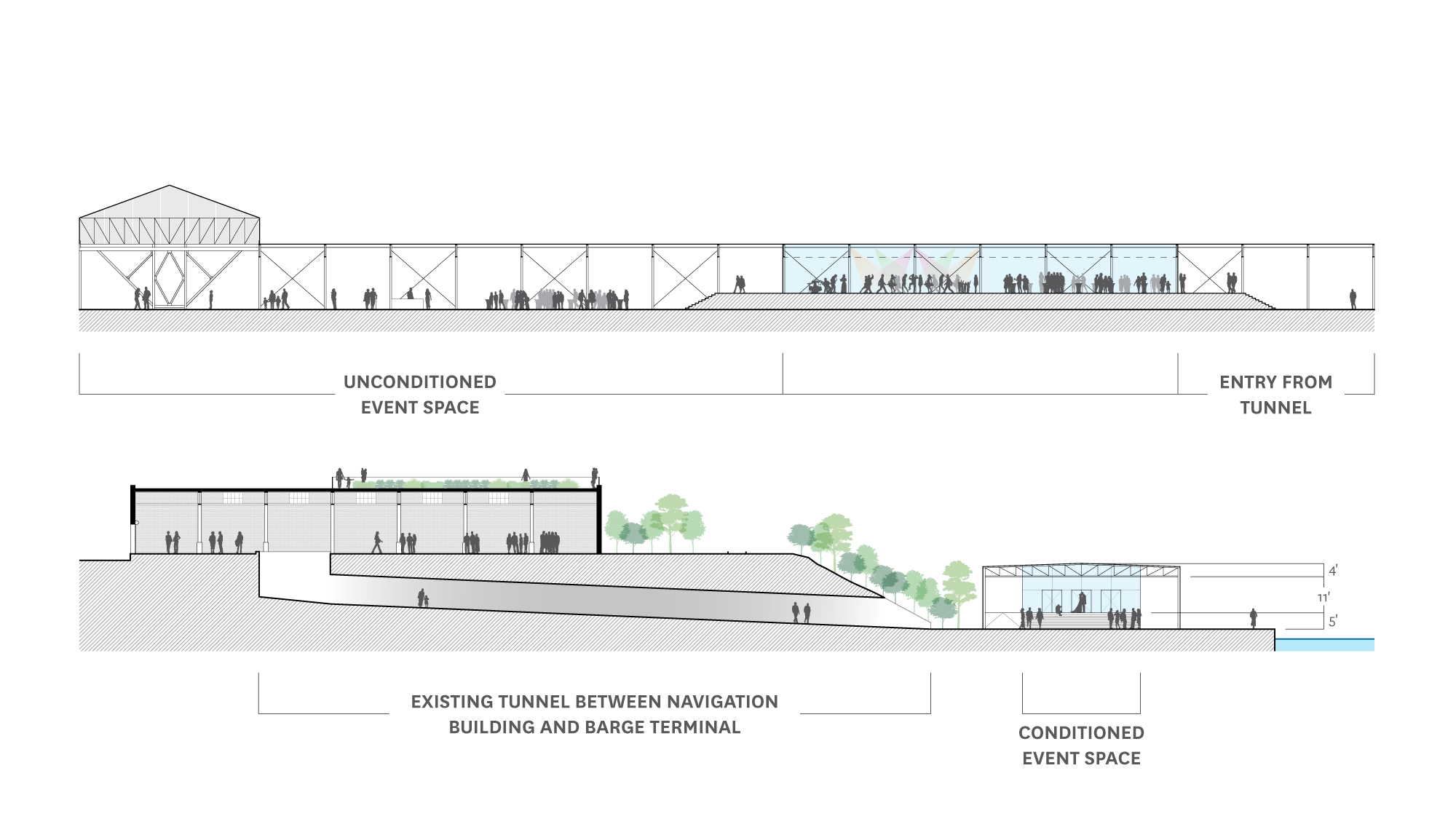 At Turkey Bend, Utile designed a conceptual plan for the adaptive reuse of an interconnected warehouse and barge terminal as a combination of incubator and event spaces. A portion of the roof is removed to create an internal courtyard that provides public access to the Bayou below.