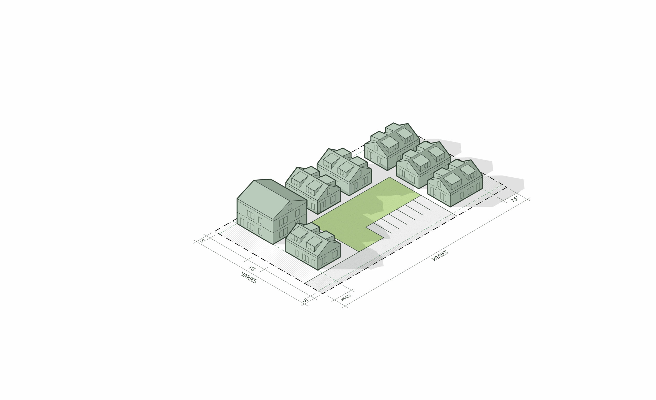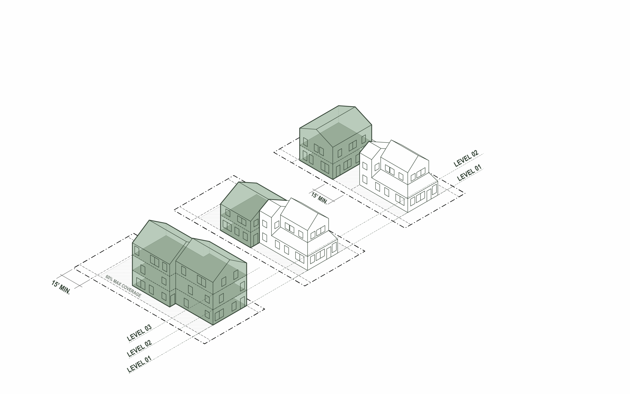 The Neighborhood Code updates the existing district boundaries (so that zoning reflects existing neighborhood patterns) and creates a simplified framework based on a few easy-to-understand parameters: building massing, roof form, setbacks, lot coverage, and units per building. Each of these parameters are calibrated to Burlington’s neighborhoods to reflect their existing scale.