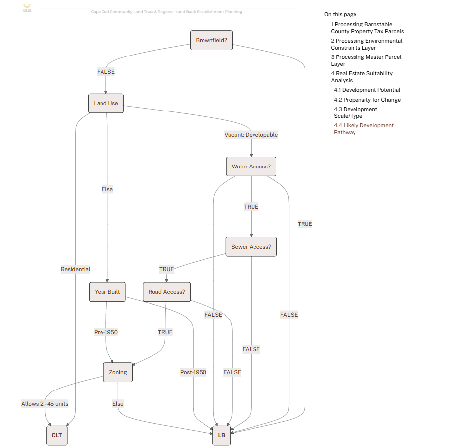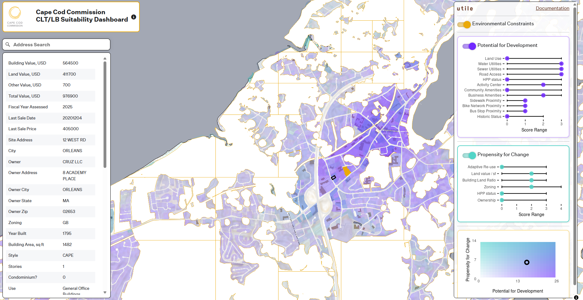 Building on prior housing suitability analysis and Grow Smart Cape Cod tools, Utile developed a map-based web application with extensive supporting documentation that centralized the information needed to inform early decision making when a future entity is deciding whether or not to pursue acquisition of a property. Because the Cape has very few remaining obvious housing development opportunities, the analysis and user interface of the tool was designed to help individuals determine if the potential of a given parcel was great enough to justify overcoming presumed challenges and barriers to housing development. The tool was constructed to be more transparent and descriptive than prior analysis and tools in order to facilitate easy access to all the key factors to support more opportunistic decision making based on suitability for housing, propensity for change, development capacity, and likely development pathway.