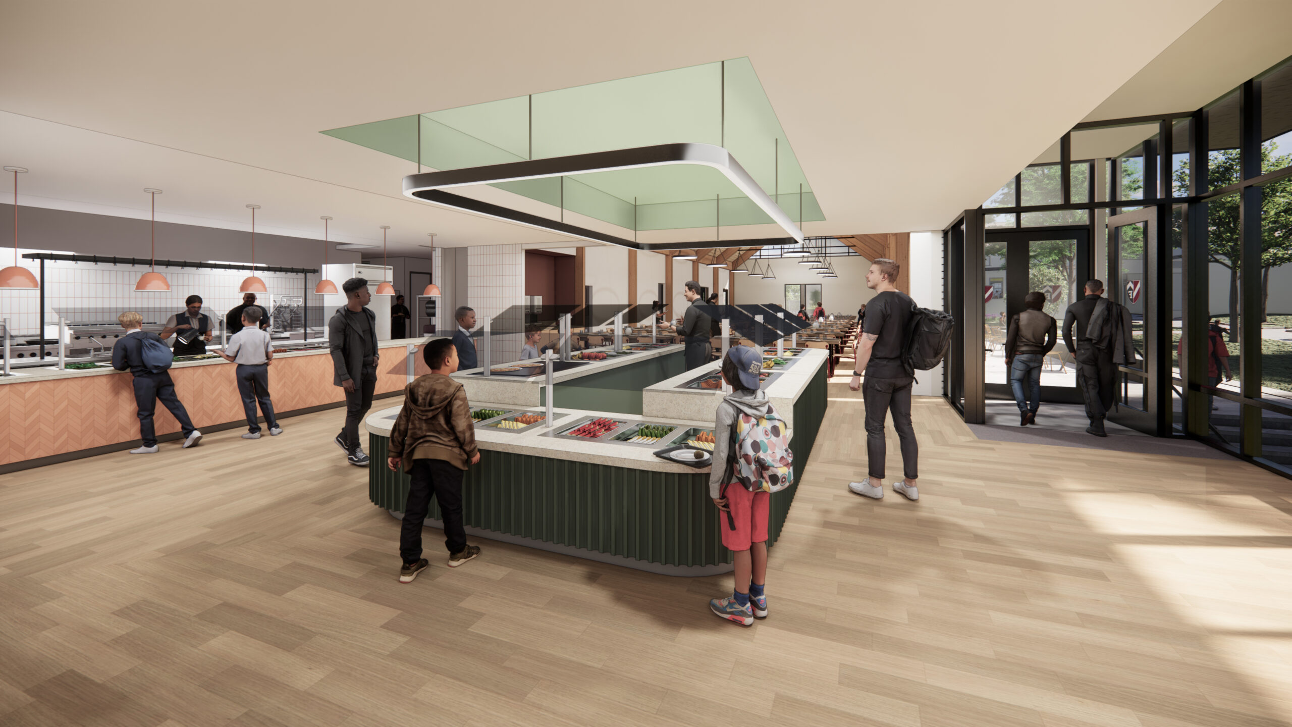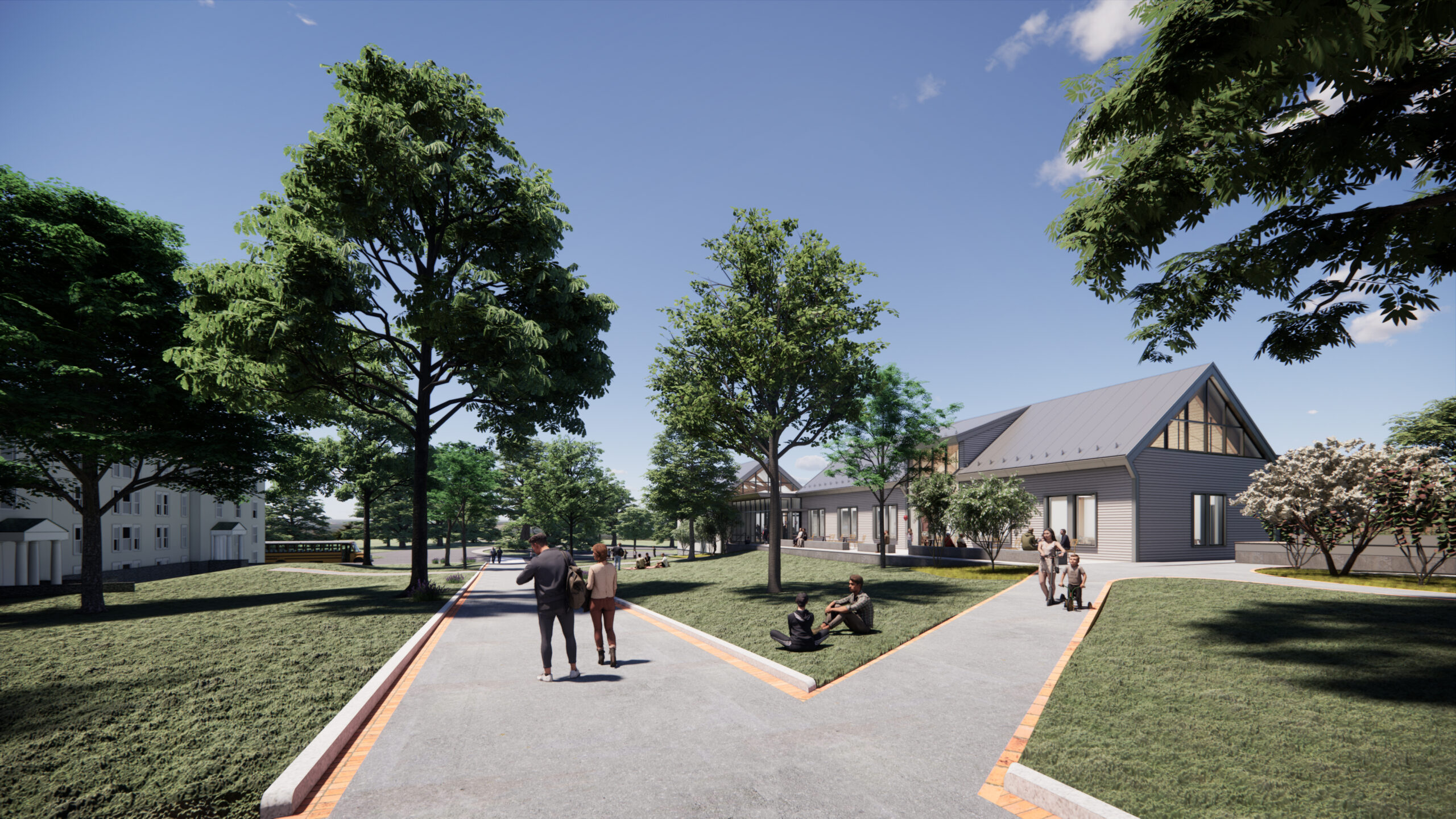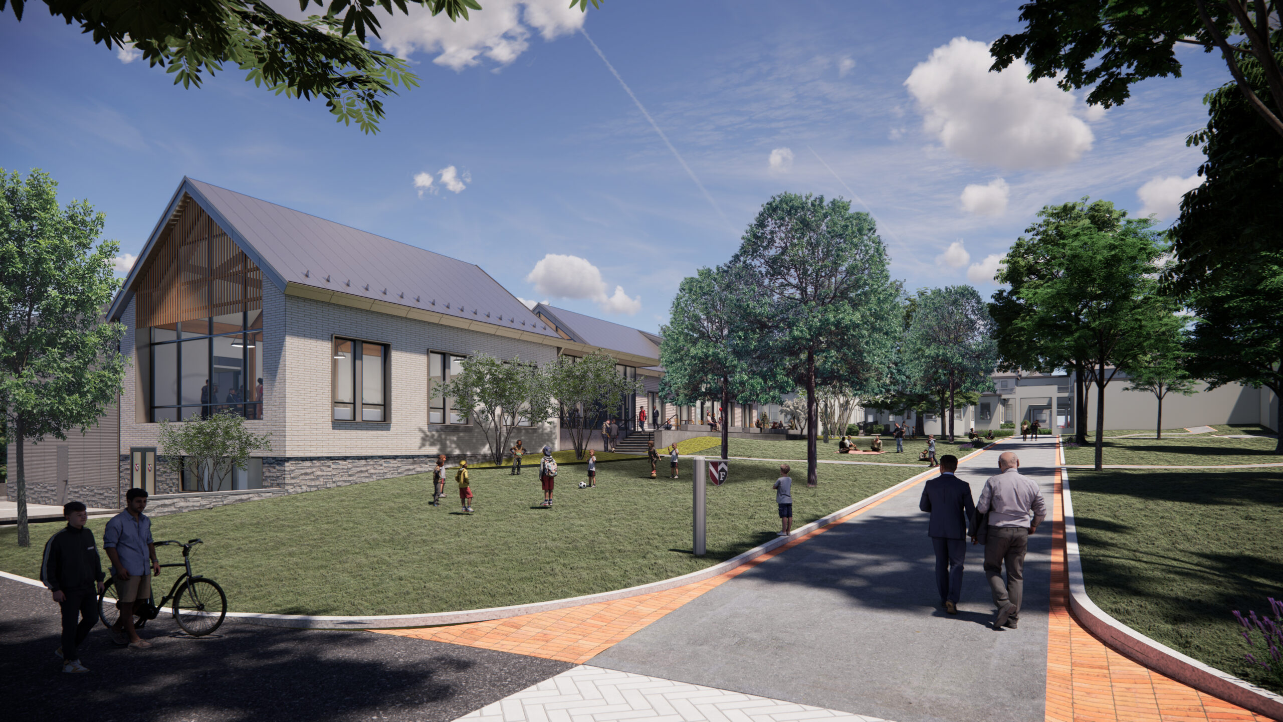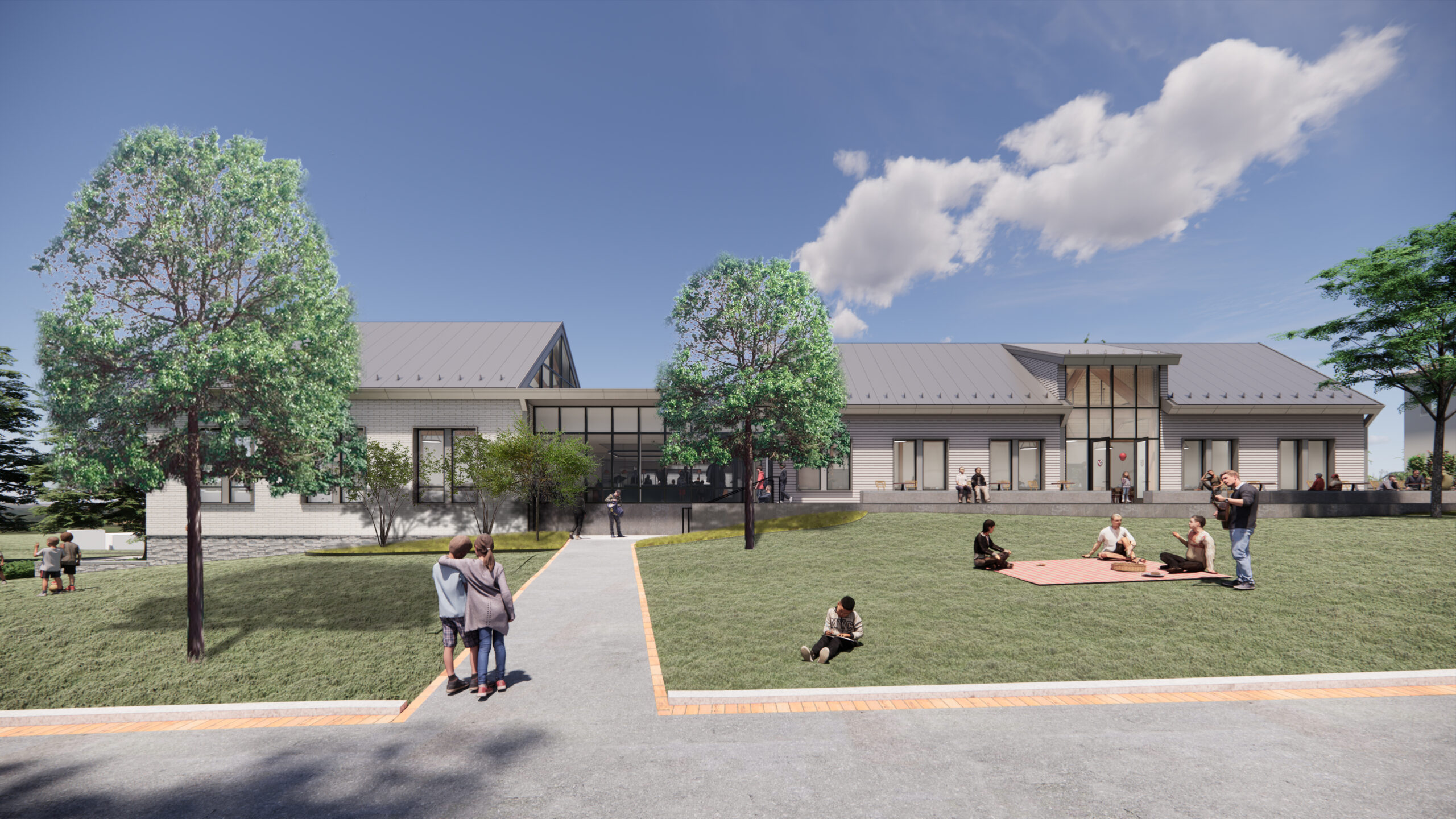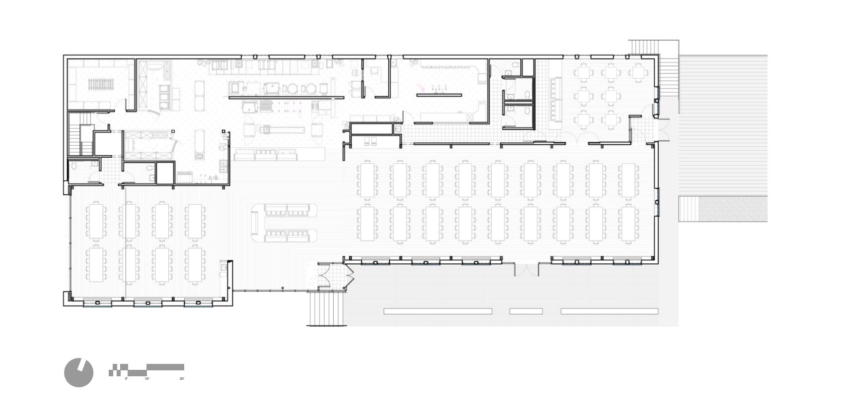 The Fessenden School in Newton, MA serves over 1,000 meals per day to its campus population of boarding and day students, faculty, and staff. This new full service dining facility includes a highly efficient kitchen and a dining room designed to accommodate a radically shifting capacity throughout the day, serving 50 people at some meals and 260 at others. By dividing the dining room in two, the space can adapt to meet varied needs throughout the day. Working within the existing material palette of the school’s historic campus, the exterior of the building showcases subtle changes in material texture. The building will help to update a signature campus lawn, and will feature a patio and grand stair to support campus life. The exposed glulam timber structure spans the dining room efficiently while also giving the interior distinctive character.