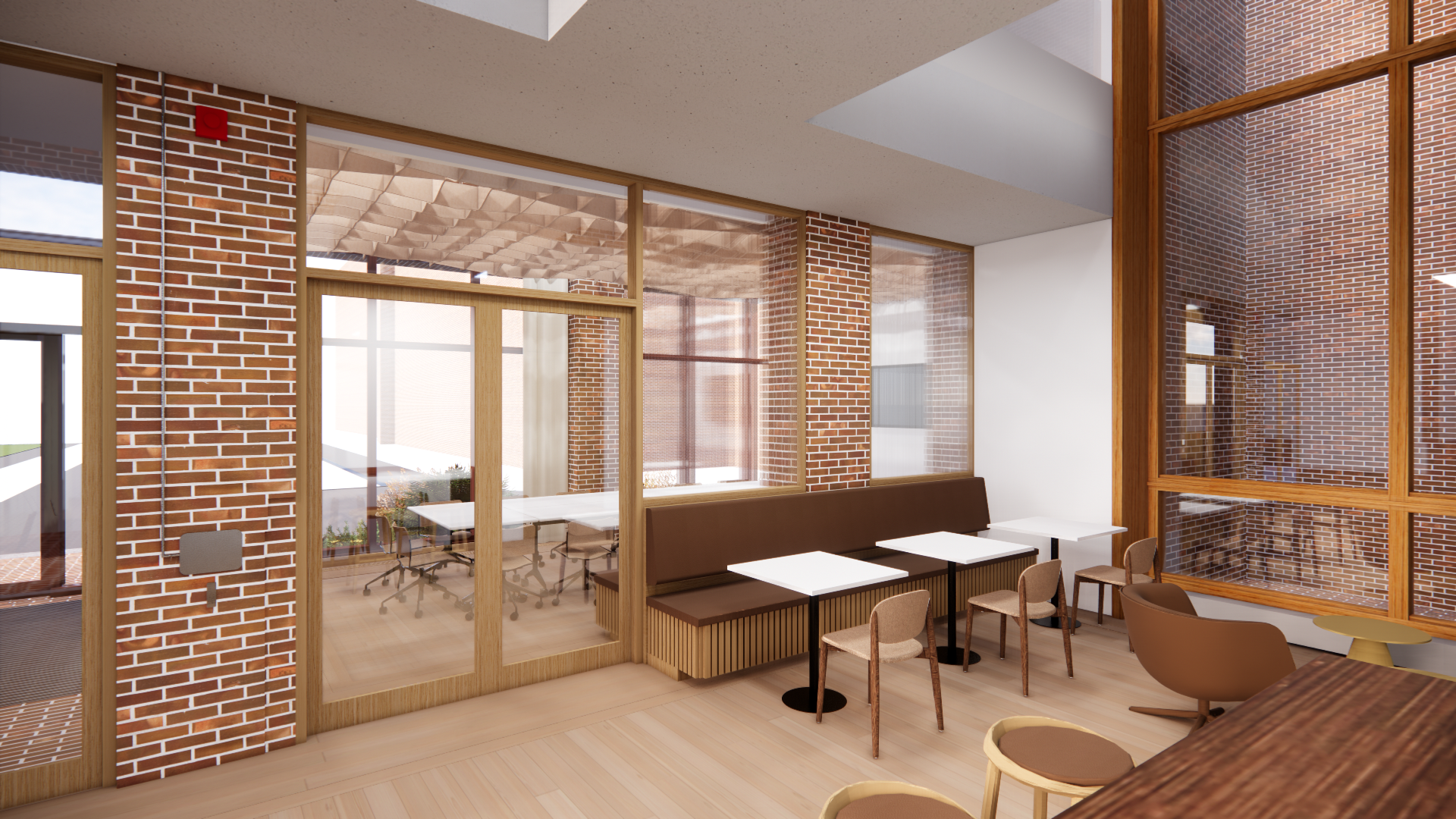 The proposed design reorganizes the existing lobby to introduce a large meeting room, informal collaboration areas, and improved circulation. These updates encourage interaction while preserving space for focused work and essential support functions. Accessibility improvements are central to the project, addressing significant level changes at the entrance and expanding access throughout the lobby.