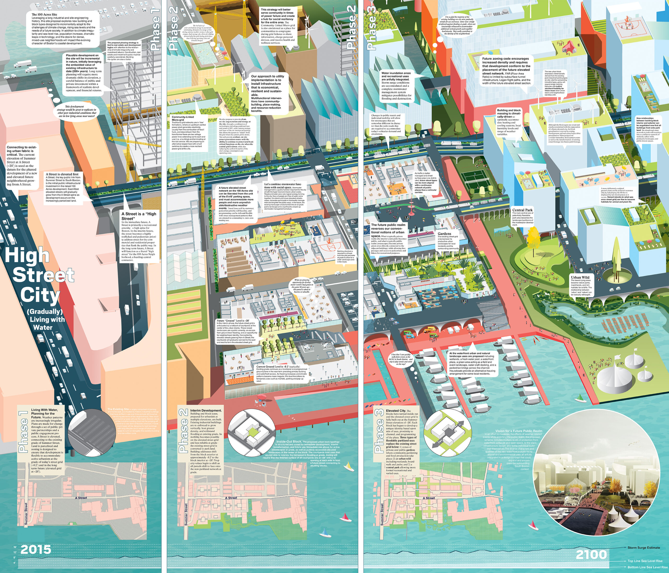 The Boston Living with Water competition, launched by the City of Boston, Boston Harbor Association, Boston Redevelopment Authority, and Boston Society of Architects, called upon the international design community for solutions envisioning a more resilient, more sustainable, and more beautiful Boston adapted for end-of-the-century climate conditions and rising sea levels. The Utile team’s proposal takes the long view, with a focus on the 100 Acres section of the Fort Point Channel District, representative of large urban mixed-use redevelopment opportunities across Boston.