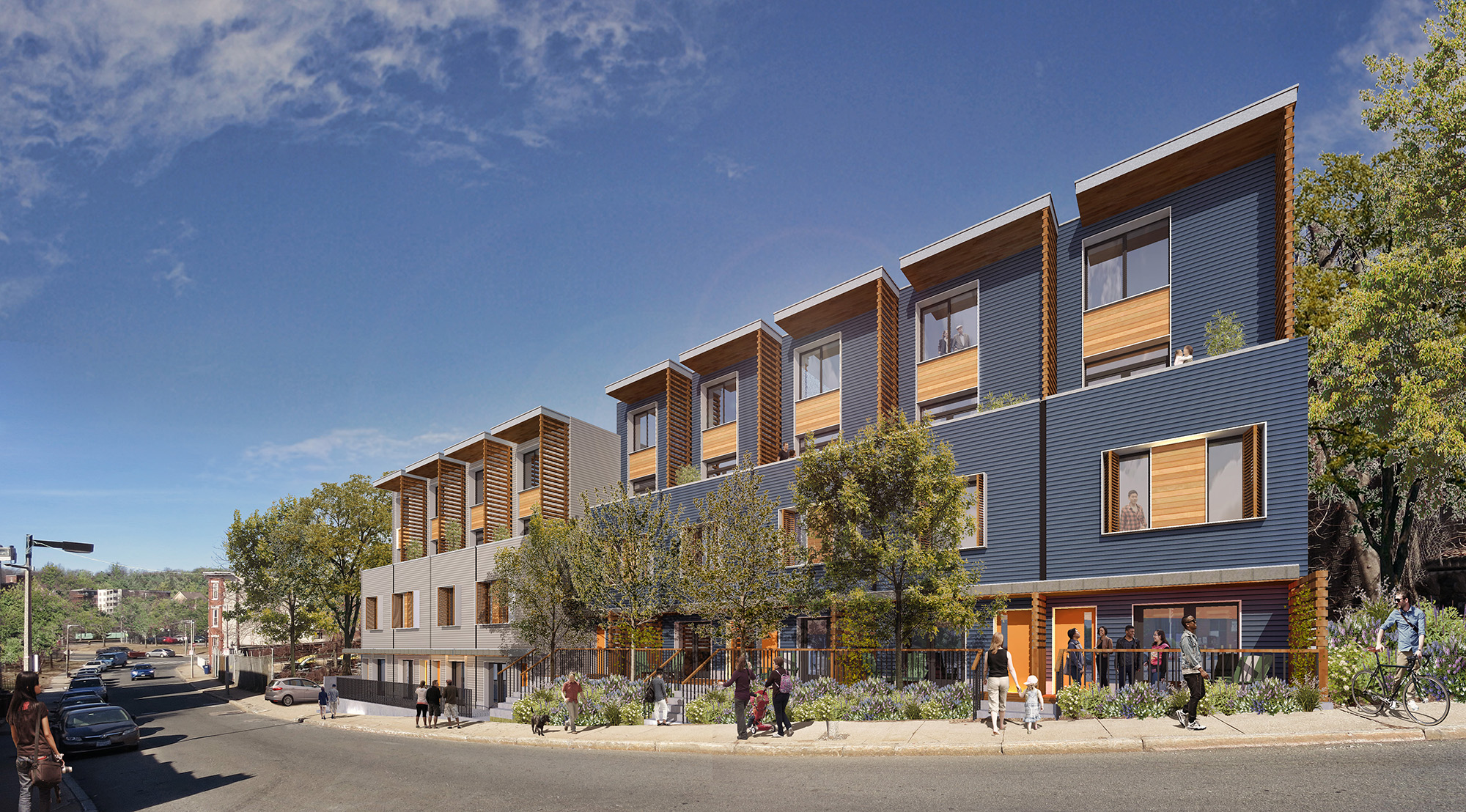 In response to a request for proposals from the Boston Department of Neighborhood Development’s E+ Green Building Program, Utile and New Atlantic Development proposed the development of energy-positive, mixed-income housing in the Roxbury area of Boston. Highland Yard consists of 18 units designed to exceed the highest standards for energy conservation. The siting and design of the building at once takes advantage of the south facing slope for solar orientation as well as the opportunity to fill-in a large missing tooth in the residential fabric of Highland Street. The neighborhood consists of single, two-family, and smaller townhouses along with multifamily homes, and accordingly Highland Yard’s multiple single entries on the street and rowhouse rhythm retain that character. Like a traditional townhouse, all units have front and rear exposures that not only enhance the sense of “home” ownership, but also enable natural cross-ventilation and greater access to daylight and passive solar benefits.