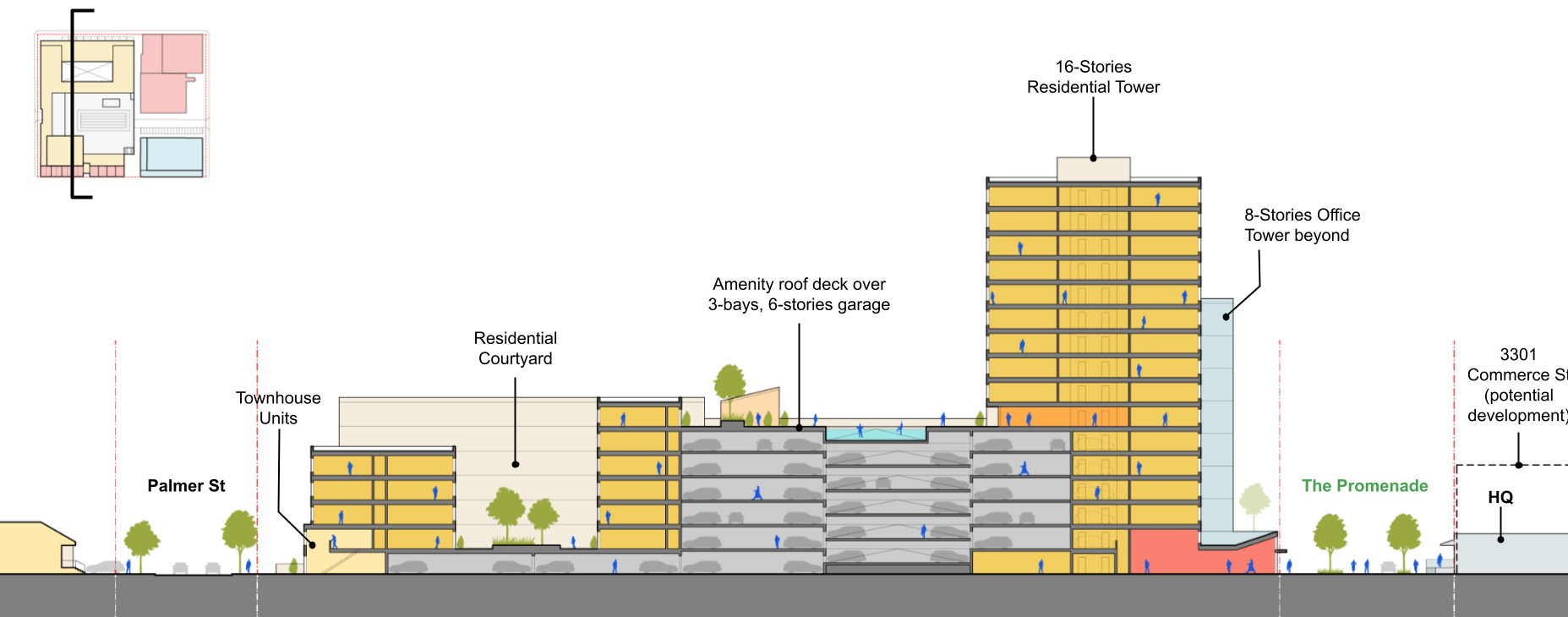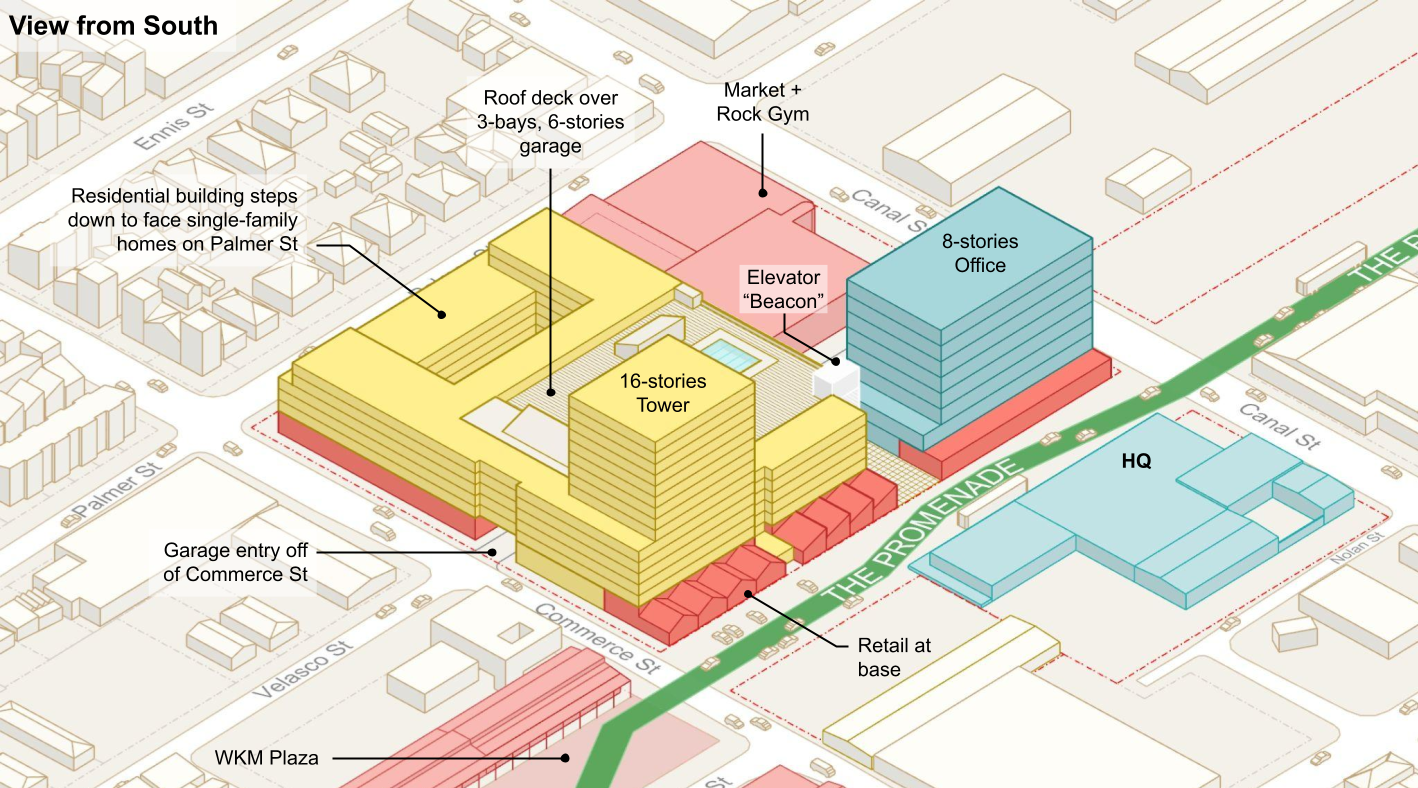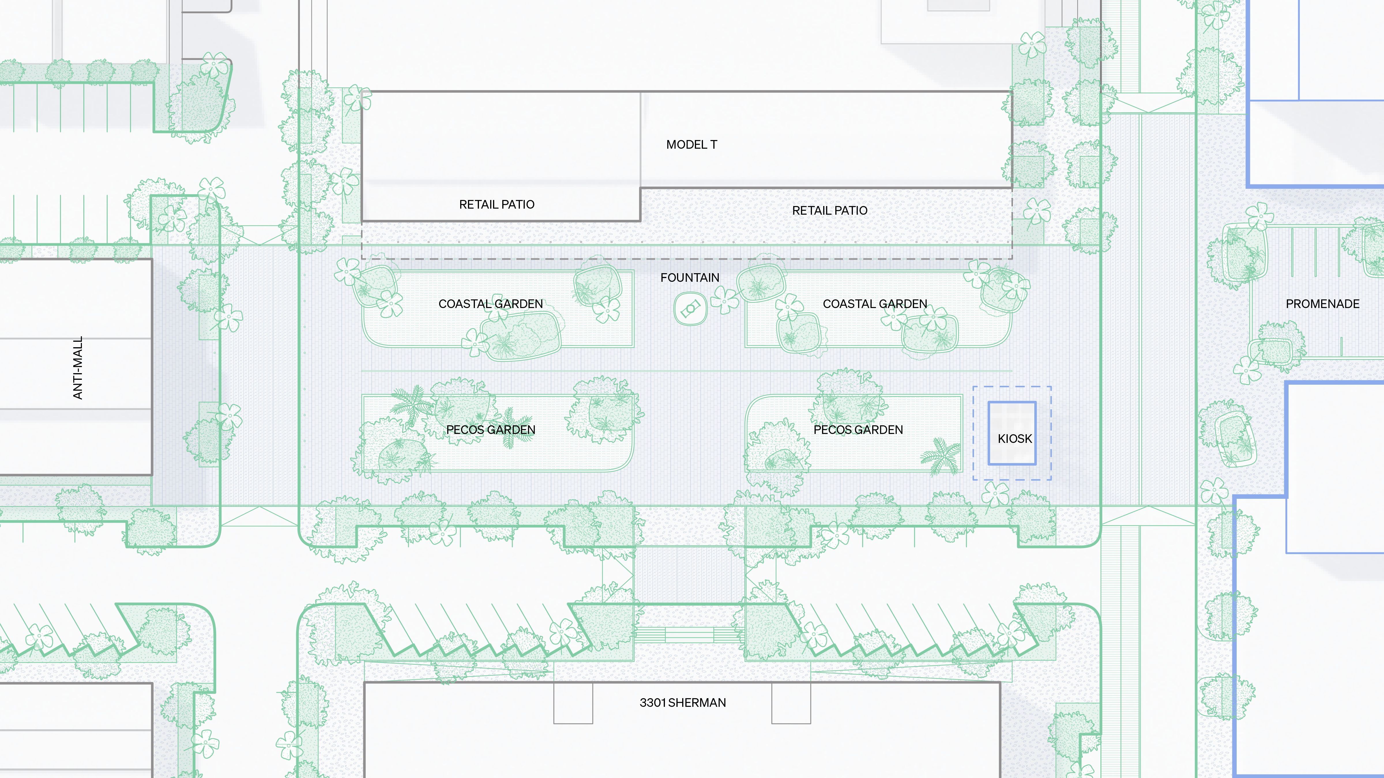 For each of the roughly dozen new development sites, Utile created test-fit scenarios that explored multiple combinations of building typologies and programs, including multifamily over garage and retail, townhouse, high-rise office, stand-alone retail, and other publicly oriented uses. Test-fit scenarios were closely aligned to the proposed framework plan such that ground floor retail, parking, and vehicular access were strategically located to best enhance the pedestrian experience, particularly along the promenade.