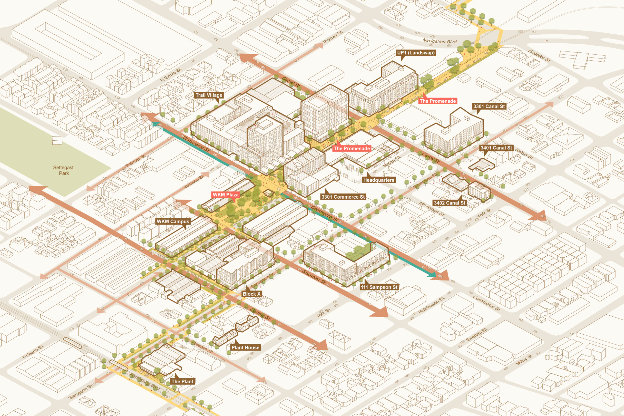 In close collaboration with Houston-based landscape architecture office Dept., Utile developed a scatter-site master plan for forward-thinking developer Concept Neighborhood that leverages their portfolio of sites to frame a public and active promenade connecting the MetroRail Green Line (Coffee Plant/Second Ward station) to the Buffalo Bayou eastern riverfront trail. The master plan carefully weaves new development sites and scenarios around existing historically-significant warehouses slated for adaptive reuse so that both mutually complement and enhance each other.