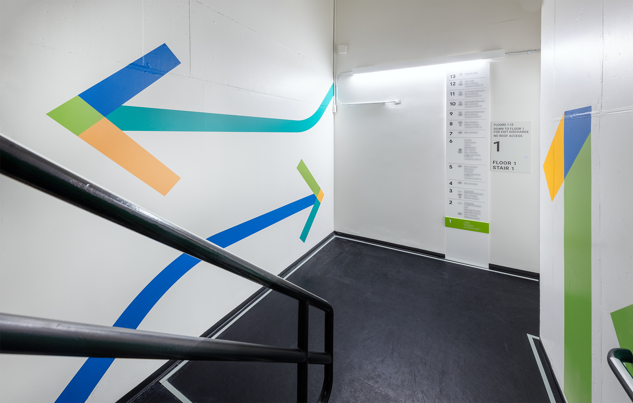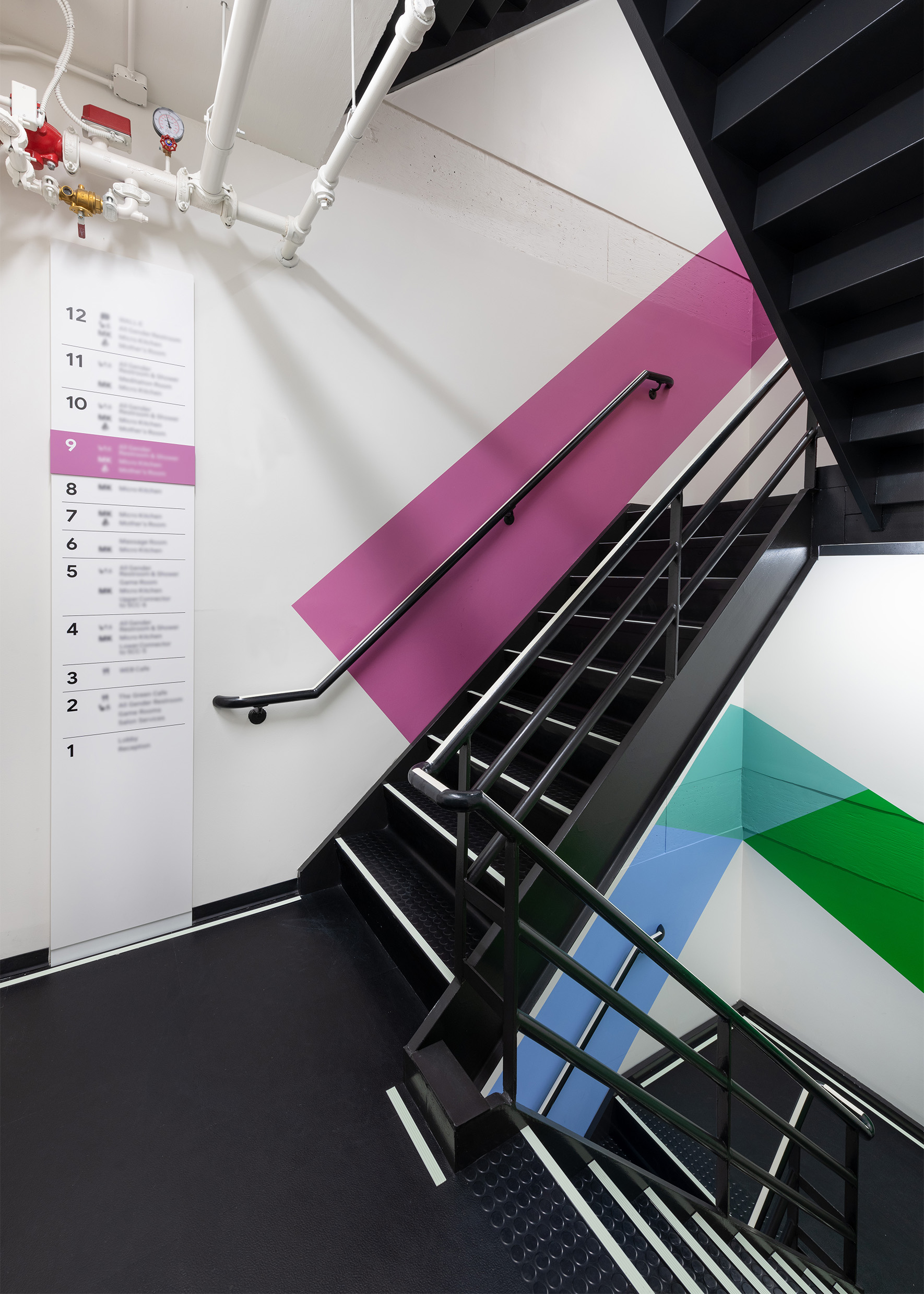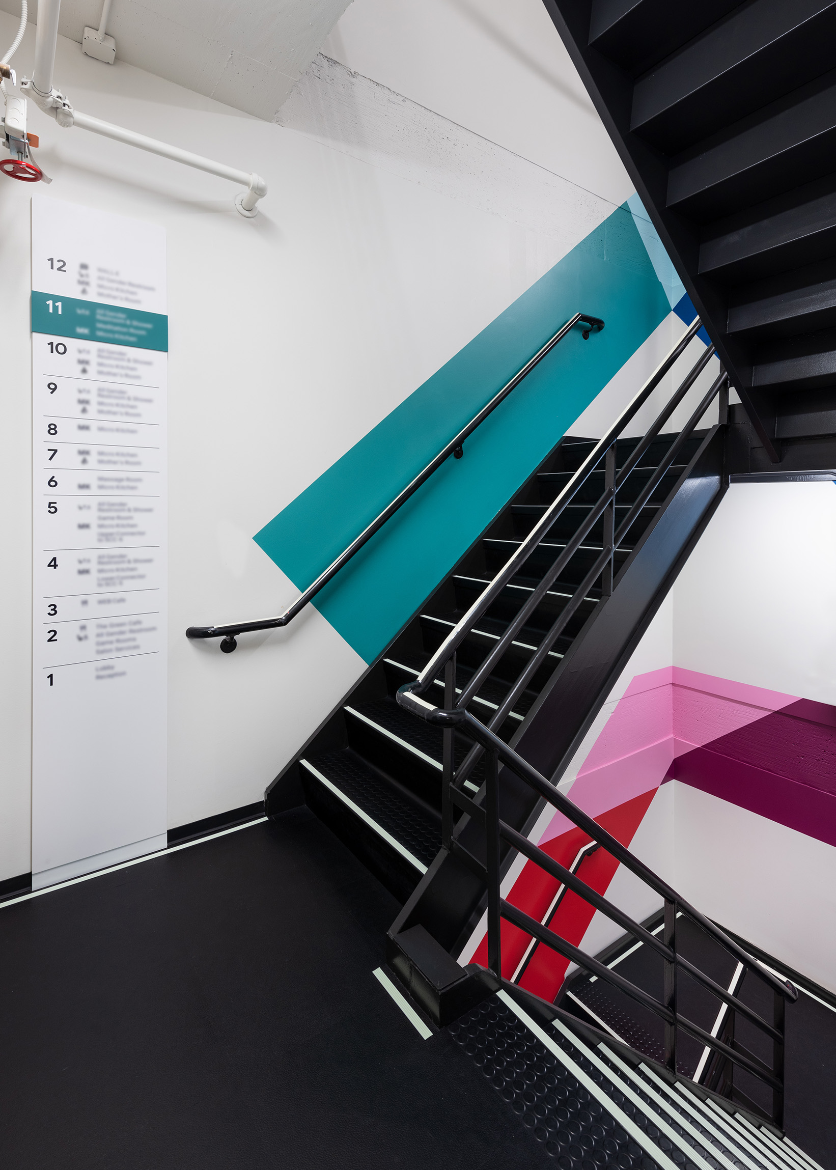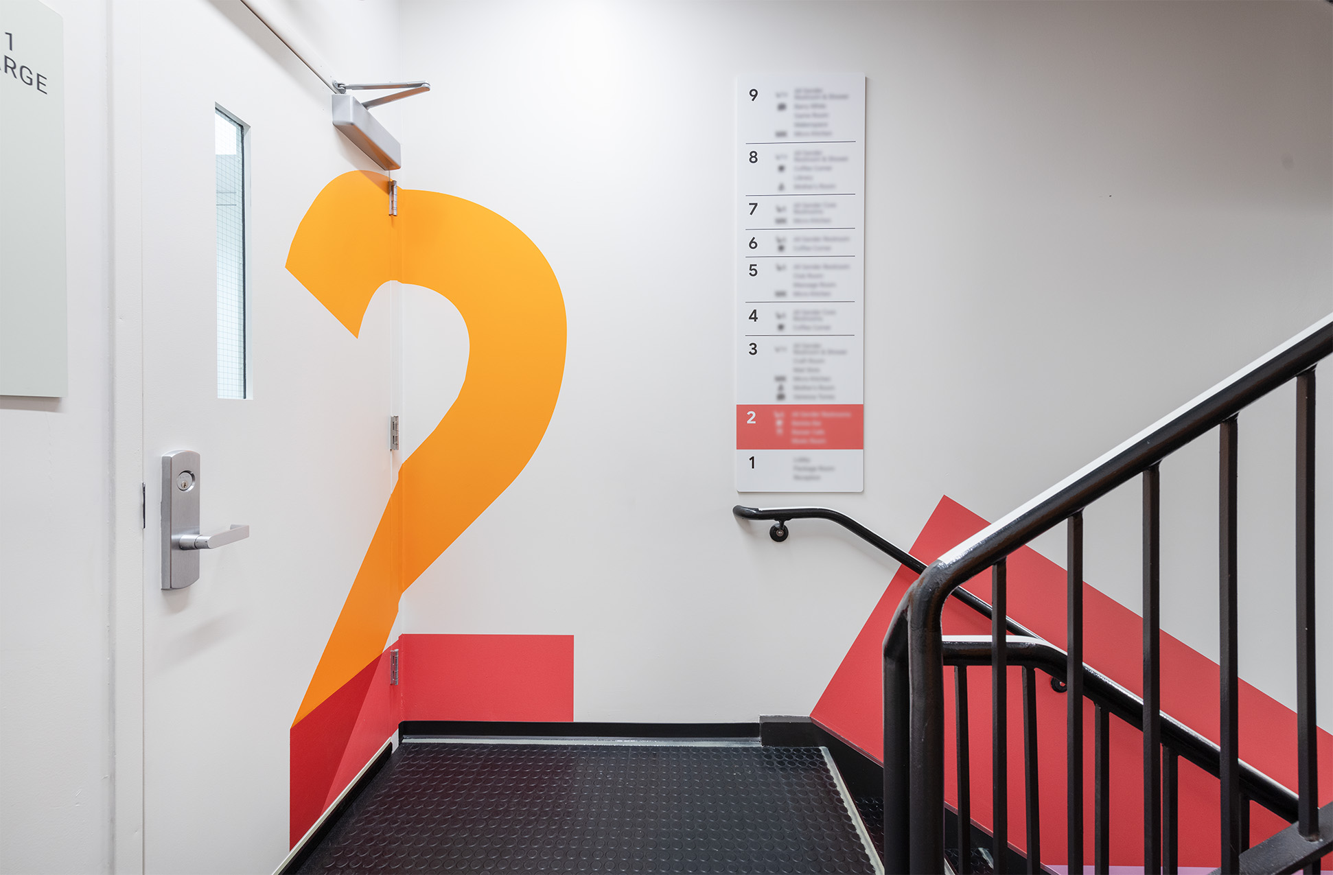 As part of the Wayfinding Master Plan, each floor on campus is assigned a unique combination of four colors that compliment the interior finishes of that floor. Those colors appear on signage and graphics throughout the floor and in the stairs to reinforce level identification: a series of horizontal bands connect floors from one landing to the next, playfully shifting and overlapping, their colors blending from one unique palette to the next; large numerals wrap around the corner and cover the door, unmistakably announcing the current floor level; thermometer-style signage identifies key amenities and destinations throughout the entire building; custom graphics orient users on the ground floor to their surroundings.