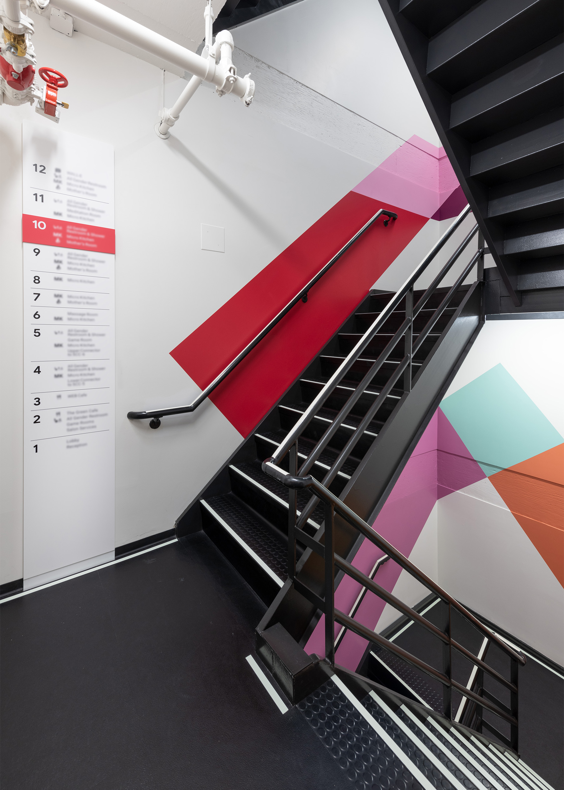 Following a comprehensive Wayfinding Master Plan developed by Entro for a global technology company, Utile was asked to update the buildings’ egress stairs to implement the newly developed wayfinding principles. As the sole tenant of the buildings that comprise the campus, the company’s employees often use the building core stairs as an easy means of circulating to the adjacent floors. Reimagining the stairs was an opportunity to take something as perfunctory as an egress stair and turn it into a dynamic design.