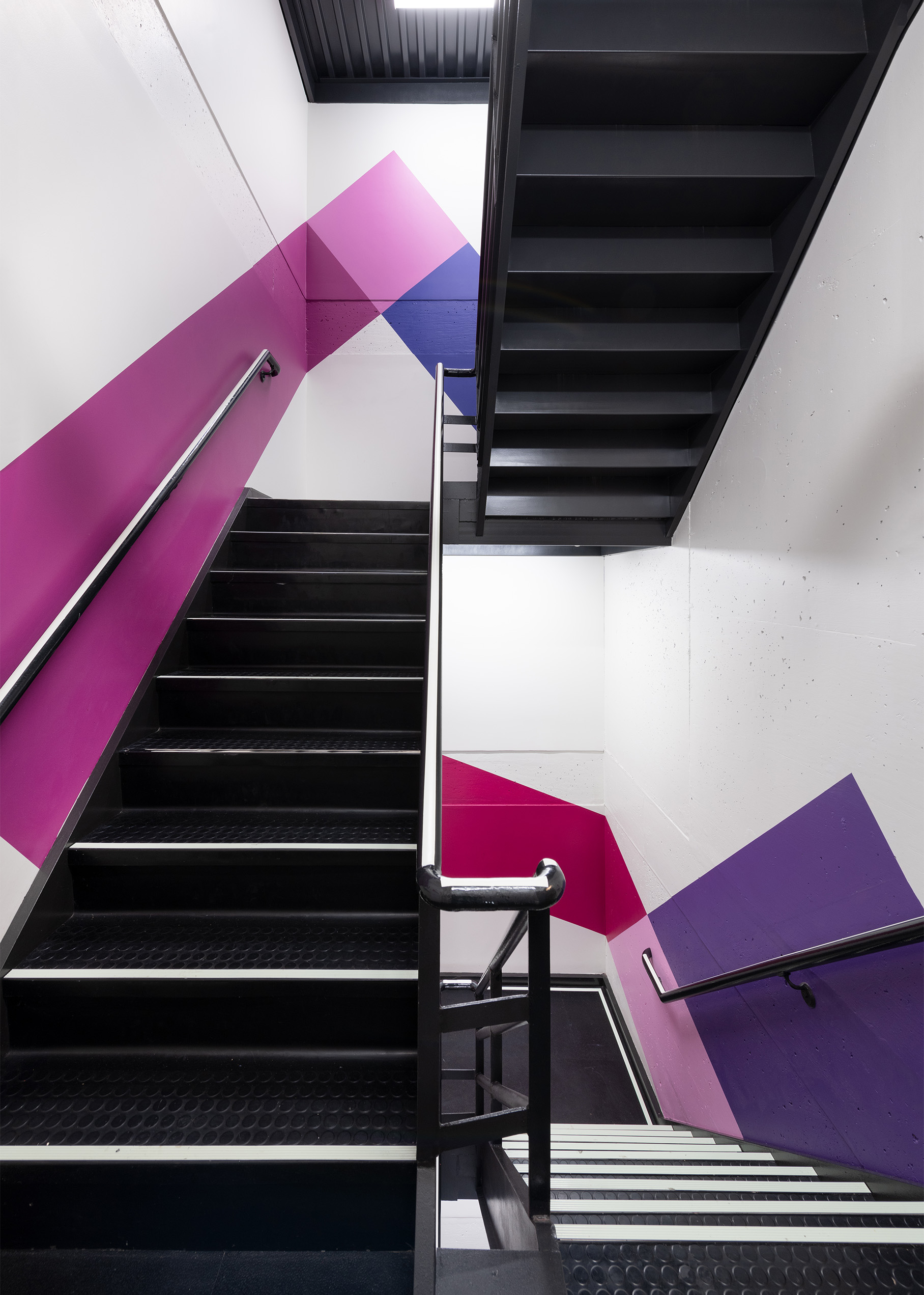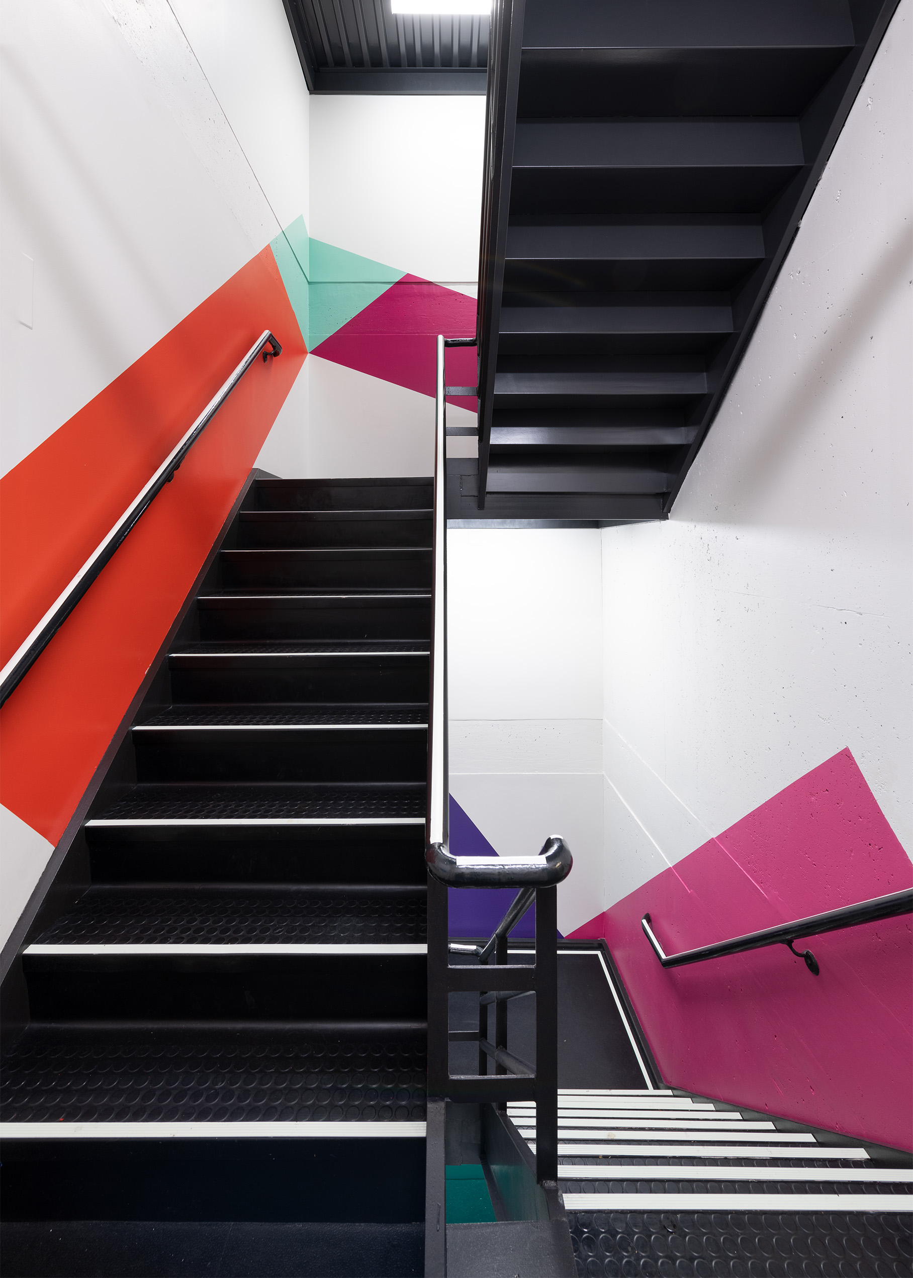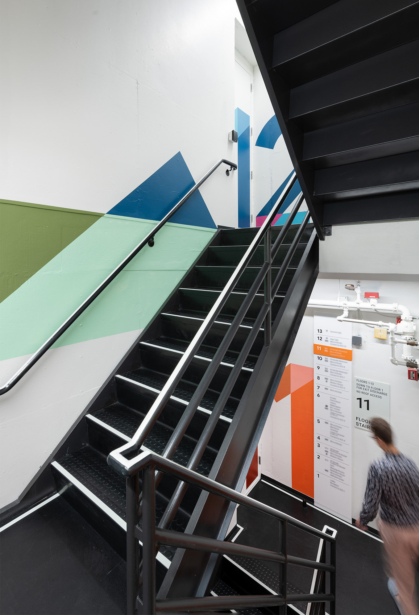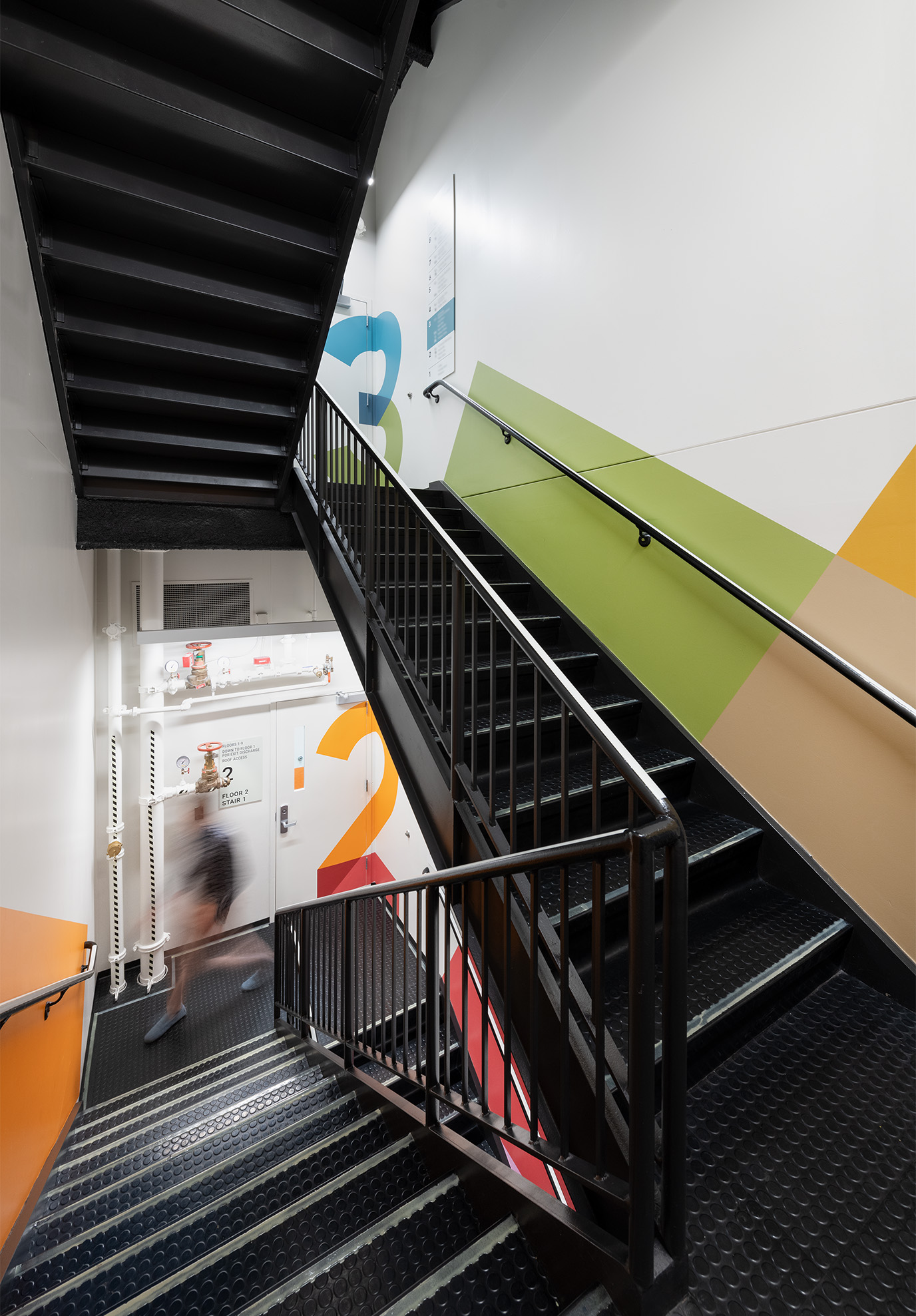 It is through these strategic improvements that the egress stairs are able to serve as one of the main arteries connecting employees and visitors across campus while maintaining the company’s unmistakably bold and playful identity.