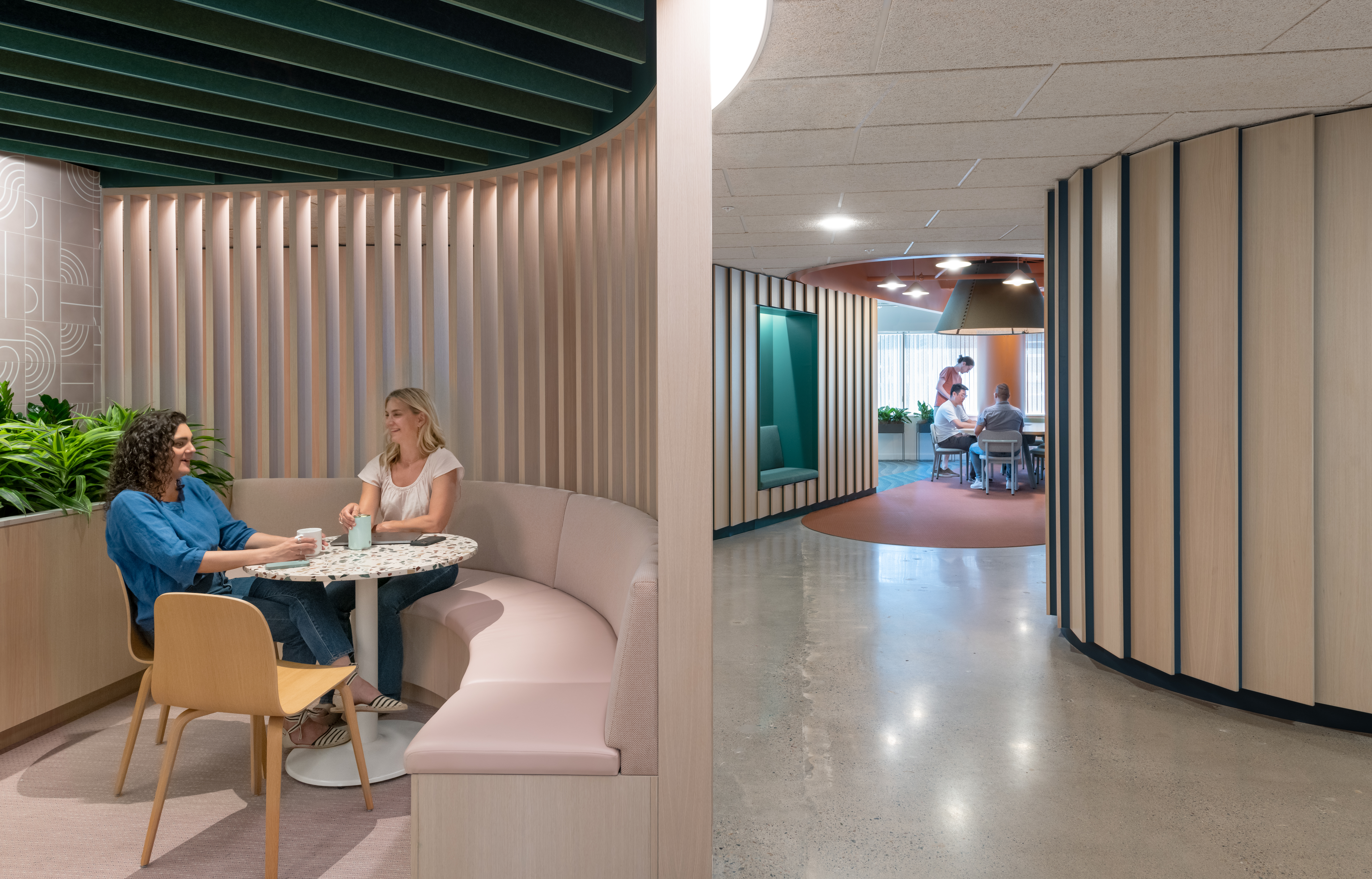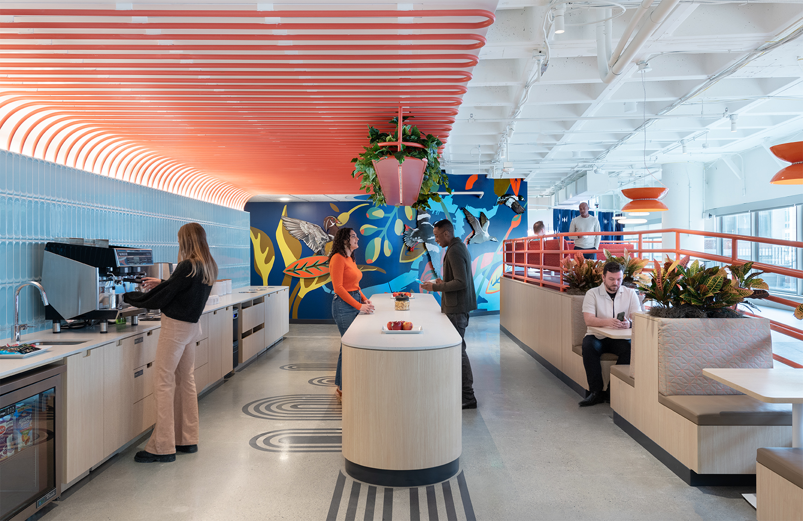 The lower level is inspired by the windswept dunes that line the shores of Cape Cod. Throughout the floor, serpentine walls clad in warm wood panels define various programmatic zones. Organized around the building core, these volumes allow users to flow in and out of meeting rooms, phone rooms, or a central micro-kitchen before reaching out to the perimeter to enjoy a series of collaboration zones and informal lounge spaces. Punctuated by immersive painted ceilings, these lounge spaces break up the open workspace and encourage users to come together, exchange ideas, and spark creativity.