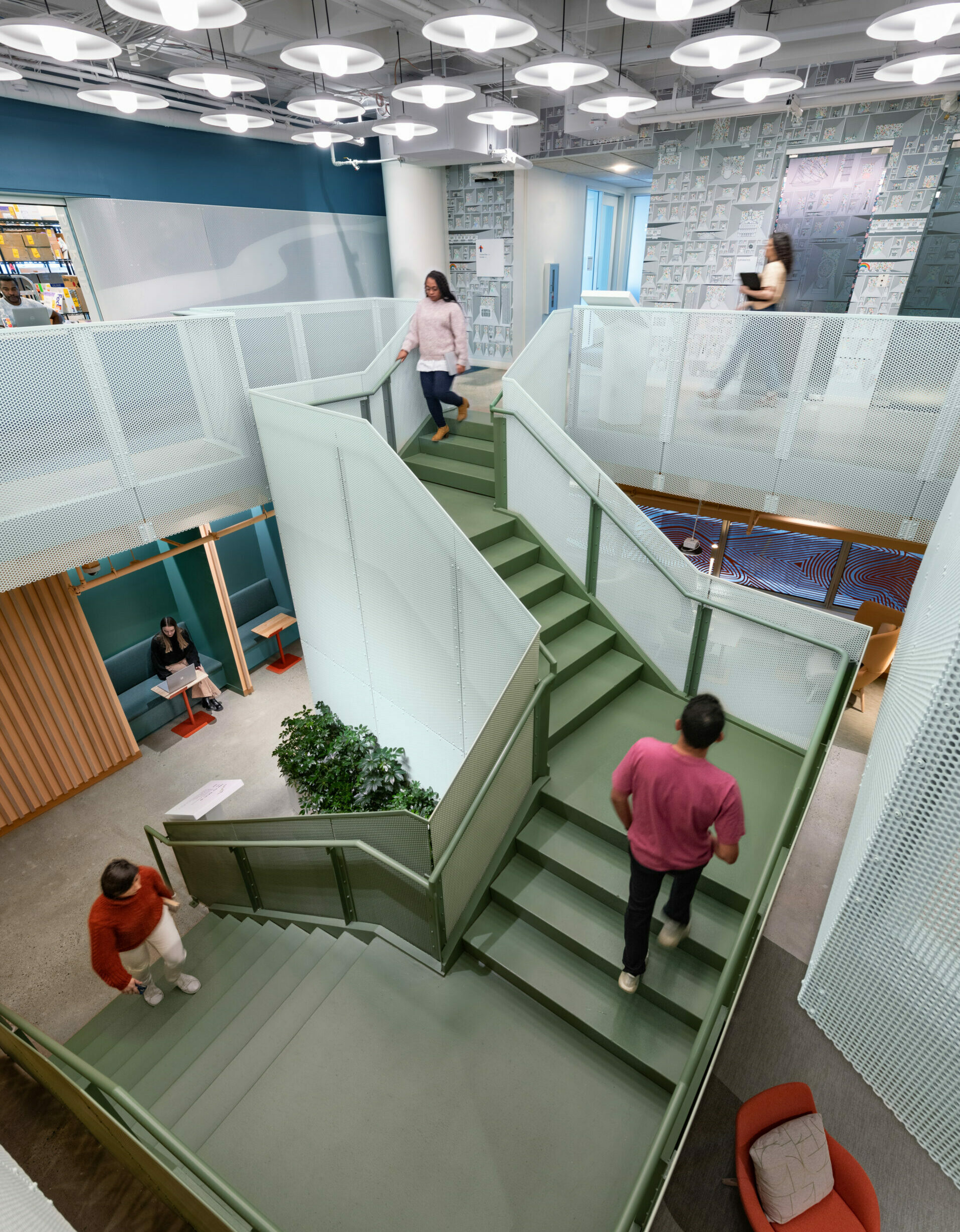 The palette on the upper floor is inspired by flora and fauna of the region’s riverbanks. Nestled within a sinuous wood slat wall, a series of color-blocked pods offer employees a dynamic mix of meeting and collaboration configurations, each separated by operable partitions to allow groups of employees to expand or contract into adjoining spaces. A range of mobile workstations and flexible furniture further allows this new type of workspace to adapt and change as the role it serves continues to evolve. Just outside these pods, more traditional programming supports the remaining workspace: a series of meeting rooms, a micro-kitchen, and a mix of open lounge areas. A perforated metal panel stair transitions the palettes from one floor to the next.
