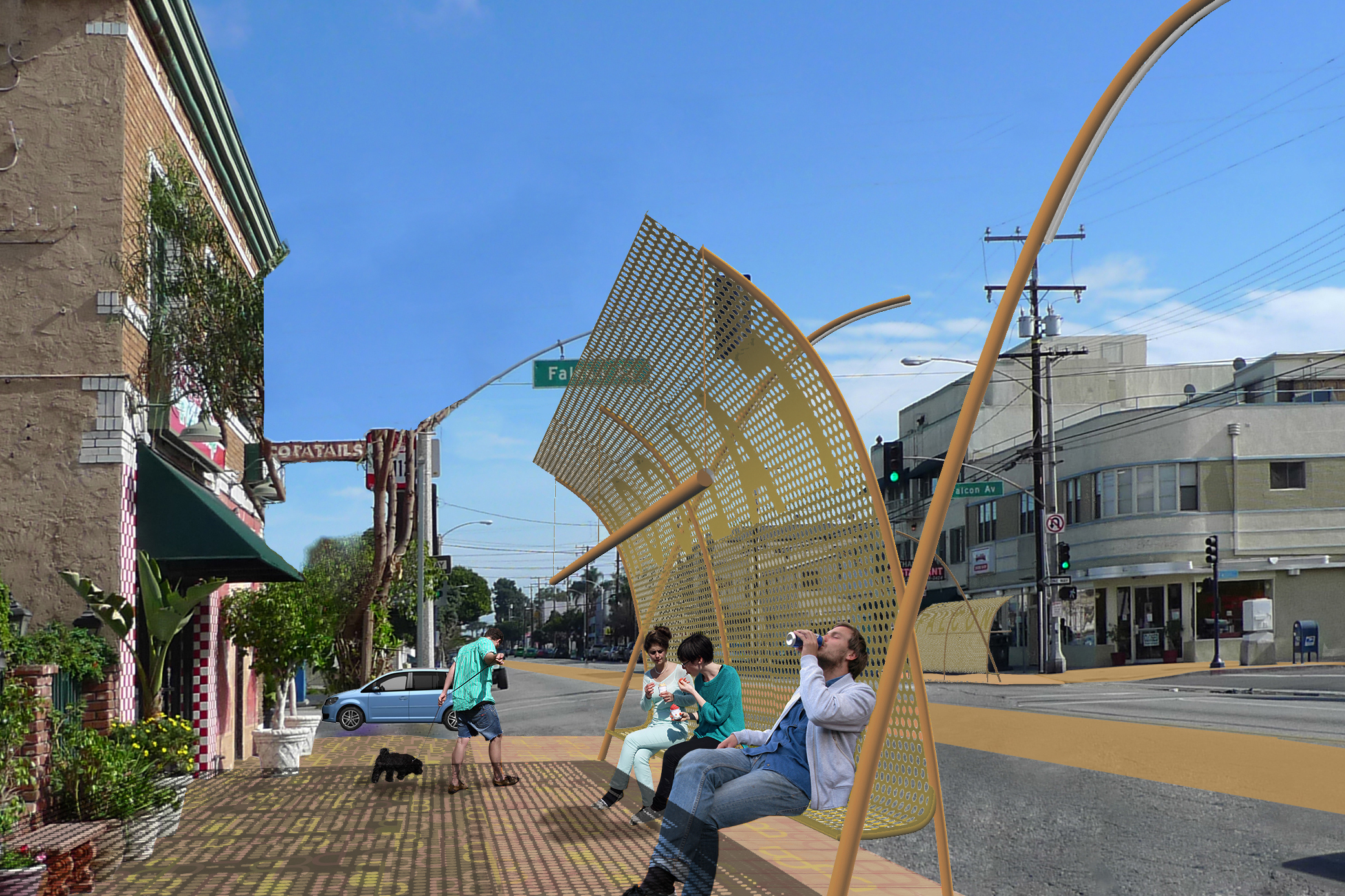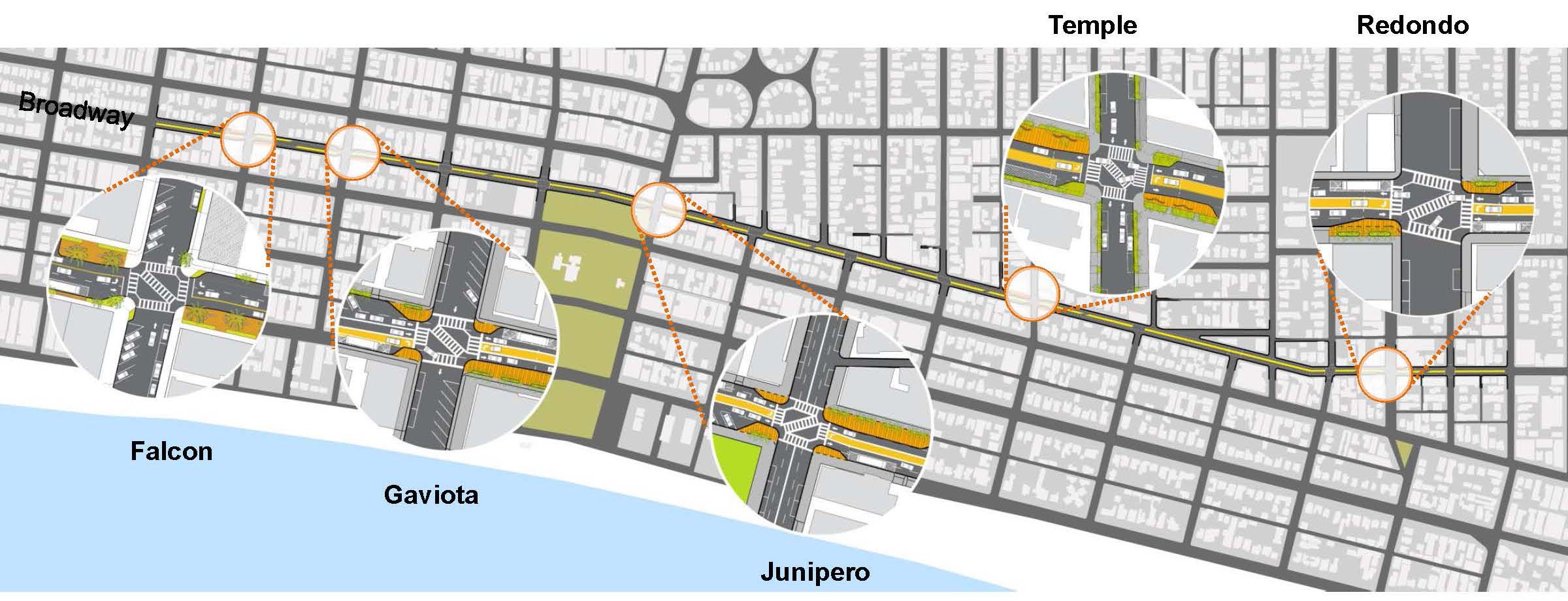 On 7th Street, a heavily-trafficked commercial thoroughfare passing through the entire city, attention was focused on locating more frequent crosswalks, supported by the utilization of over 45,000 SF of dead-zones in the medians of the five-lane corridor, when not occupied by left-turn lanes. The new center strip is to serve as a citywide directory or wayfinding device for visitors using 7th Street as a means of entry into the city, looking for its numerous region-wide destinations (Queen Mary, Belmont Shores, etc.). It in addition serves as a “safe landing” point for crosswalks, as well as to break the width of the street into two more pedestrian-scaled experiences.