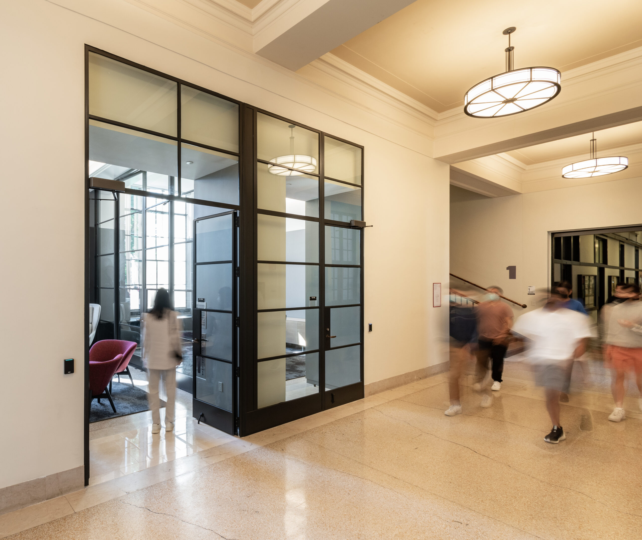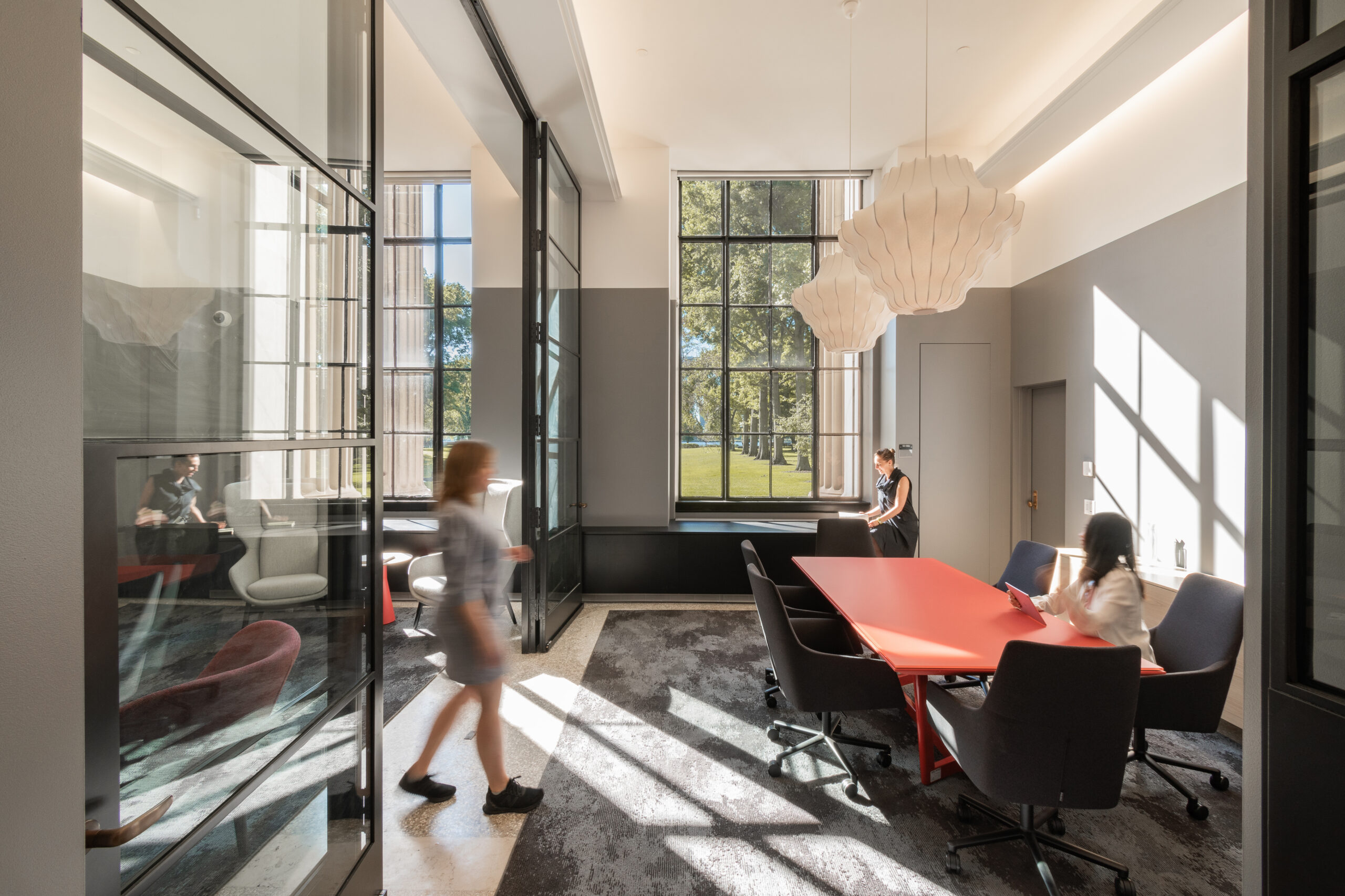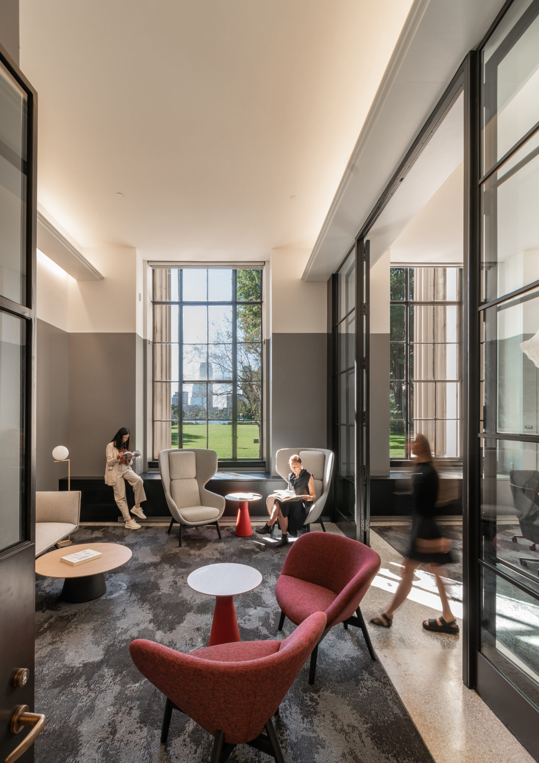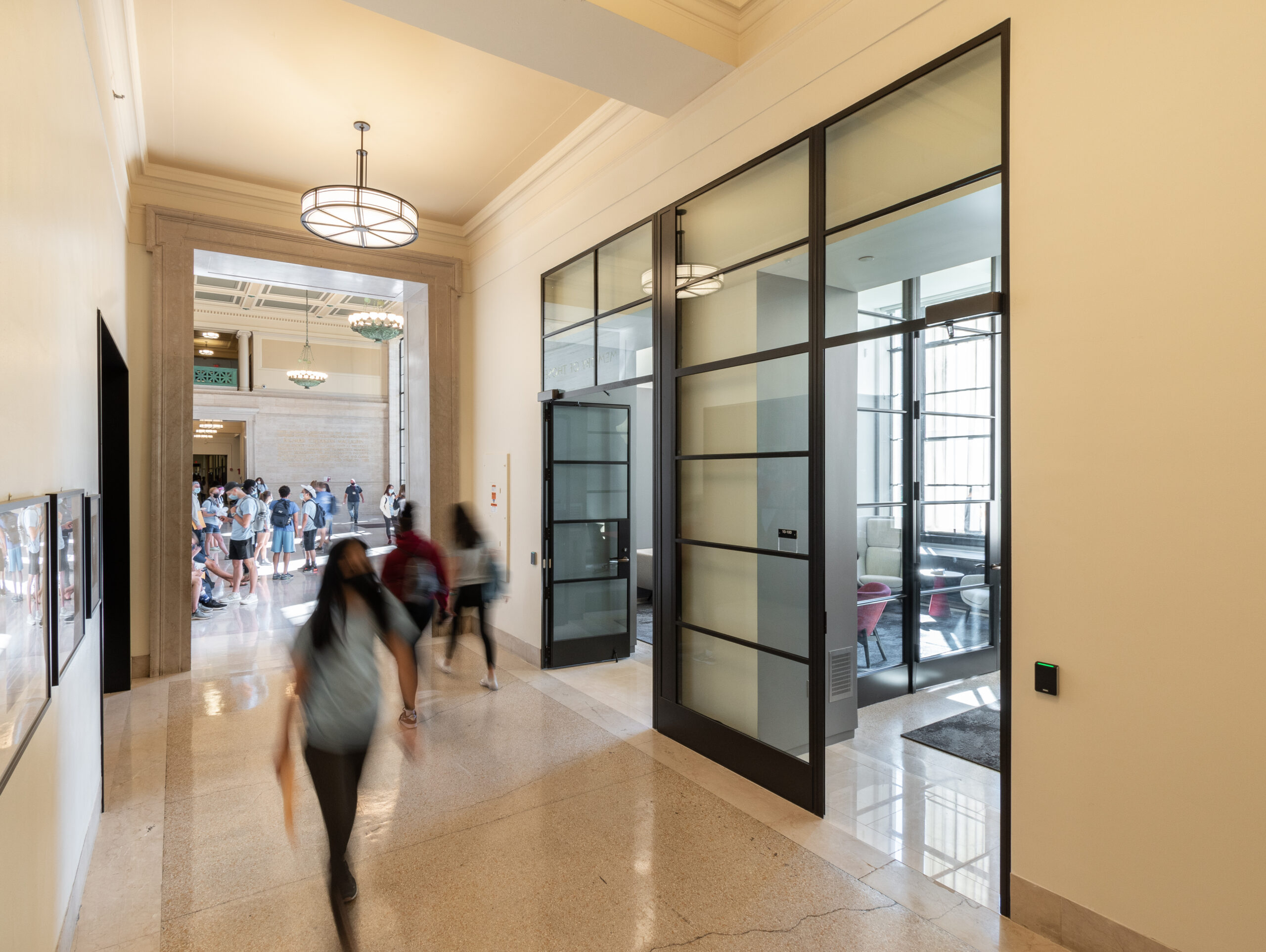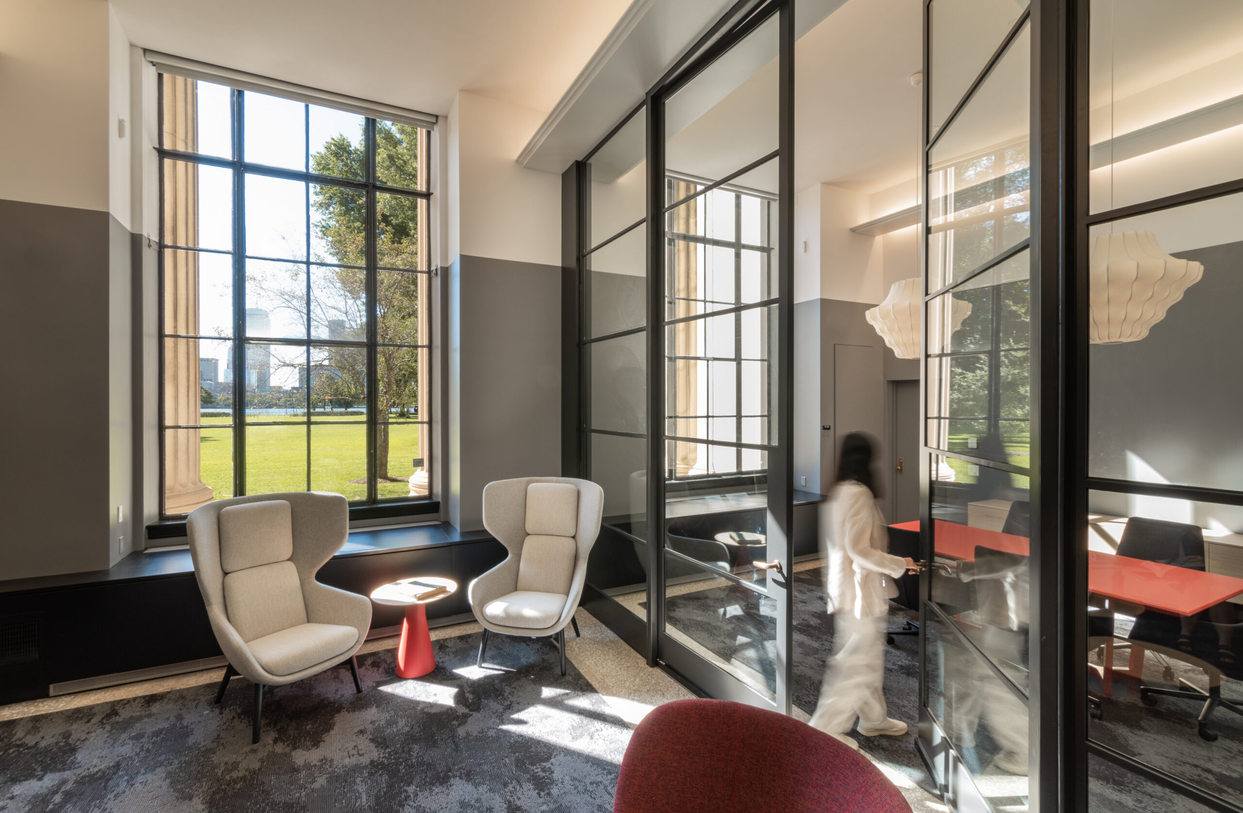 By opening up an existing wall between corridor and room and replacing solid wall with steel framed glazing, the entrance to the room now allows for borrowed light to pass into the formerly opaque corridor, helping to connect interior space to Killian Court and the Charles River just beyond. Within the room, new LED lighting is concealed in shelves and slots built off the existing beams, highlighting existing structural and spatial characteristics of the room, while concealing light sources. Existing wall-to-wall carpeting was removed to reveal original terrazzo and concrete beneath, which has been sanded and buffed to allow for the floors to be a continuation of the language of the corridor and historic architecture. In addition to these moves, the room features a new acoustic plaster ceiling, which offers acoustic damping with a minimal reduction in ceiling height. A long millwork enclosure on the south side of the space conceals new ductwork and mechanical systems.