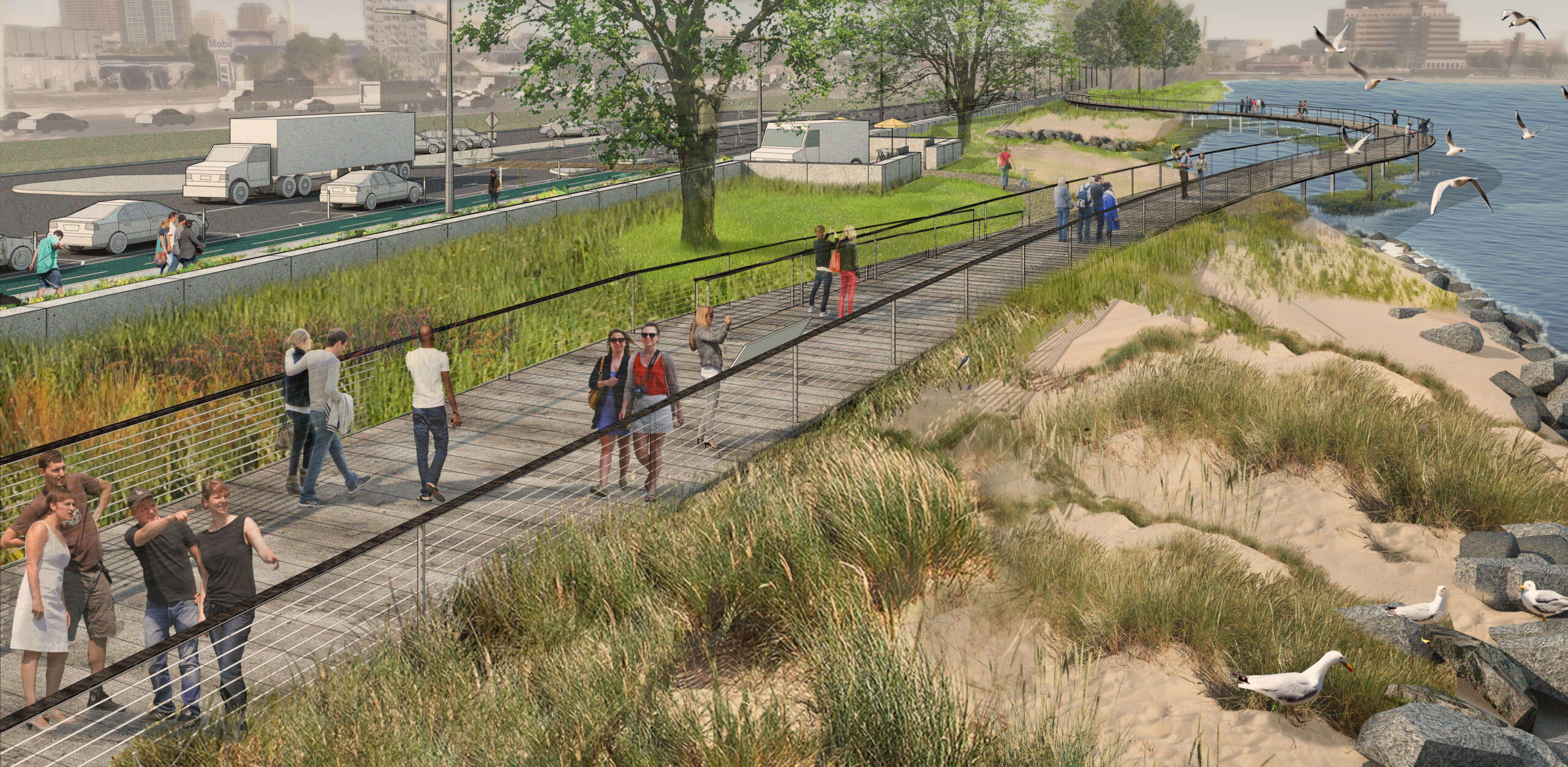 The long term flood protection strategies developed by GZA, in collaboration with BioHabitats, looked at how a combination of a naturalized “living shoreline” and hard infrastructure could be employed to prevent future flooding. This long-term scenario was an opportunity for Utile and GZA to develop a redefined Long Wharf Drive and waterfront. Utile insisted that the true experience of the waterfront should be felt along the shoreline itself, through at-grade paths or an elevated boardwalk system.