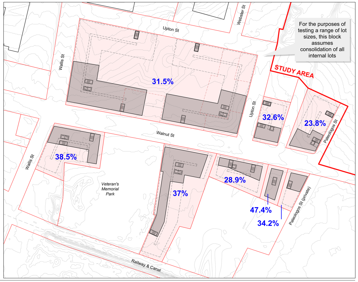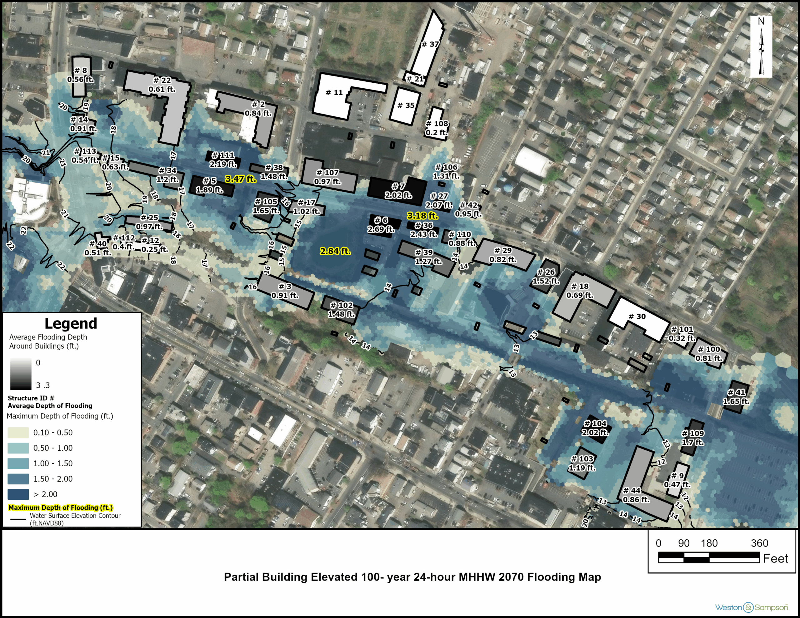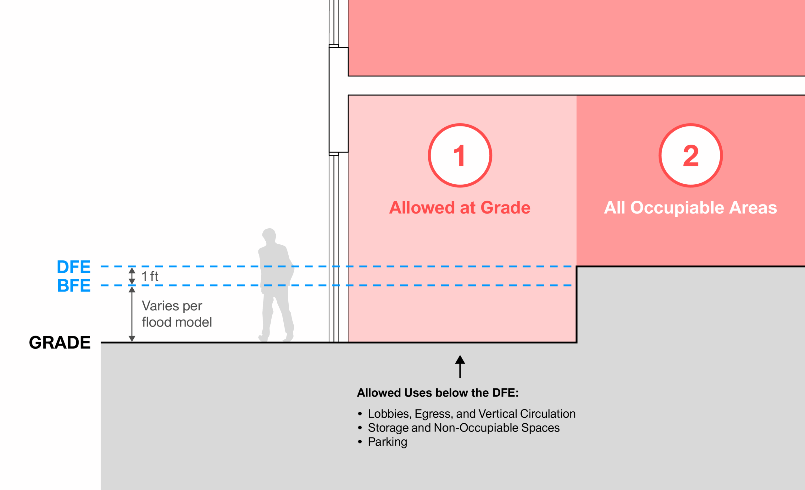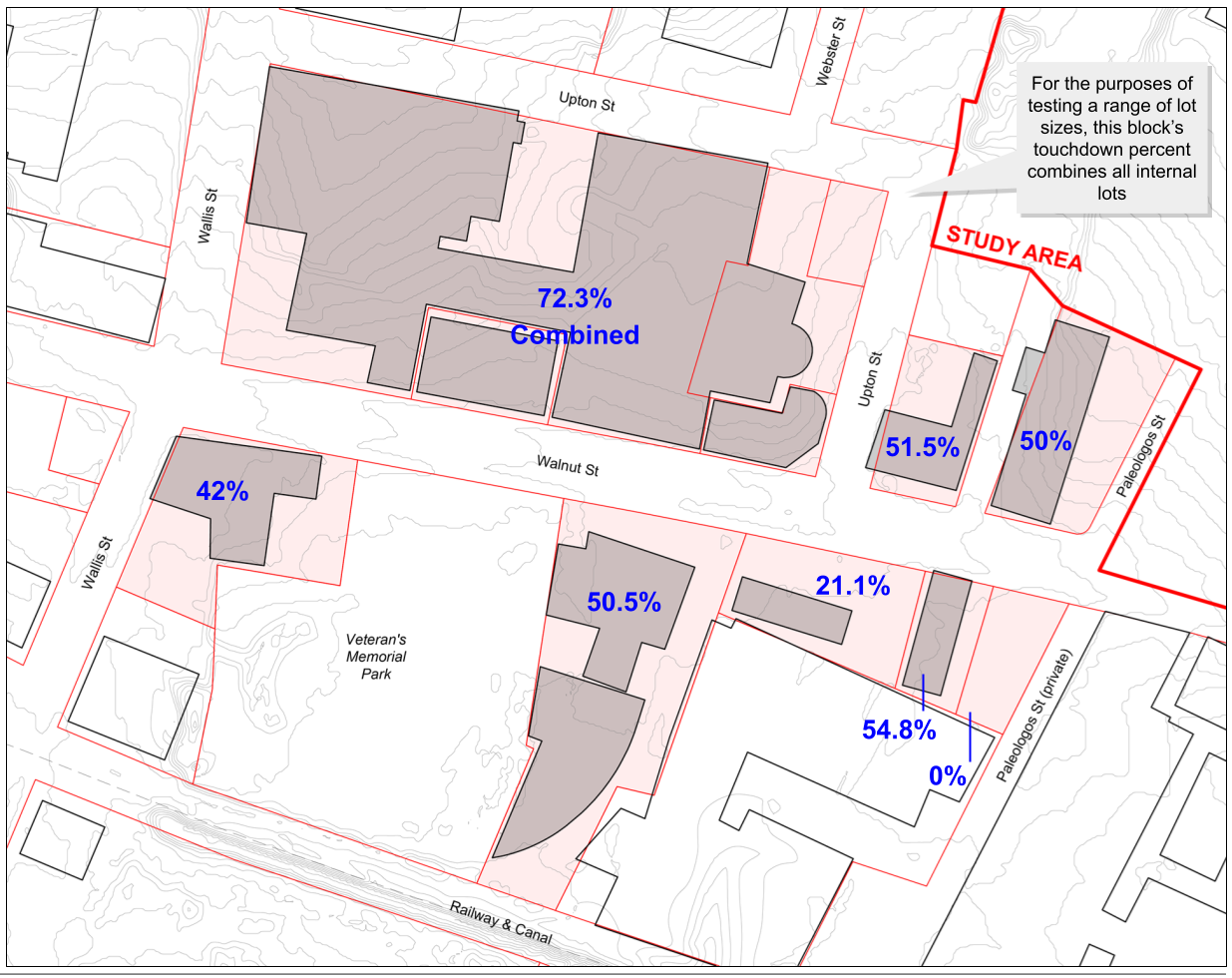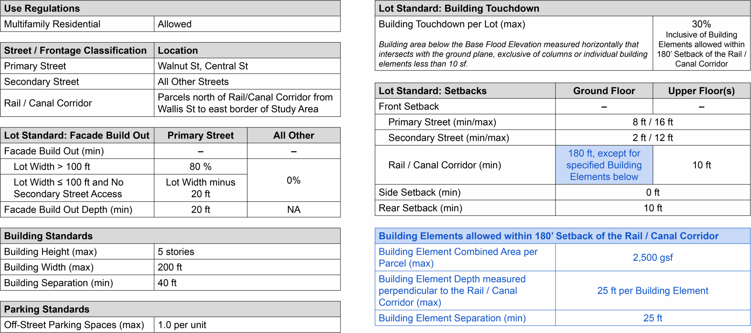 Weston & Sampson’s flood models showed that removing buildings from the floodplain (such as by elevating them) provides flood protection for both said buildings as well as other buildings in the study area. As such, to promote floodwater drainage and maximize flood protection for buildings, Utile created zoning recommendations that limit what can be called “Building Touchdown,” defined as building area below the Base Flood Elevation that intersects with the ground plane, exclusive of columns or small individual building elements. Test-fits and flood modeling show that a 30% limit on Building Touchdown balances maximizing flood protection and staging an active street edge along Walnut St, the main urban corridor in the study area.