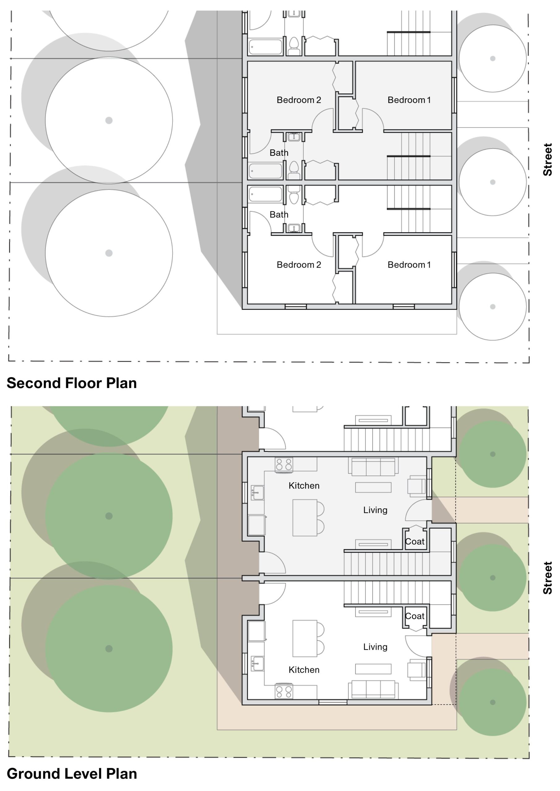 Informed by a parcel and land use analysis, we generated two new housing types, the Carriage House and the Triplex, designed to be compatible with the physical character of the neighborhood and size of parcels. A single type/scattered site development approach was recommended in order to benefit from economies of scale, with at least 6-8 Triplexes or Carriage Houses constructed by a single developer/contractor.