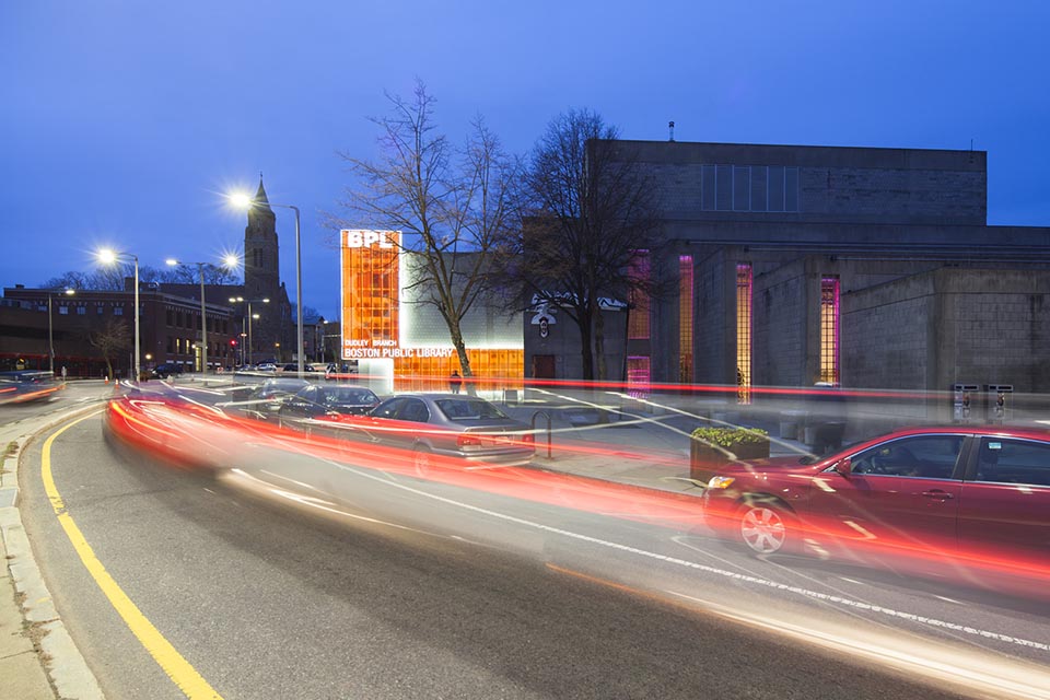 The entrance design centers on a new signage marquee. Made of a backlit custom printed perforated aluminum, the marquee fills an urgent wayfinding need for the library. It emerges from the front door, hugging the wall to frame the approach to the entry, and ultimately rises above the building to better announce its presence from Nubian Square. The marquee is composed of perforated aluminum and is backlit in a manner to soften what is otherwise a very cold and austere concrete and block facade. The intent is to bring the vitality of the library’s interior to the exterior of the building. Further, the custom printed graphic on the marquee works to bring a sense of warmth, texture and playfulness to the building’s exterior.