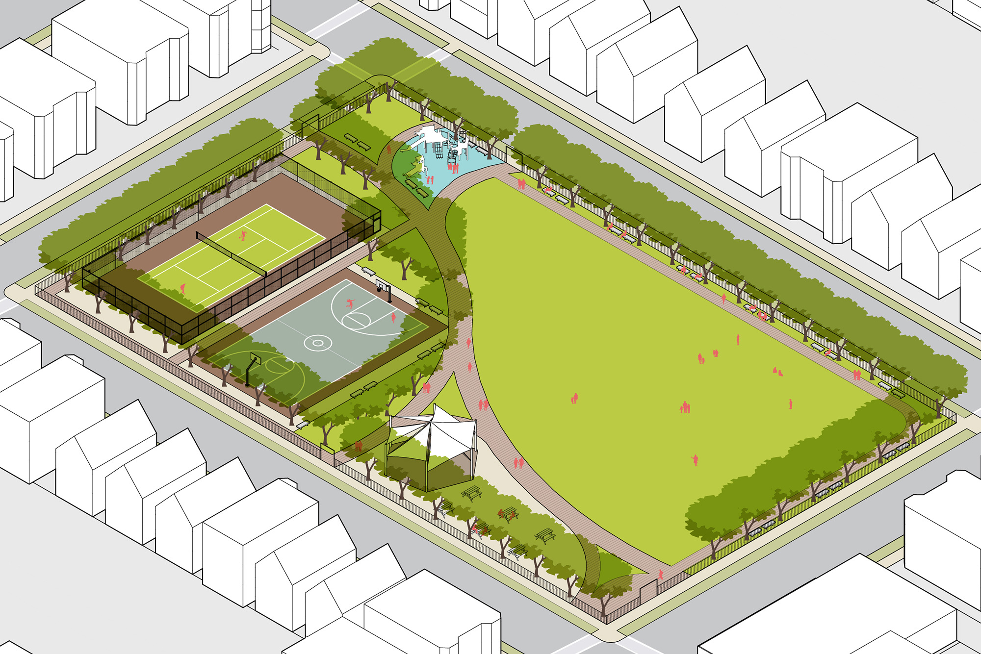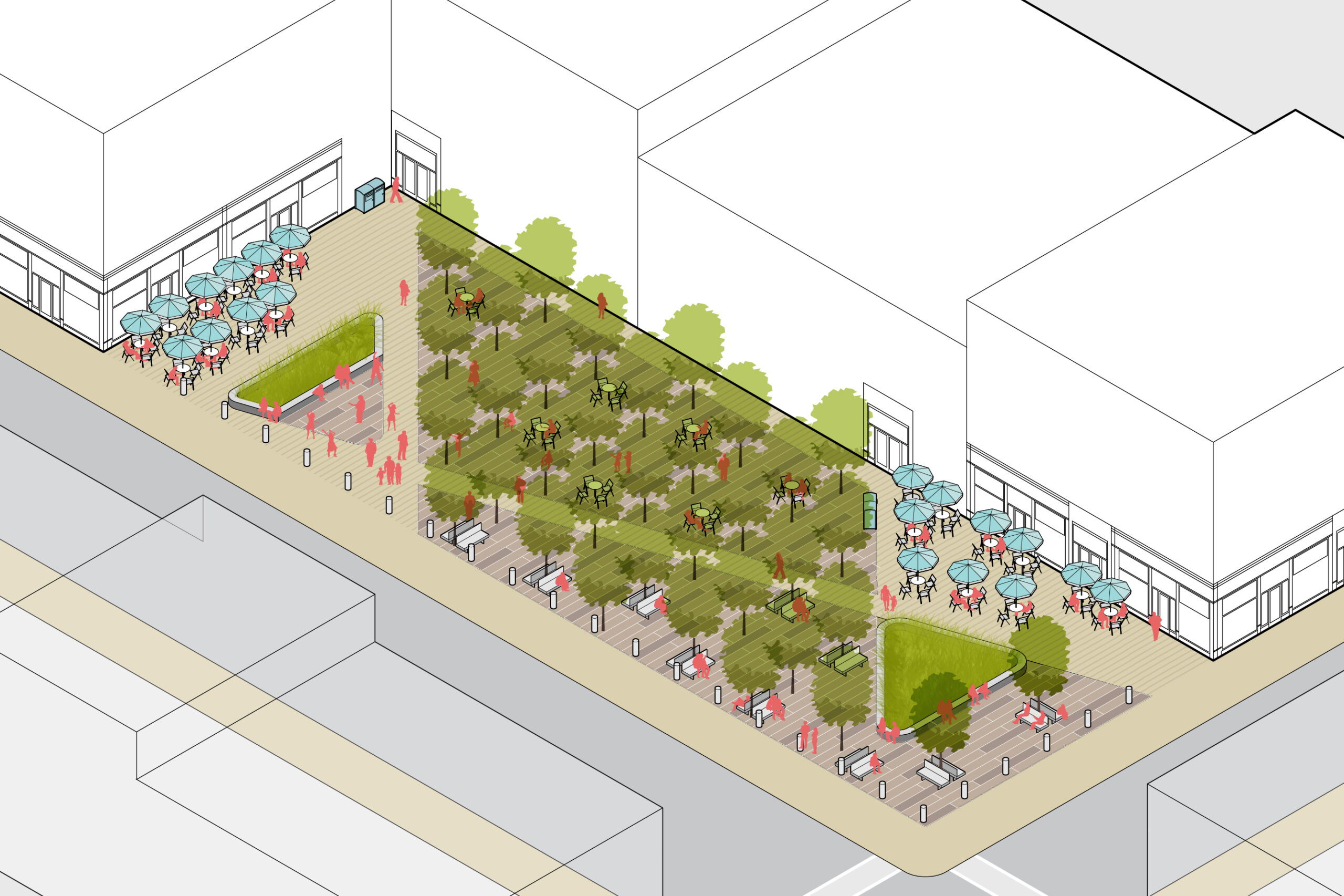 Utile also provided Open Space Typologies; illustrative graphics that easily translate the code standards and make the ordinance clearer to read, understand, and ultimately ensure that it is more customer-friendly. Unique from most zoning codes, the City of Somerville is also regulating programmatic and design requirements for different types of open spaces. Utile produced these illustrative typologies to translate these requirements by producing caricatures of what such open spaces might look like, while still highlighting how program and design requirements might be incorporated.