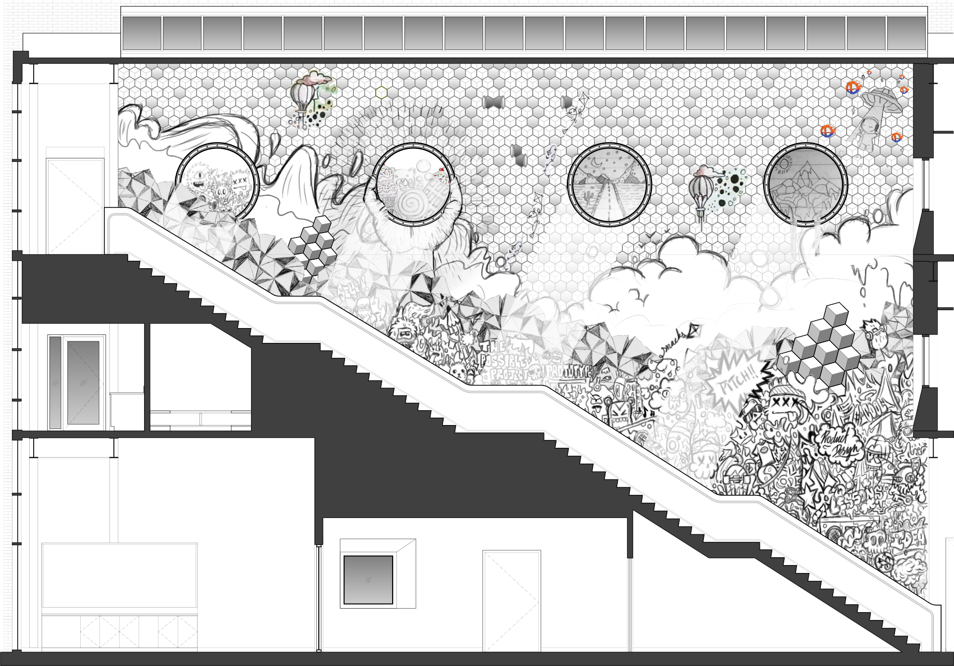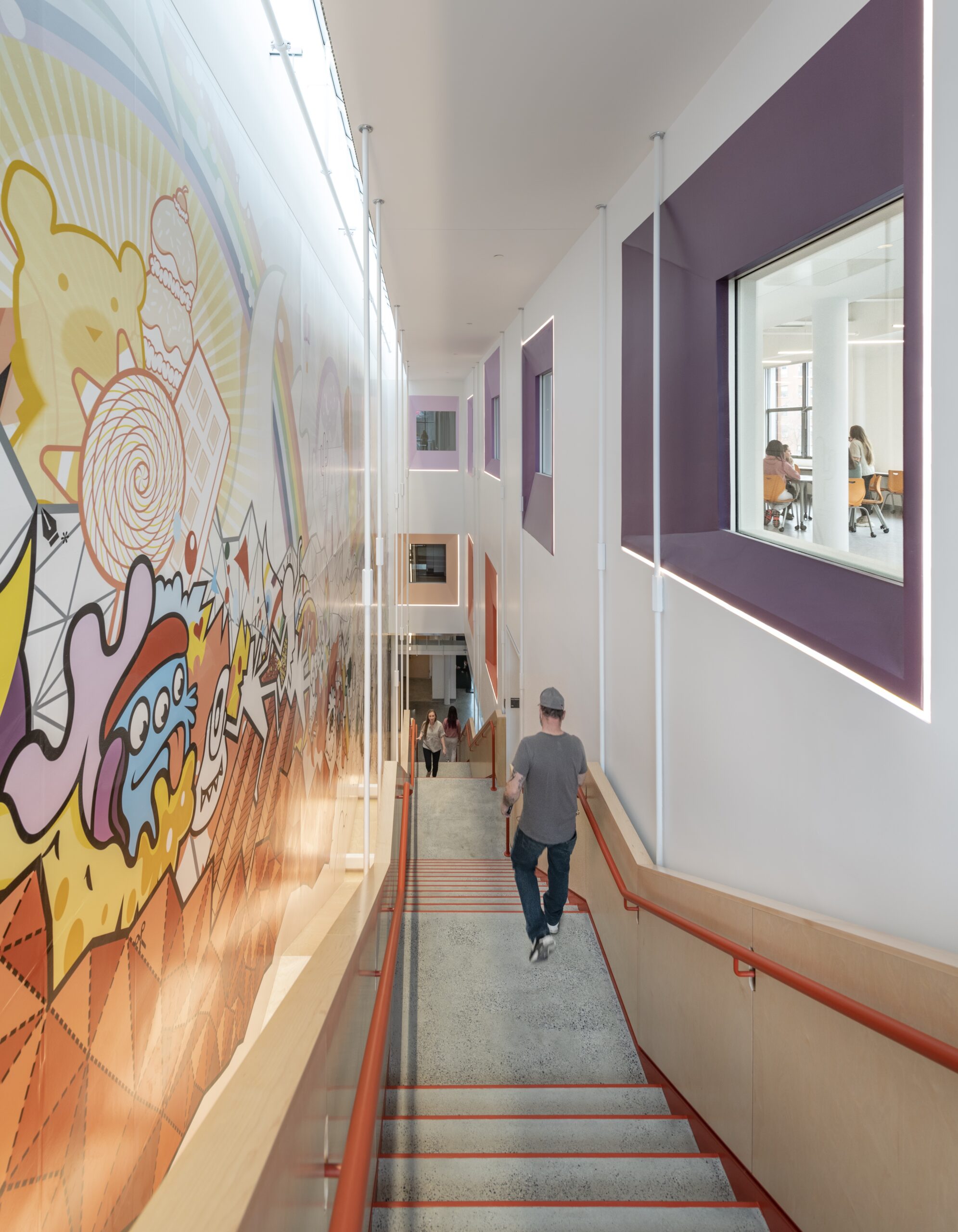 Utile worked with the students to create a layered composition with the goal of creating an illusion of depth in the narrow stair atrium that would house the graphic. The completed artwork features a cascade of characters that tumble down the stairs only to get caught by the railing at the bottom. Behind the characters, a rainbow juts between waves, clouds, and a rocky, triangulated landscape while a series of vignettes located across from the building’s meeting room windows define the background of the graphic.