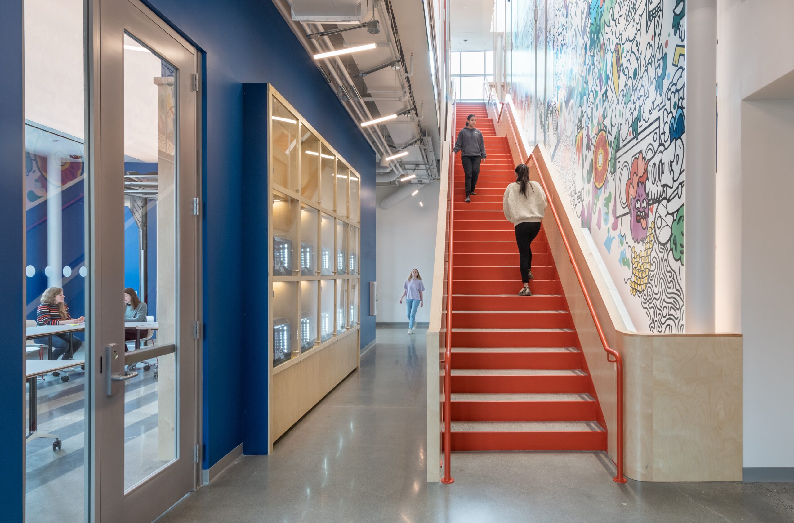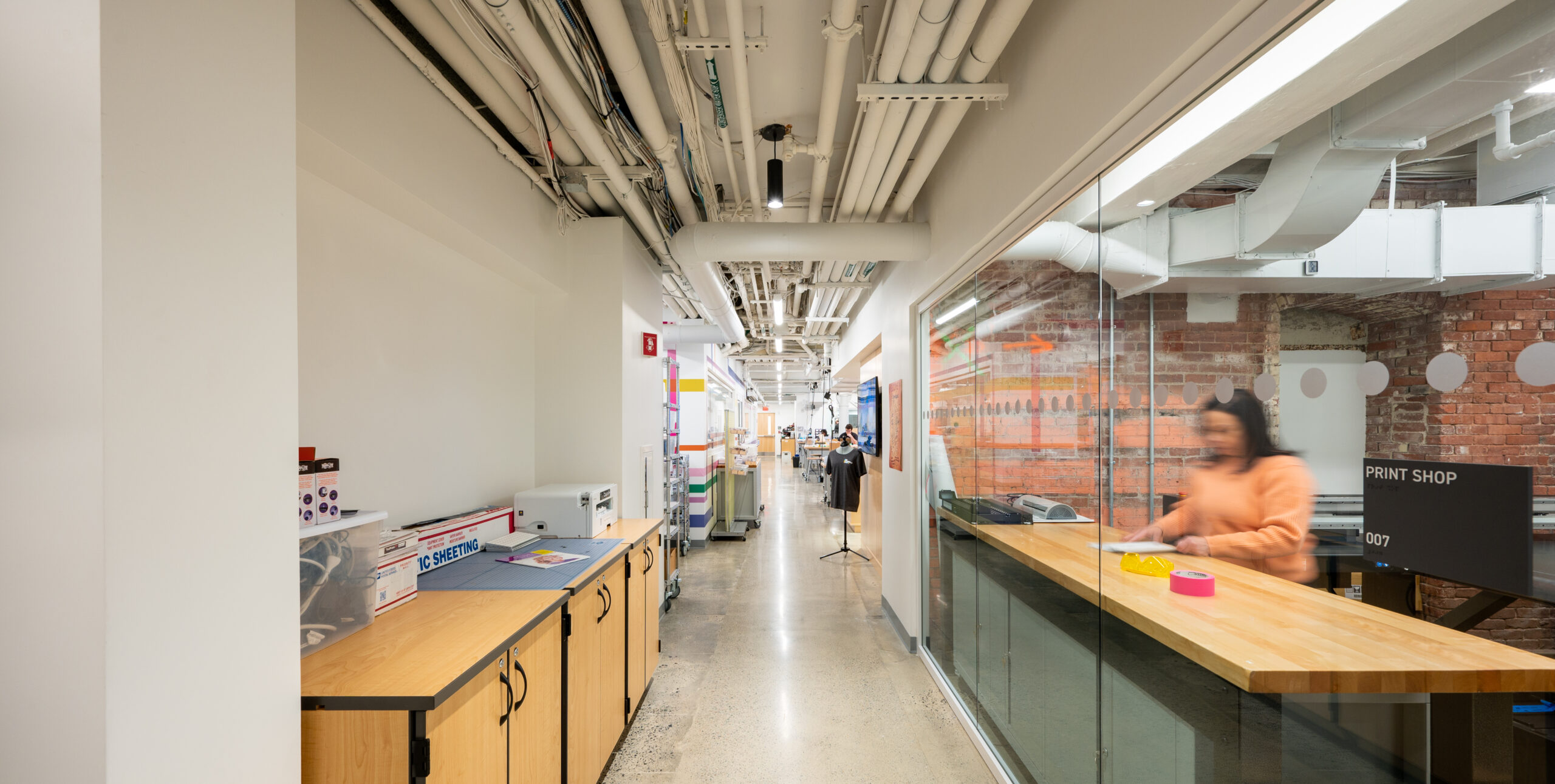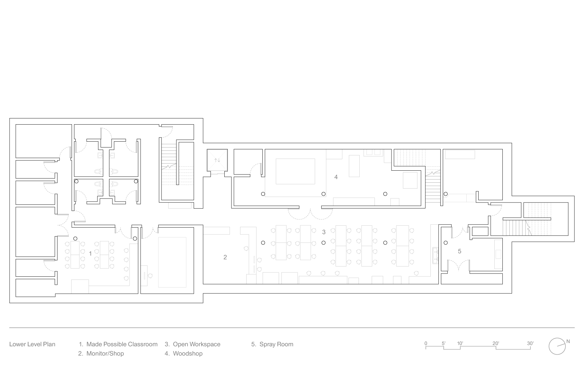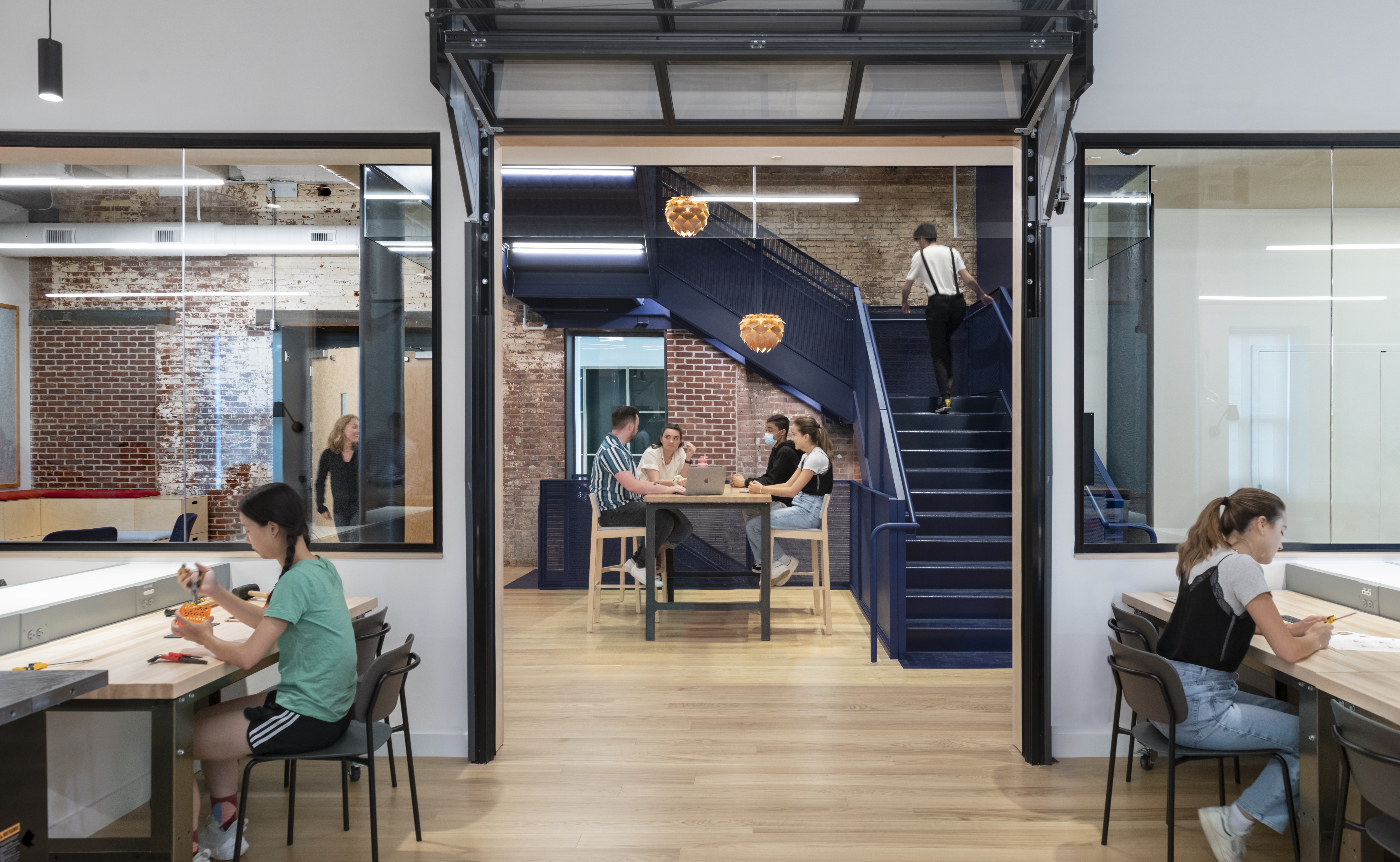 The existing building comprised two connected but spatially separate parts: an 1890s masonry, timber, and iron structure, built as a brewery, and a 1990s steel and concrete addition. Post-renovation, these parts house seven teaching studios with integral makerlabs, a large makerspace with state-of-the-art equipment, staff and community workspaces, and flexible assembly space for programming, community meetings, and larger functions.