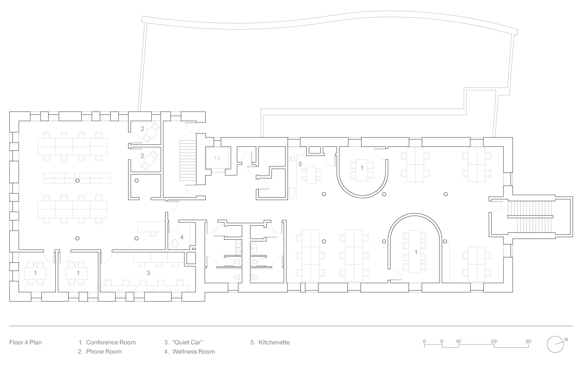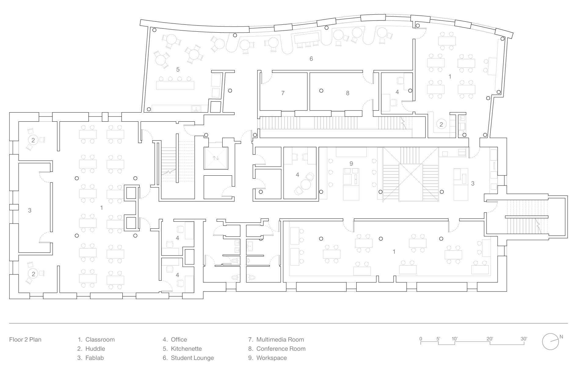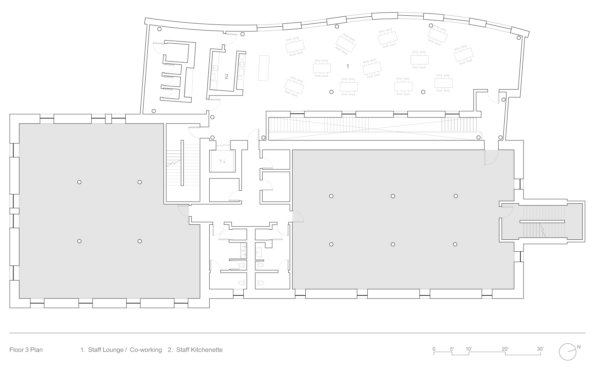 The design uncovers the original building’s structural and material logics while also breaking down the separation inherent in this two-part building to create visible, open, and welcoming spaces where diverse users commingle and collaborate. The design uses two internal stairs (one new and one retrofitted), large flexible partitions and openings, and material continuities to create visual connection between users and programs.