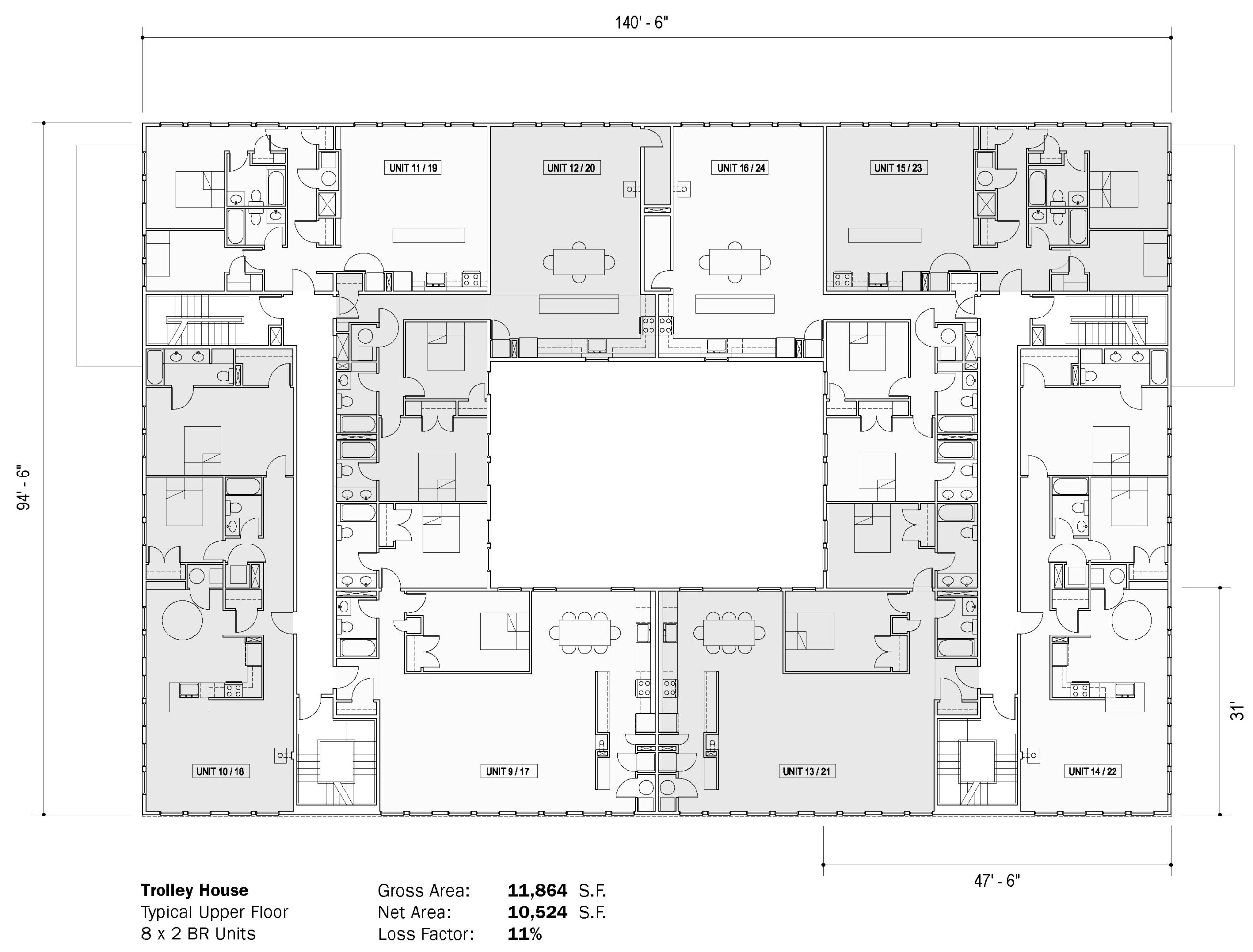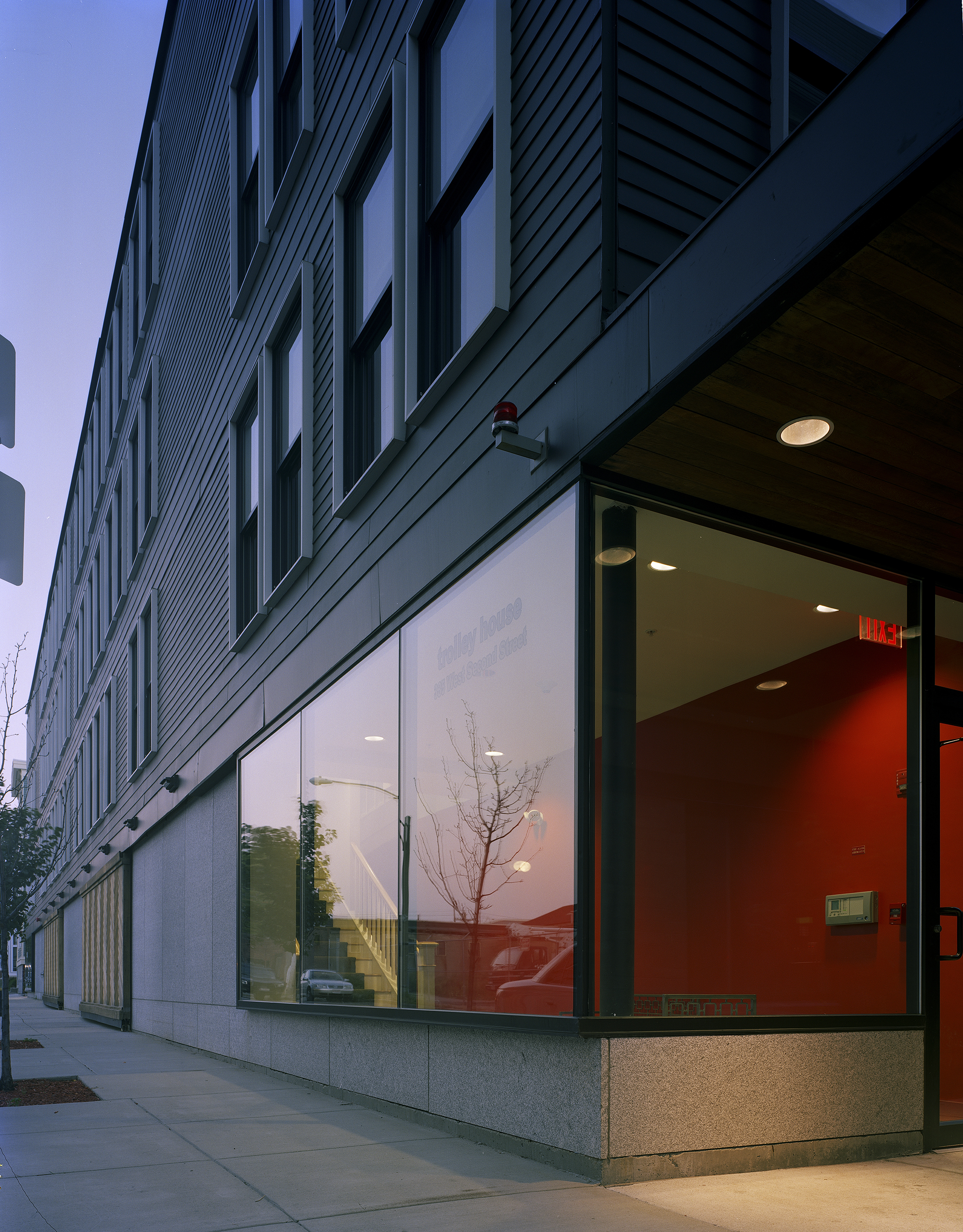 The Trolley House is a 24-unit condominium building located in South Boston on the boundary between the traditional working class residential neighborhood and an industrial area. David Neilson developed the conceptual building plans and unit types, which Utile refined in collaboration with David after the schematic design phase. The building has structured parking and two lobby entrances at street level topped by three levels of units organized around a central courtyard.