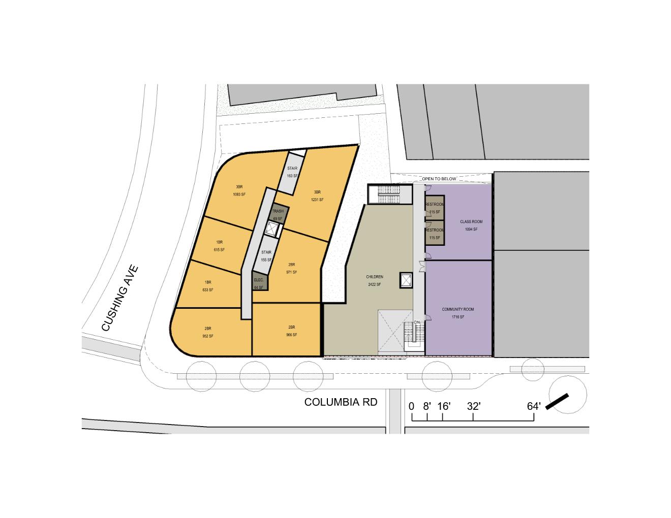 The study tested several development scenarios for the parcels: a stand-alone library, a parcel subdivision for side-by-side library and housing, and a library as a ground floor tenant of a larger residential building. Each scenario included a cost estimate and development metrics to support the City’s land disposition in a public RFP.