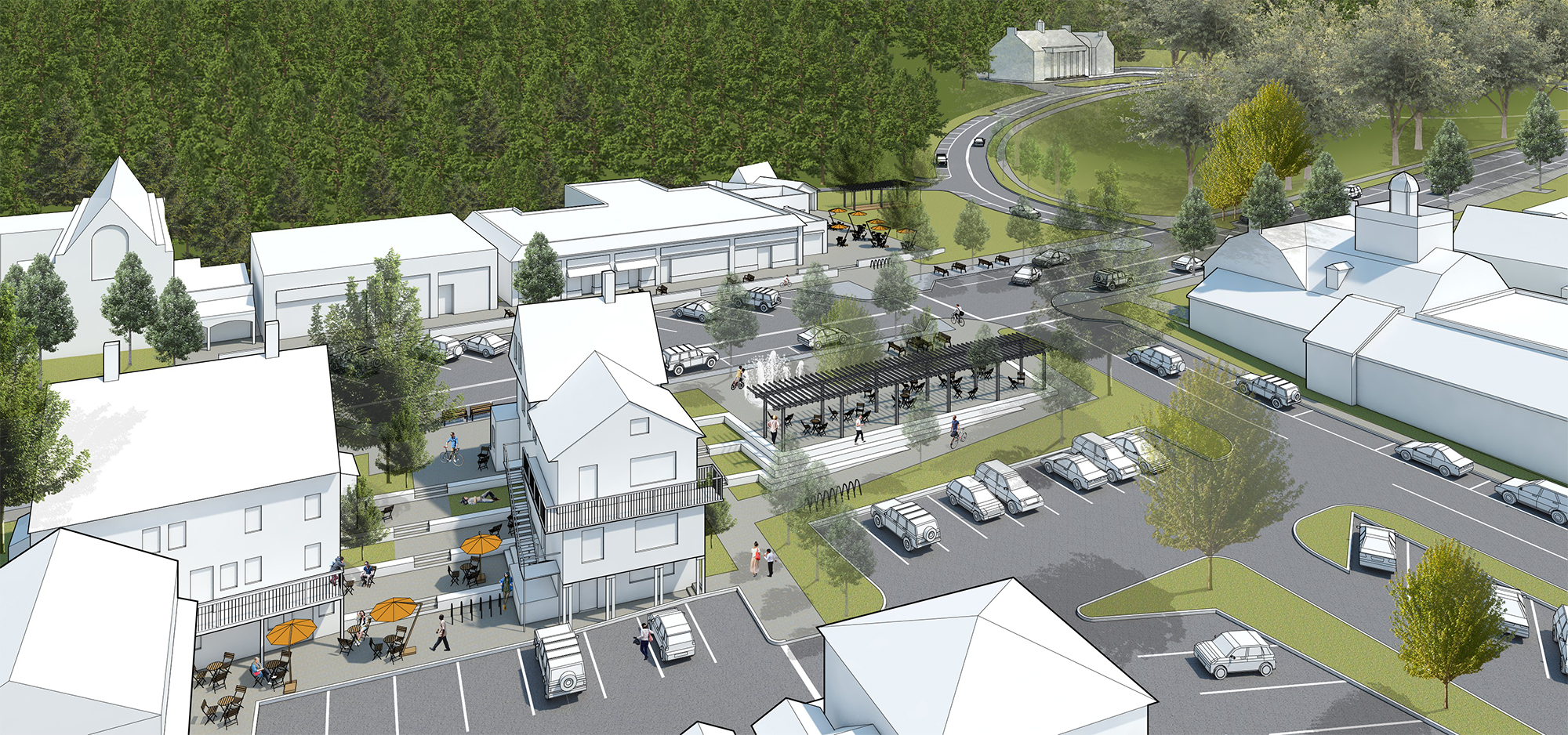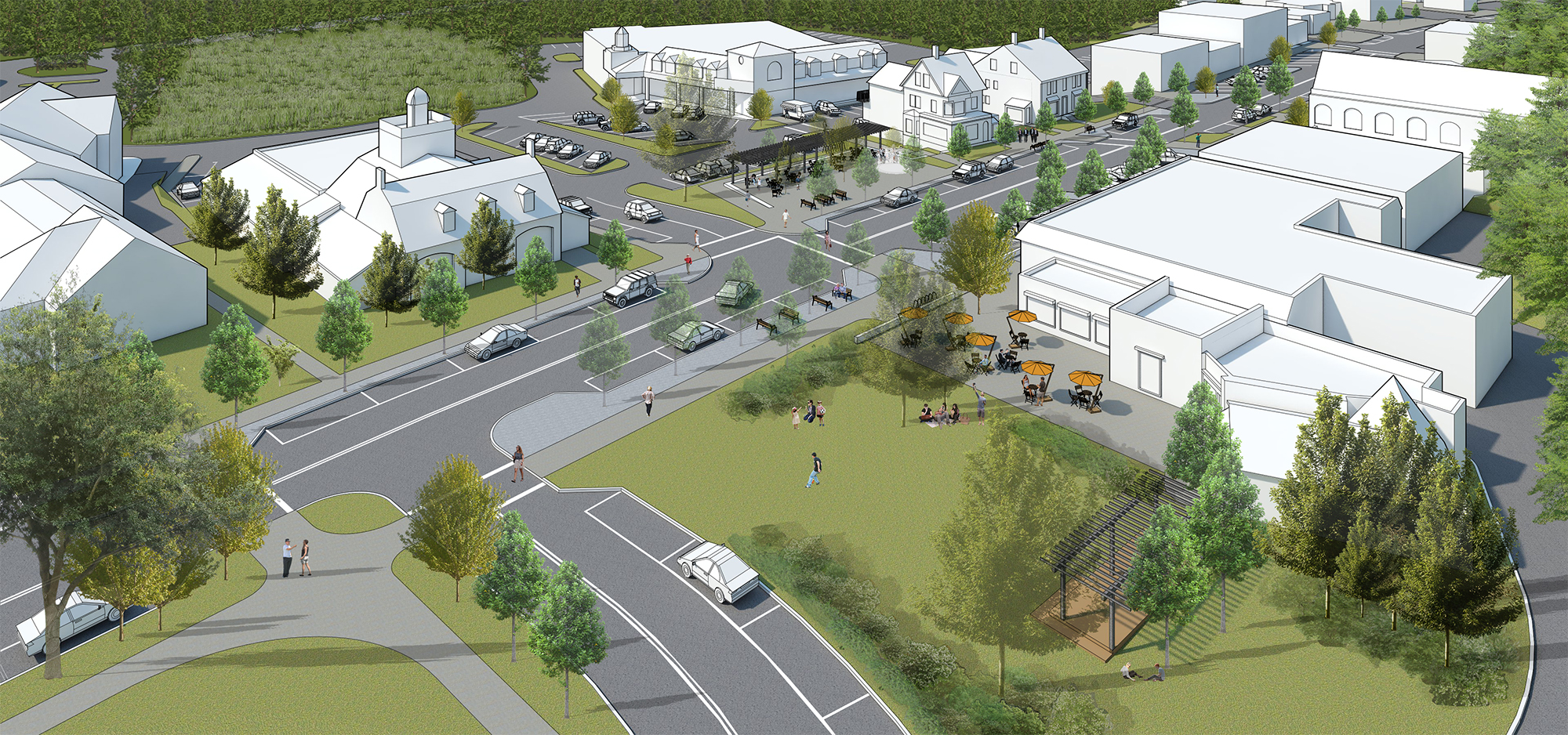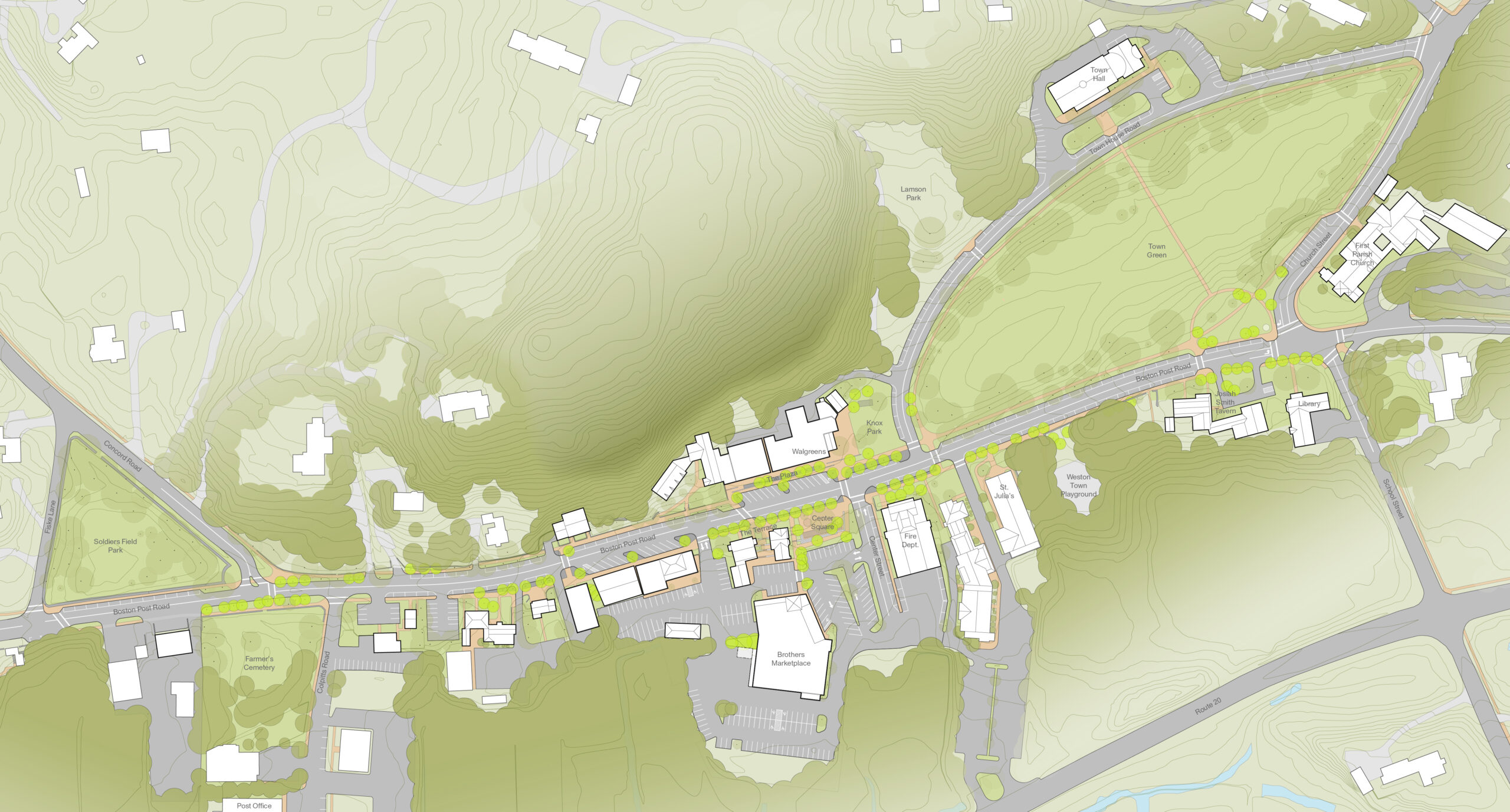 While the design begins with the public right-of-way, the overall approach addresses important recommendations surrounding larger issues related to character and placemaking in an effort to re-establish the Town Center as the heart of civic life in Weston. Through relatively few strategic moves, the design is not only able to improve functionality, but also creates a public open space network that complements the original landscape design by the famous Arthur Schurcliff more than a century ago. The design reclaims excess pavement to create three new open spaces, each with an individual character, which will allow for a wider variety of activity and events to take place that would otherwise not be possible, all without compromising the supply of parking for local businesses. Altogether, the design aims to achieve a more village-like scale that will make Weston Town Center a more cohesive and beautifully-designed environment for people to enjoy, allowing businesses to thrive.