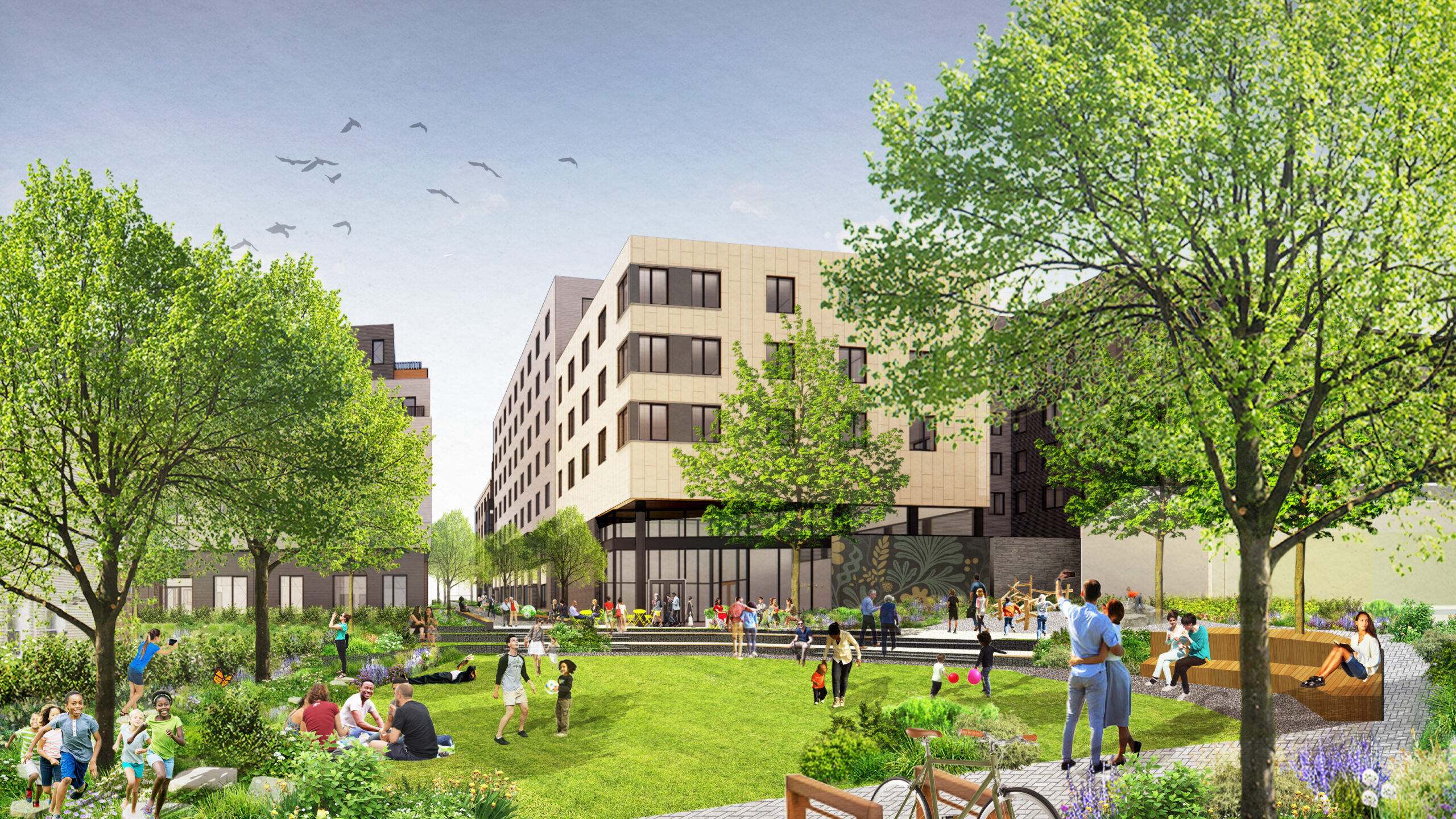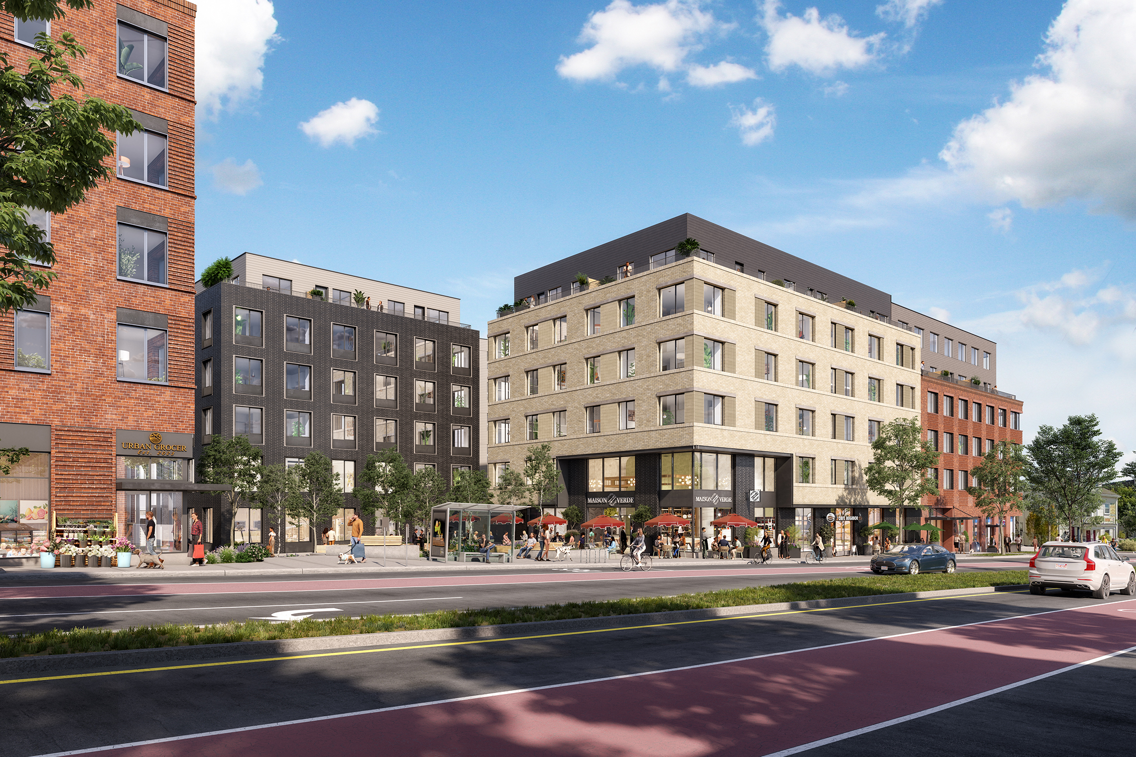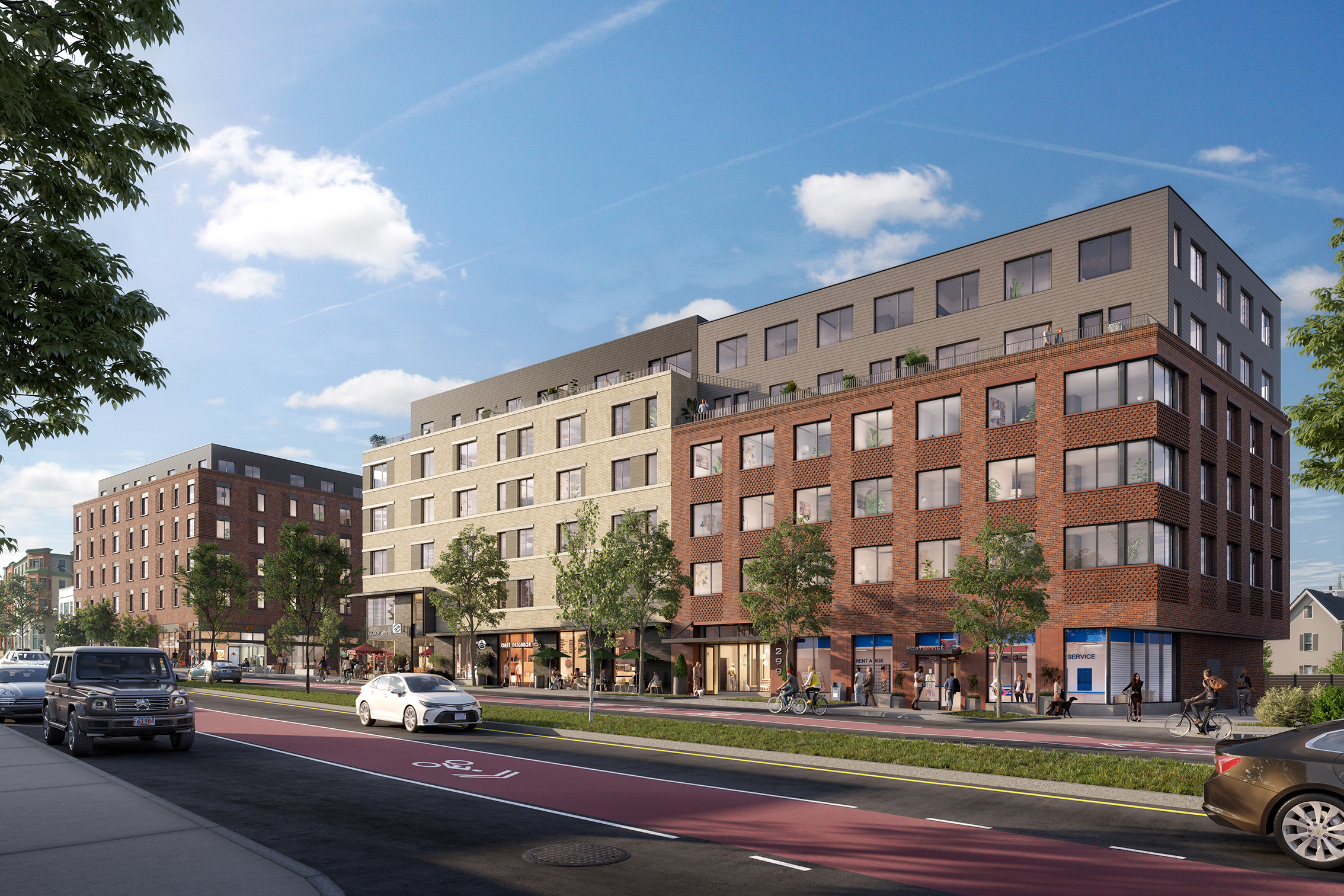 The buildings have received design certification for PHIUS, in line with the City of Somerville’s progressive sustainability goals. The architecture of each building will be intentionally unique, with massing, material, and fenestration strategies that will break down the scale of the buildings. Ground floor spaces will feature glass storefronts that will enliven the pedestrian experience along Broadway and Temple streets and within the civic plaza.