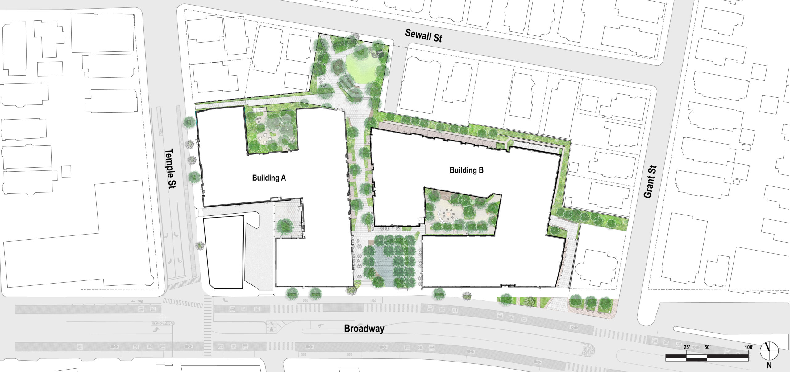 The two buildings frame Broadway and define a new civic space between the buildings, envisioned as a vibrant public plaza with trees, planting islands that define circulation and gathering space, built-in civic furniture, and retail cafe zones for the retail spaces flanking the plaza. The six-story buildings create a strong street wall along Broadway with retail spaces and a residential entrance lobby for Building B. Temple Street is activated with retail space and the residential entrance lobby for Building A. The buildings step down to the north-facing Sewell Street, with four-story massings that mediate the scalar change between the Broadway thoroughfare and the neighborhood scale of Sewell, Temple, and Grant Streets.