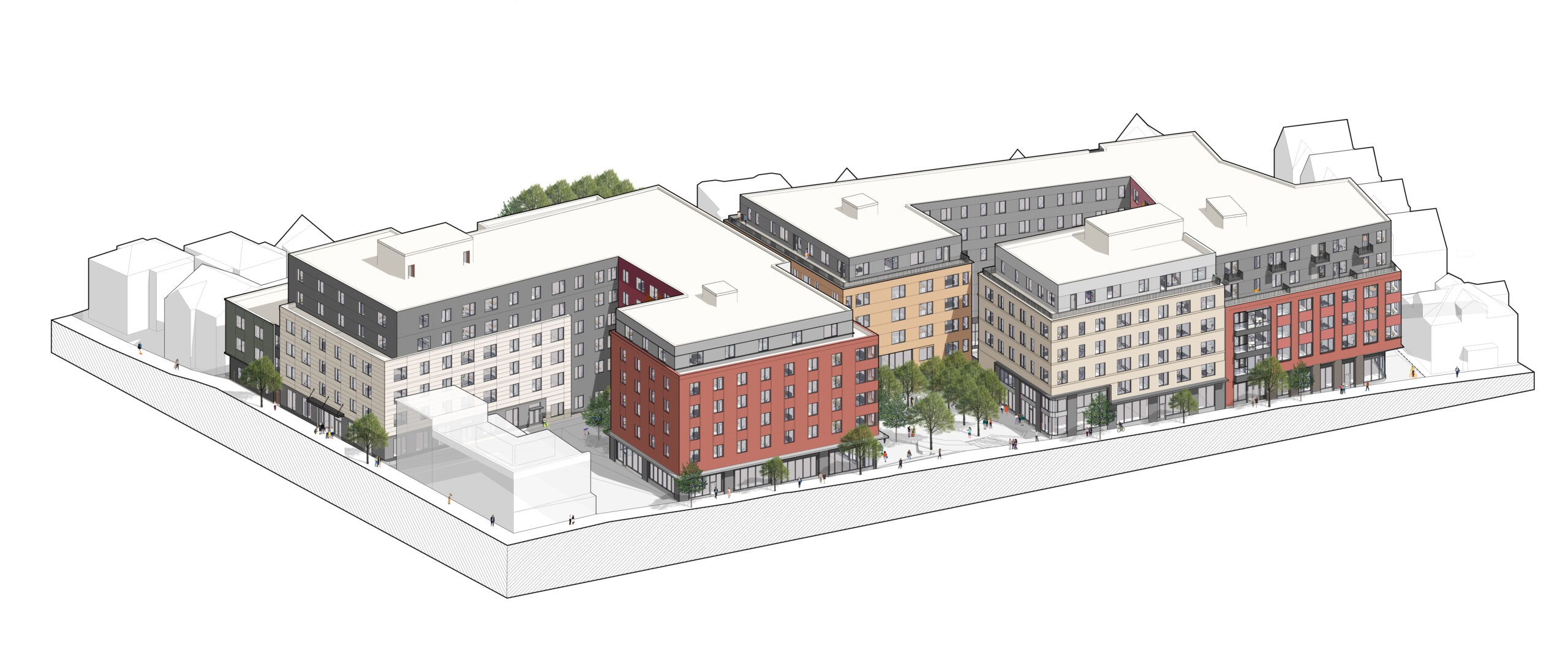 The proposed project at 299 Broadway will transform a long-neglected stretch of Broadway in the Winter Hill neighborhood of Somerville into a vibrant block providing residential housing units, retail space, a community room, and significant improvements to the public realm. The project is anchored by two six-story mixed-use buildings and a central civic plaza along Broadway and a revitalized neighborhood park on Sewall Street. The approximately 300,000 GSF buildings will provide 240,000 net SF of residential, with 48% affordable rental and 52% market-rate rental. The affordable units will range from one-bedroom units to three-bedroom units, and the market-rate units will range from studios to three-bedroom units, with a total of 320 units across the site. The project provides 13,650 SF of retail space for a range of local and regional retailers, and a 3,000 SF community room that will be available to reserve for community groups.