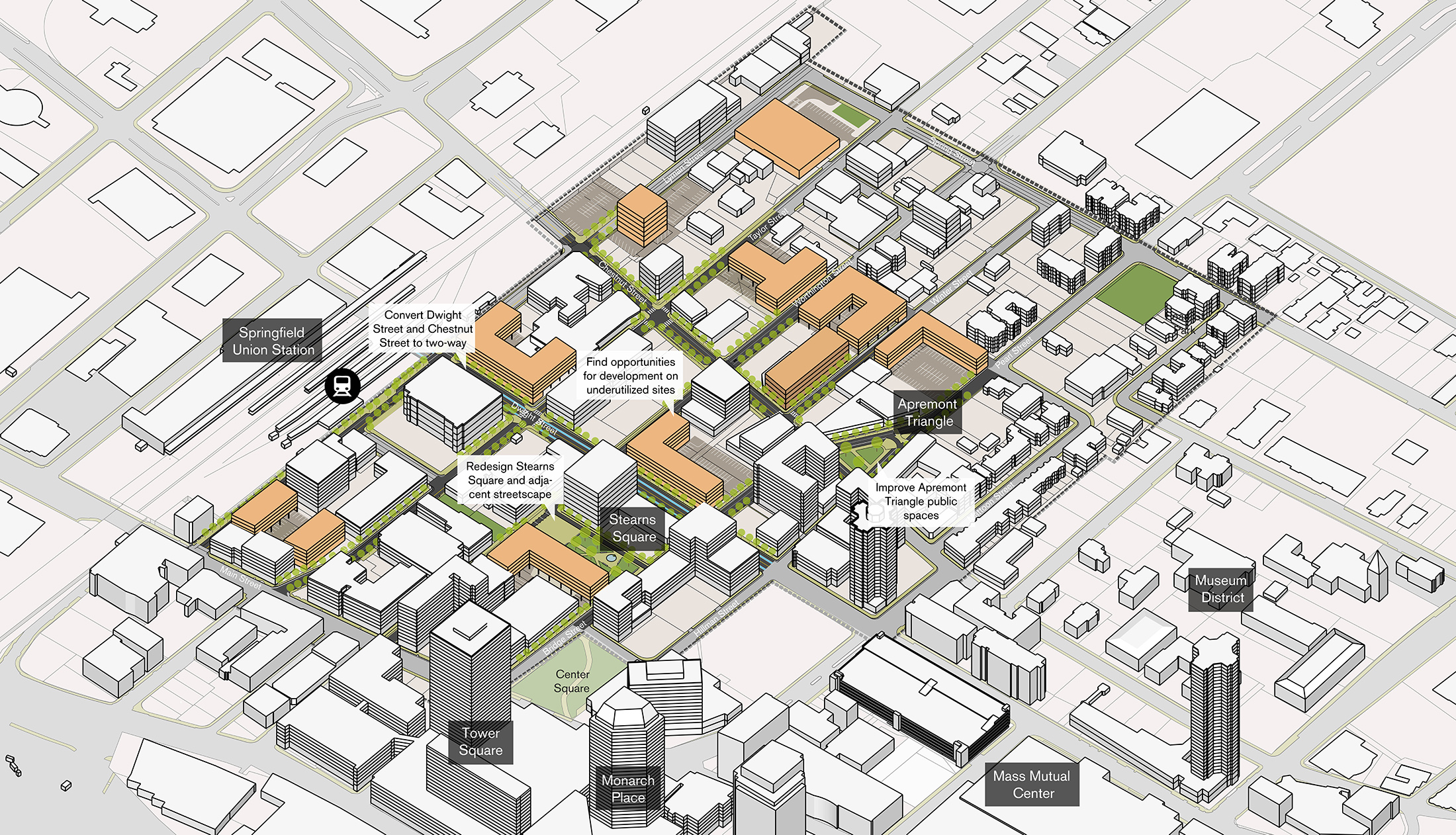 Utile worked with Ninigret Partners and NelsonNygaard to develop a neighborhood strategy for Springfield, Massachusetts, after a set of downtown city blocks were destroyed following a gas explosion. Using that event as an opportunity to envision a broader redevelopment for the neighborhood during the process of rebuilding, Utile envisioned a series of strategic public space interventions, including the redevelopment of a square that had fallen into disrepair. NelsonNygaard developed typologies of streets to replace the underutilized arterials running through the district. Utile and Ninigret Partners also came up with reuse scenarios for housing, hotels, and innovation incubator spaces that could both be financially viable, attractive to the public realm, and poised to capture increased traffic from the growing innovation economy centered around the greater Boston metropolitan area.
