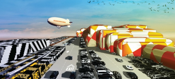 “The Roger Sherman Architecture/Urban Design (RSAUD) team designed a super-scaled, family-focused, all-season recreational park in the form of a tipped-over Empire State Building, with alternating levels of parking and other uses, for a 30-acre lot in Ronkonkoma serving a major Long Island Rail Road (LIRR) station and regional airport” (from the Long Island Index).