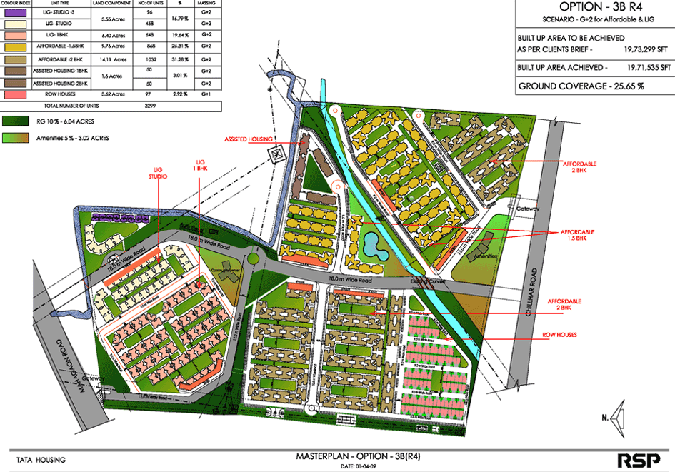 I am assuming that these are intended to be pre-fabricated since an auto maker is proposing the concept, although Tata is not advertising the mode of production. What I really find interesting about this particular venture is that a car company is trying to develop suburban housing typologies that when aggregated will create more demand for their cars. The master plan and aerial are in no way attempting to plug into any larger urban condition and notice the prominence of the garages in the renderings!