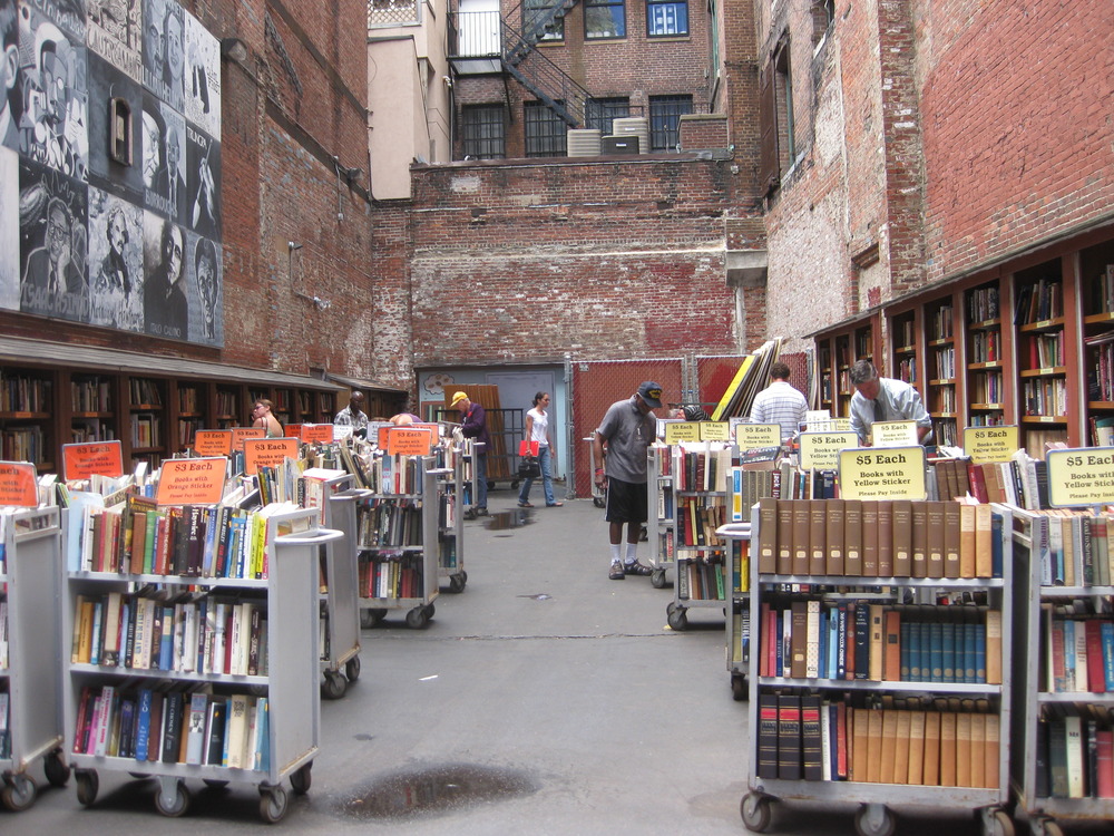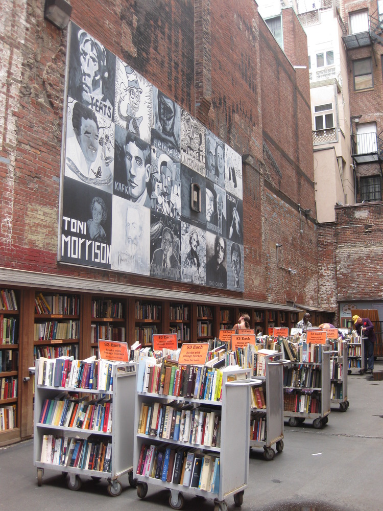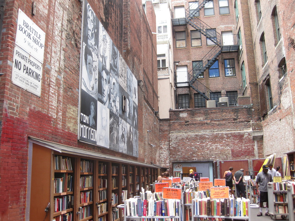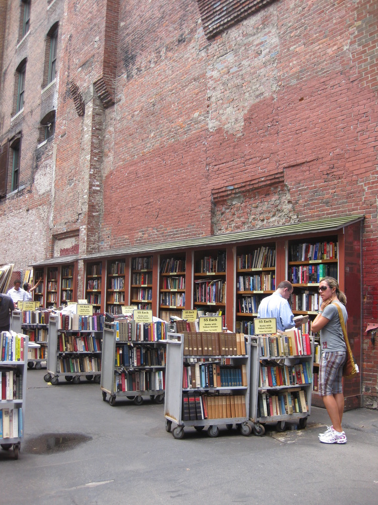 Walking back from lunch yesterday, I uncovered a seasonal pocket of retail activity just steps from the heart of Downtown Crossing…that was not Art Fridays. Rather, the Brattle Book Shop – somewhat of an endangered species of bookstore “type” and in operation since 1825 – has initiated a worthy takeover of the adjacent vacant lot. On quiet West Street, office workers on their lunch break browsed books, unable to resist the allure of shelves of hardcovers and piles of paperbacks. Why is this particular space so compelling? As a temporary urban intervention, the “liner” of books that envelops the lot successfully brings the adjacent party walls down to a more human scale. The wall mural, the hodgepodge of buildings facades, and the requisite fire escape backdrop, transform this outdoor “room” – just steps from the Public Garden – into a delightful urban niche where one can seek refuge from the summertime heat. In spite of thoughtful streetscape planning, sometimes its unplanned urban moments like these which are the best.